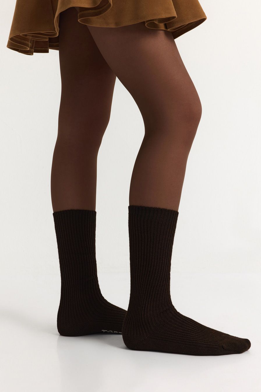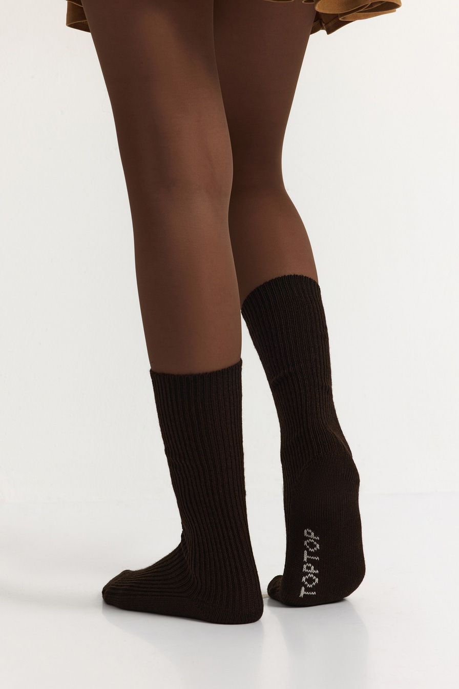 Высокие носки из смесовой шерсти в крупный рубчик – модель коричневого цвета. Нижняя часть следа декорирована контрастным логотипом бренда.
