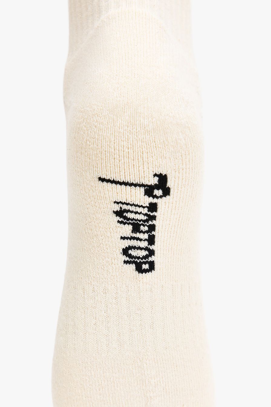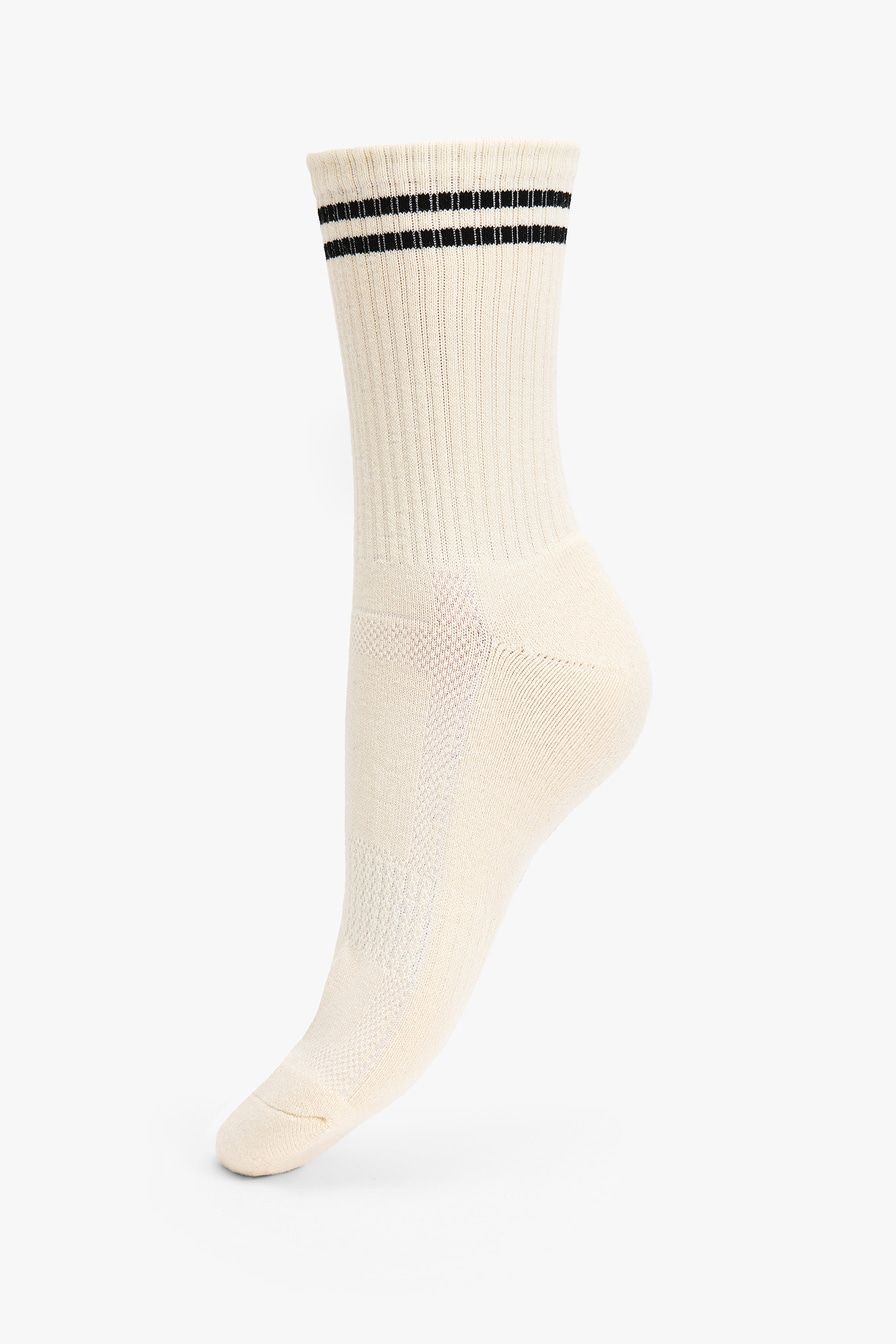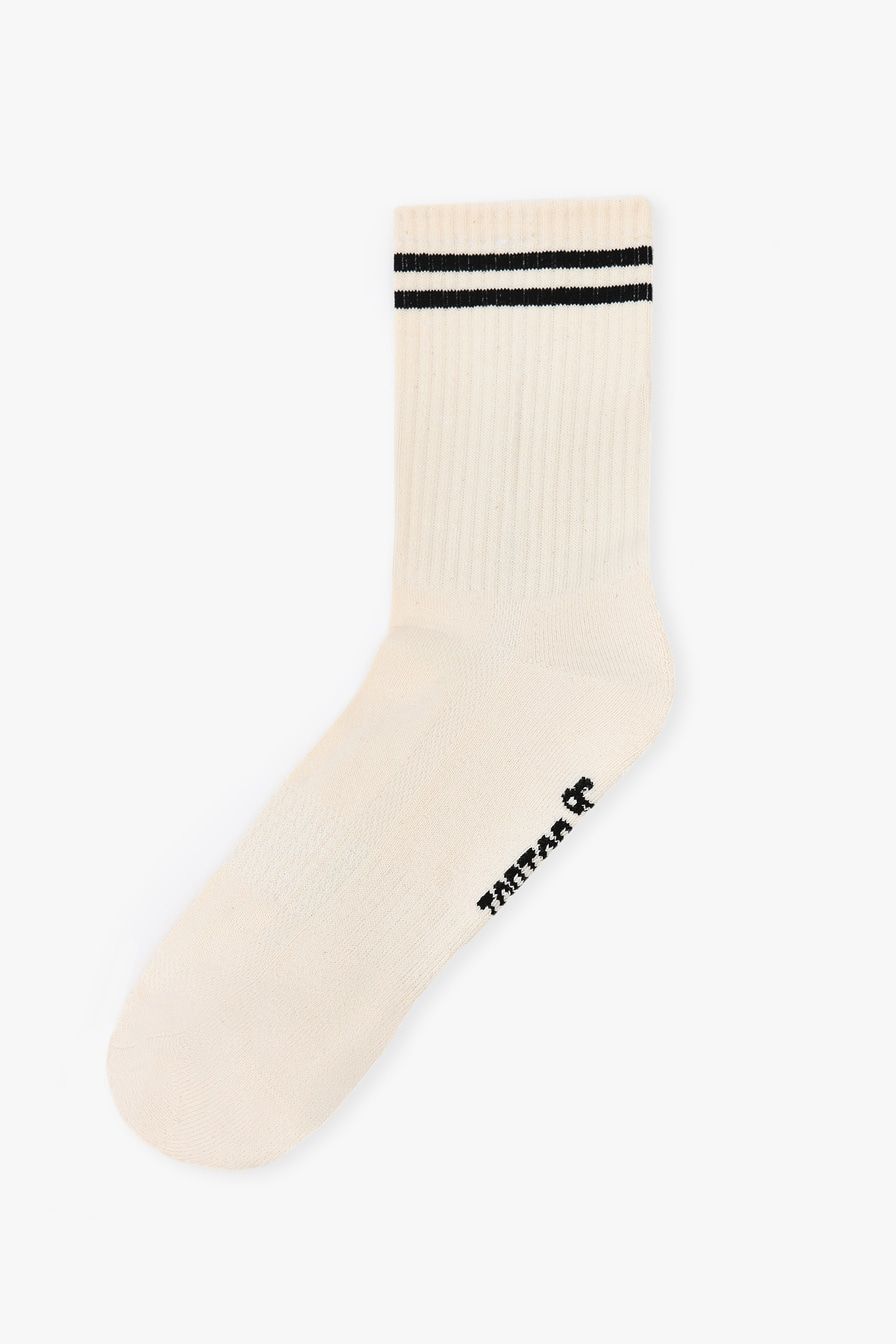 Высокие носки молочного оттенка из мягкого смесового хлопка. Пяточная и носочная части дополнены плюшевой вставкой, которая обеспечивает максимальный комфорт. Носки декорированы контрастными полосками и логотипом.