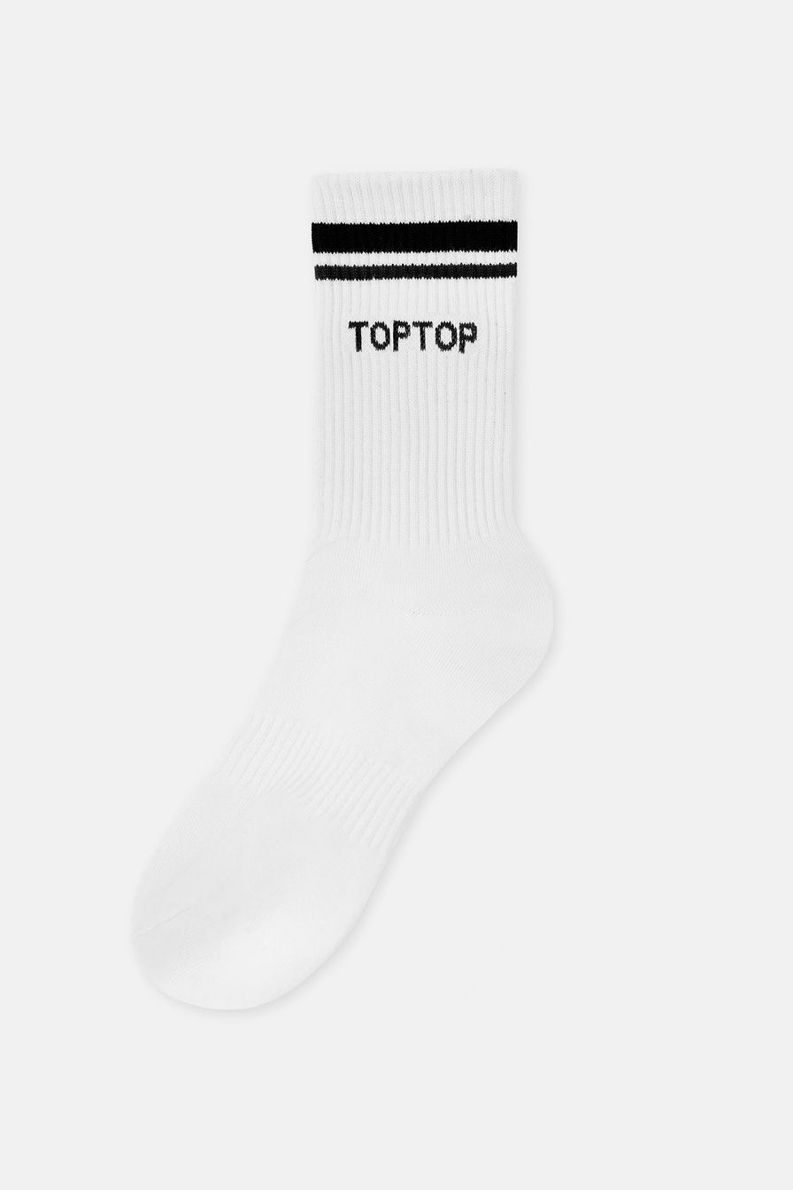 Классические спортивные носки из смесового хлопка – модель белого цвета с контрастными полосками и принтом-логотипом. Паголенок и стопа дополнены резинками, которые обеспечивают надежную фиксацию.