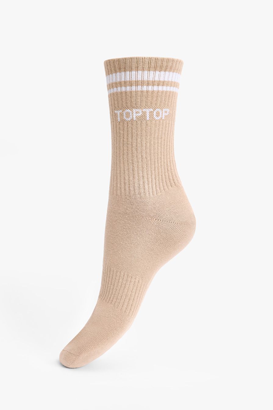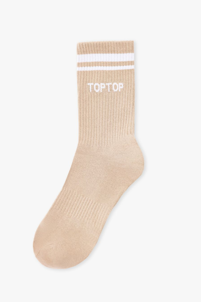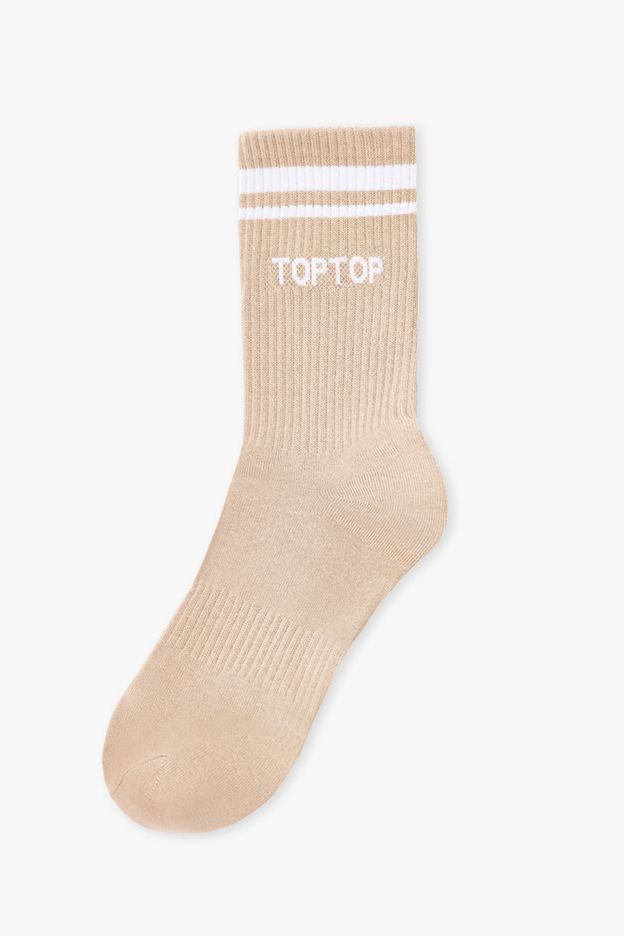 Классические спортивные носки из смесового хлопка – модель насыщенного бежевого цвета с контрастными полосками и принтом-логотипом. Паголенок и стопа дополнены резинками, которые обеспечивают надежную фиксацию.
