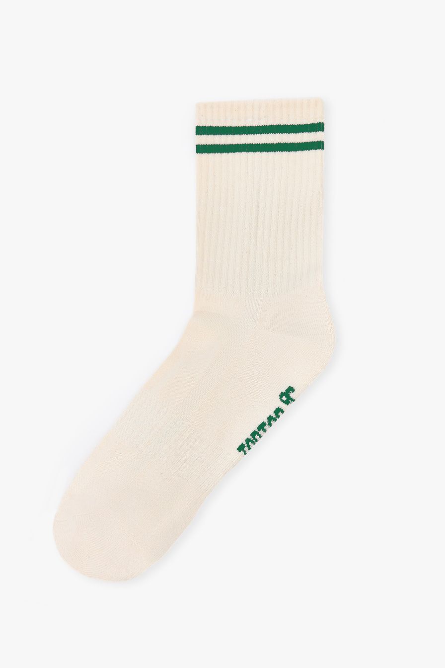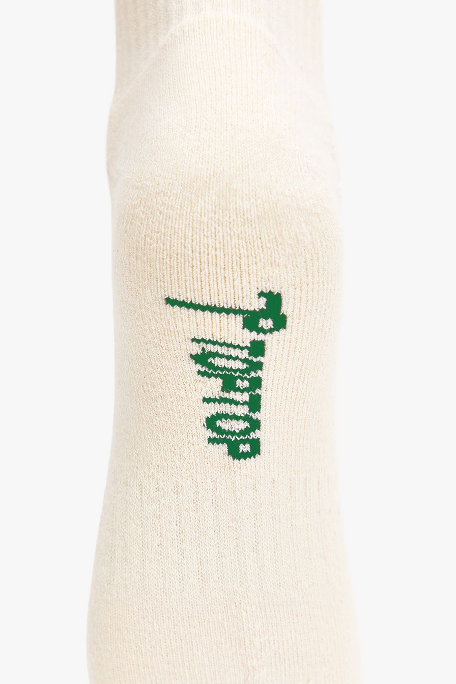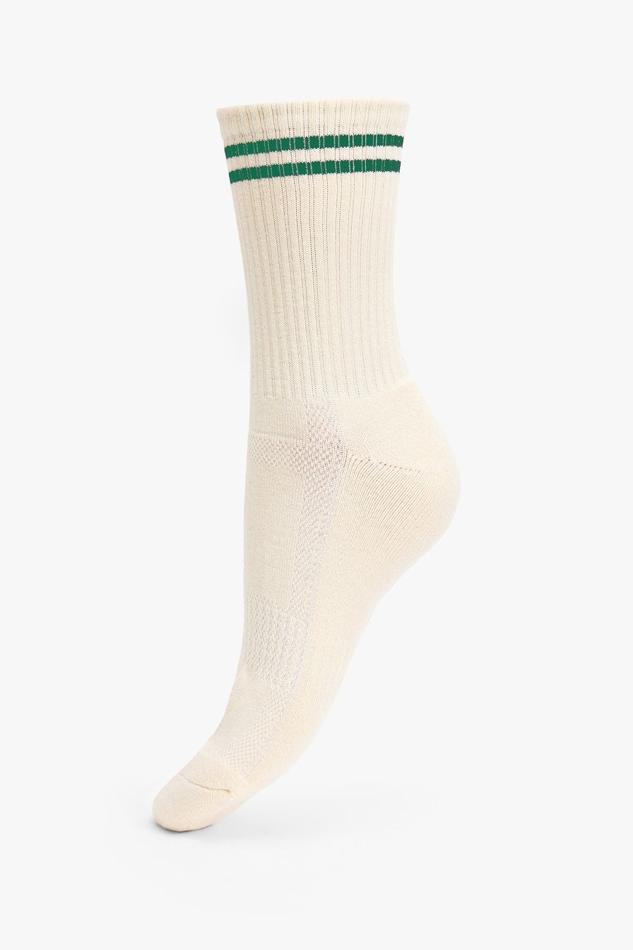Высокие носки светлого бежевого оттенка из мягкого смесового хлопка. Пяточная и носочная части дополнены плюшевой вставкой, которая обеспечивает максимальный комфорт. Носки декорированы контрастными полосками и логотипом.