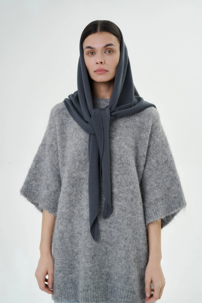 Косынка графитового цвета выполнена из шерсти и акрила.