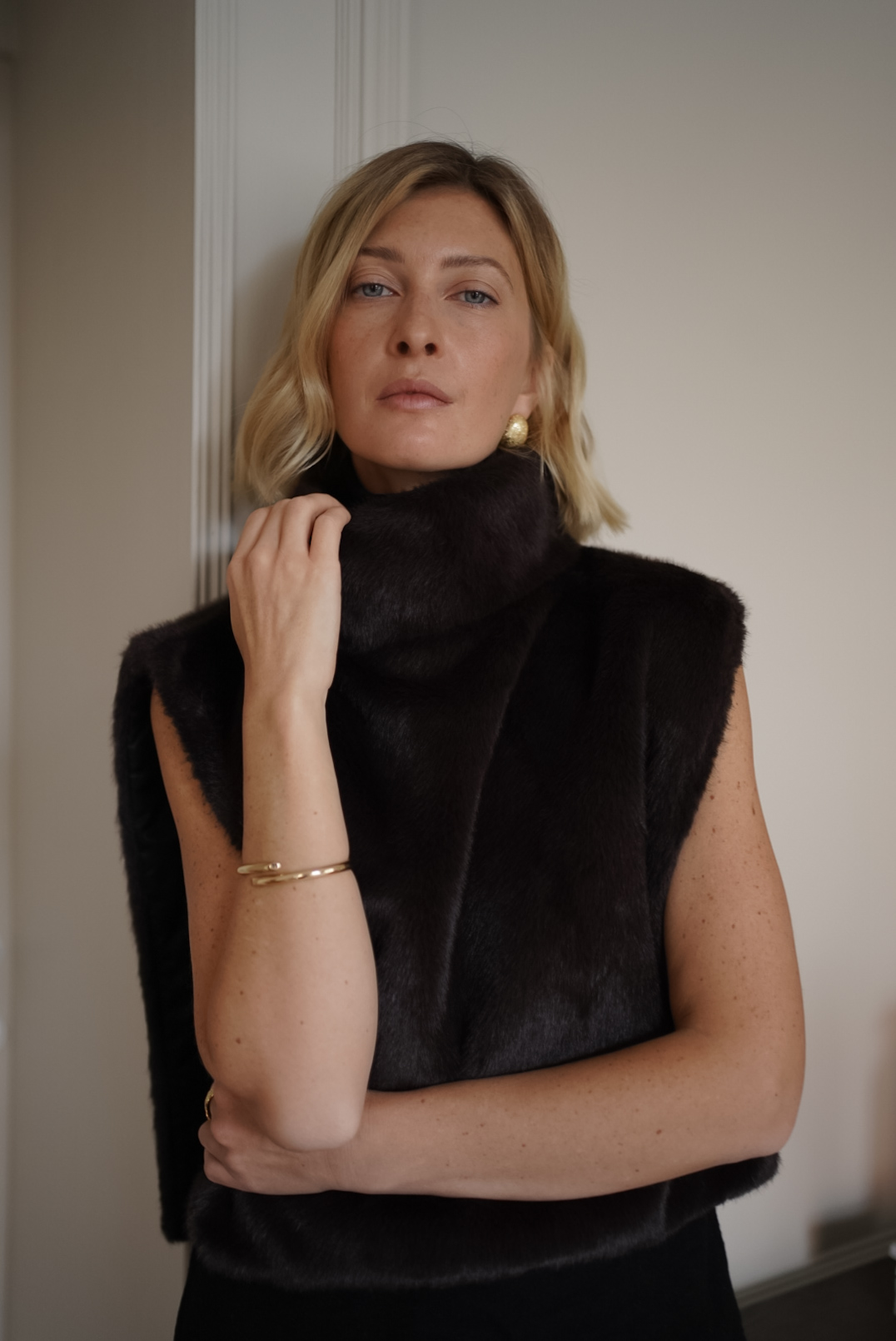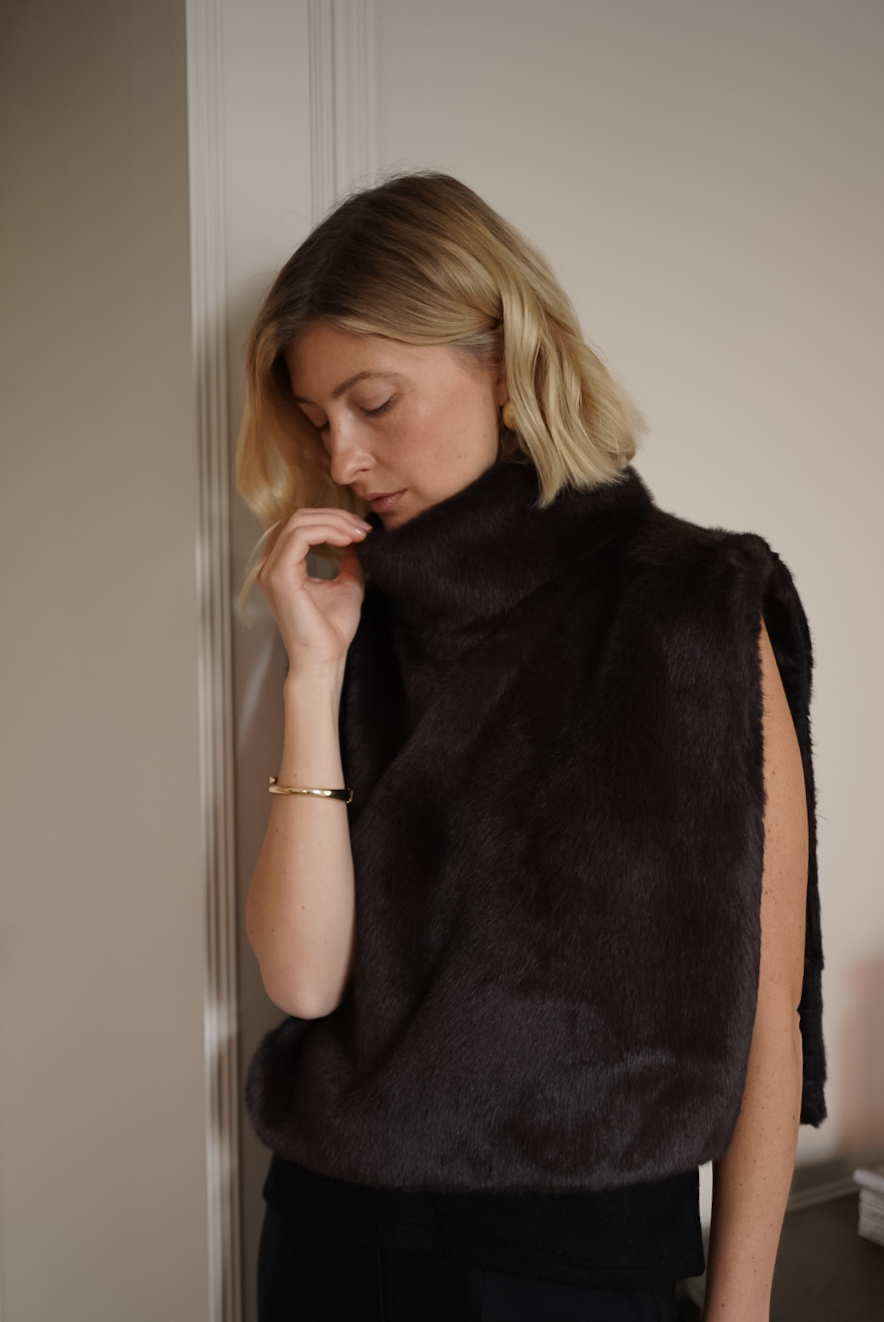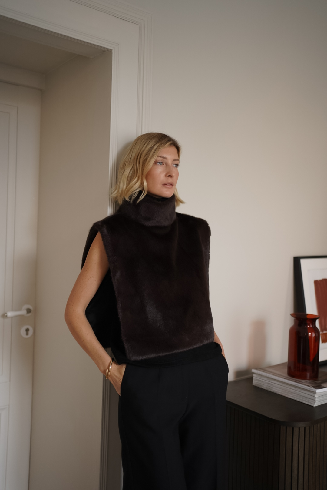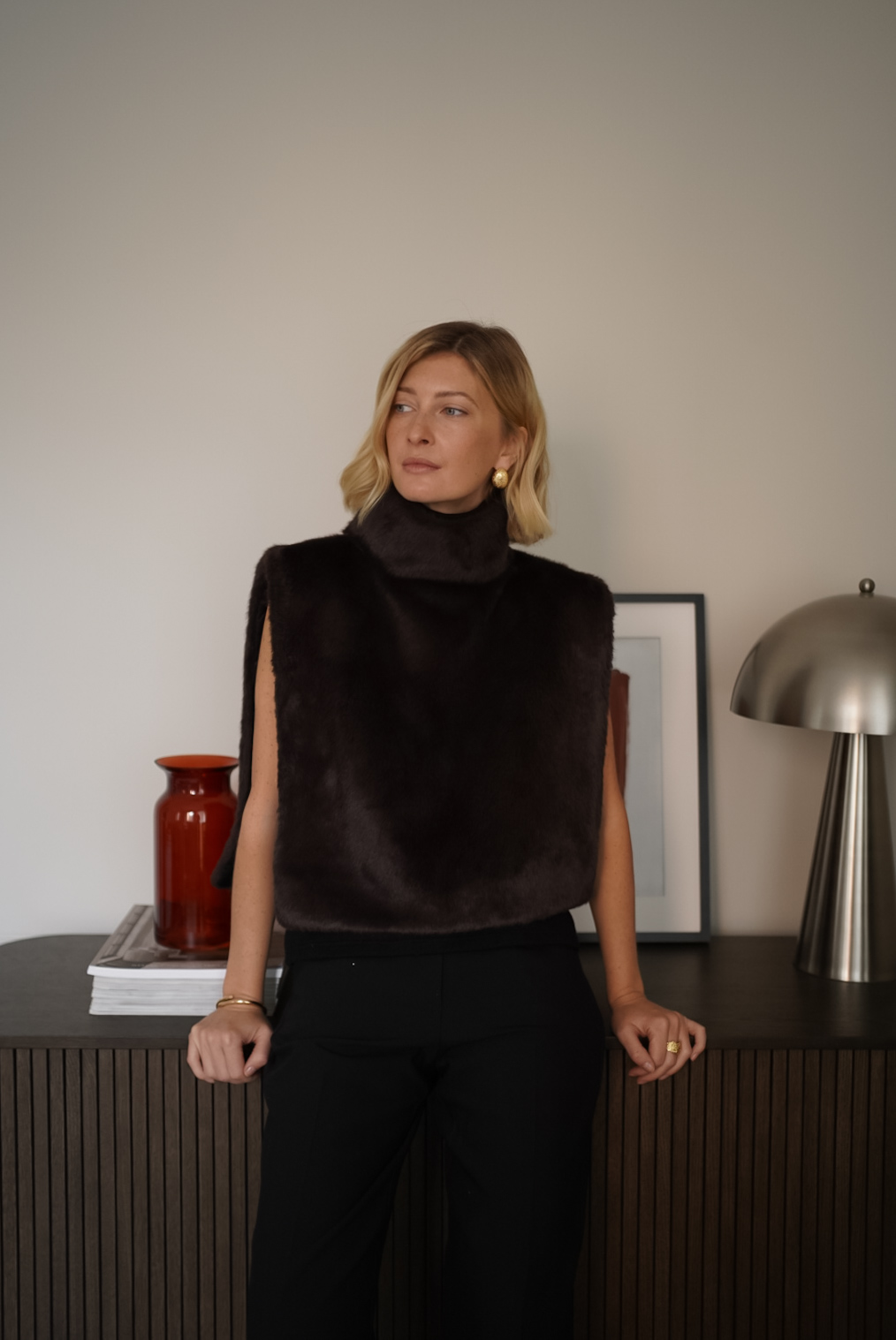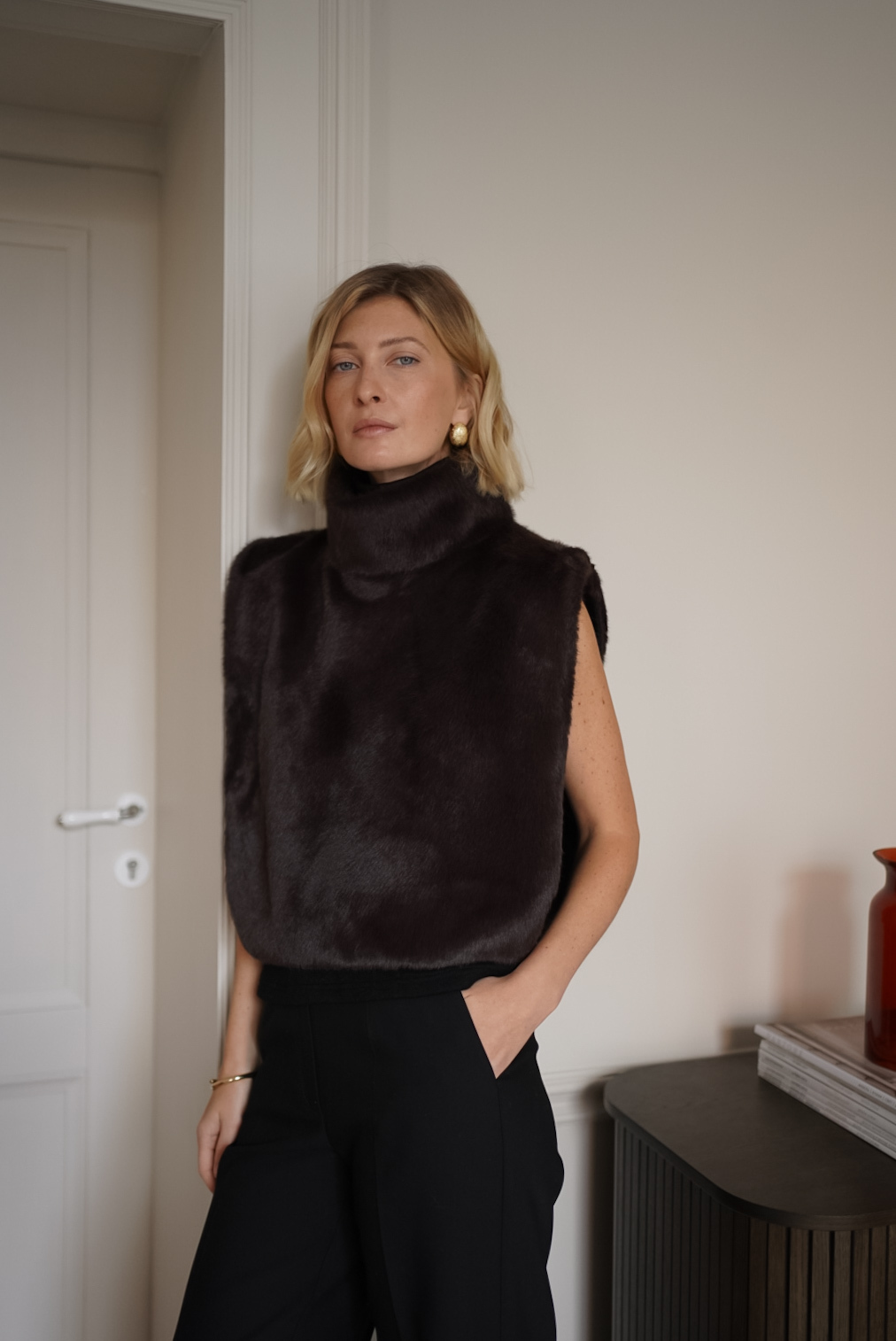 Манишка из эко-меха в коричневом оттенке поможет создать не только стильный, но и теплый образ в холодное время года.