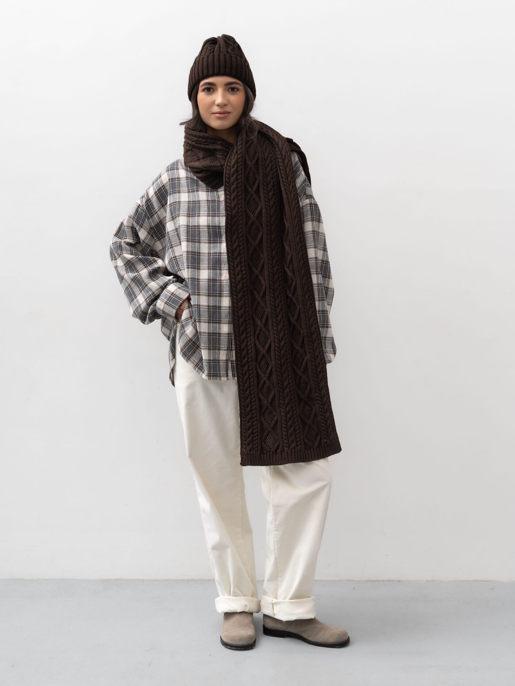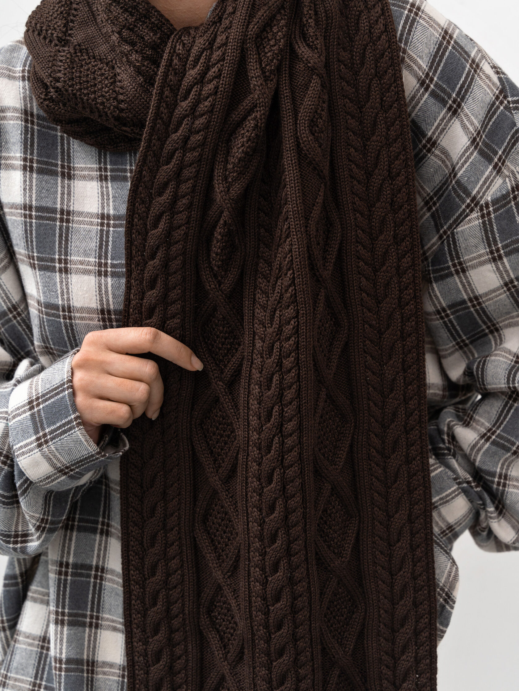 Объемный коричневый шарф с выразительным узором – зимняя классика, которая не только греет, но и добавляет фактуры образу. Мягкий и теплый, он красиво драпируется и подходит как к верхней одежде, так и к пиджакам и трикотажу. Идеальная деталь для уютных зимних нарядов.