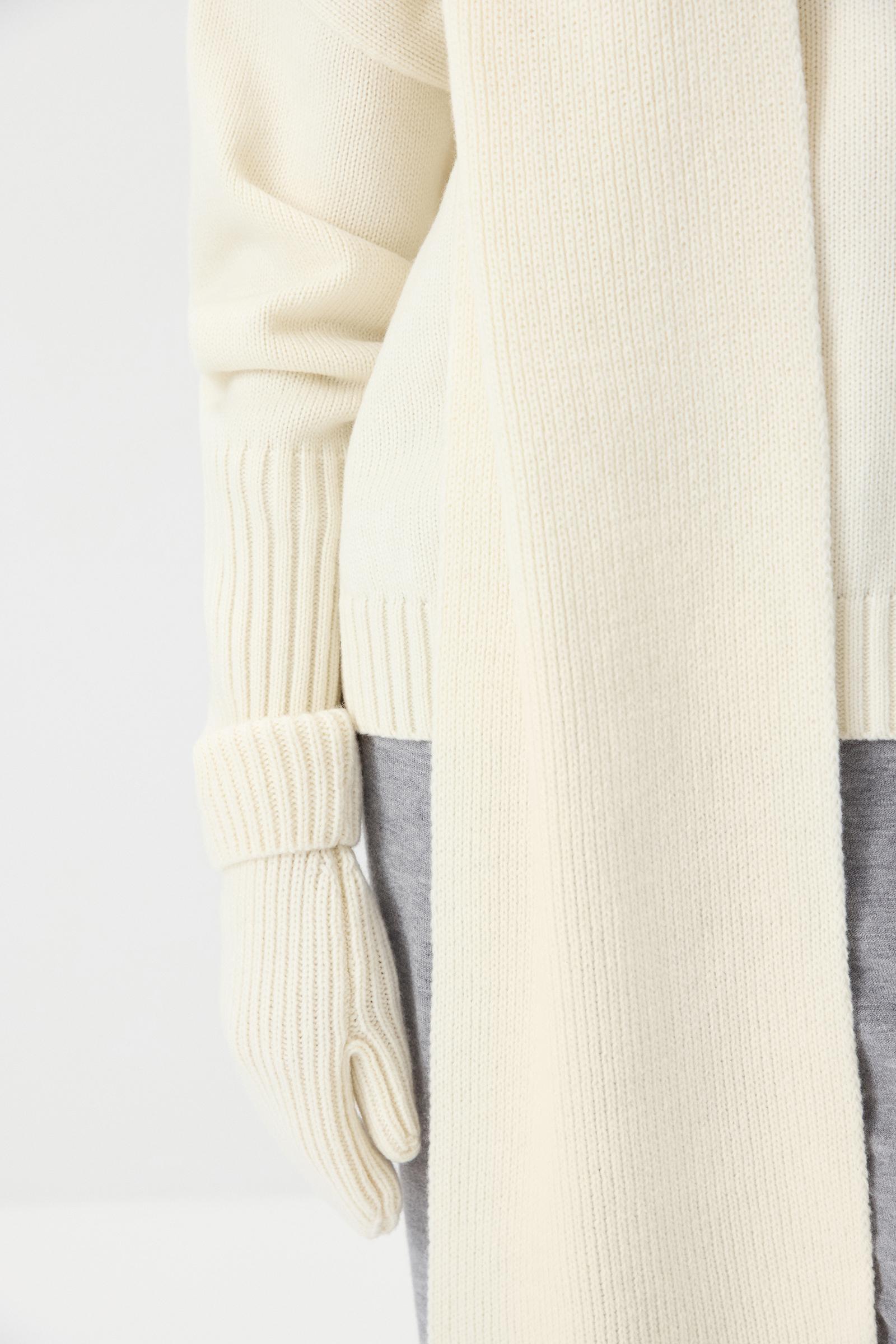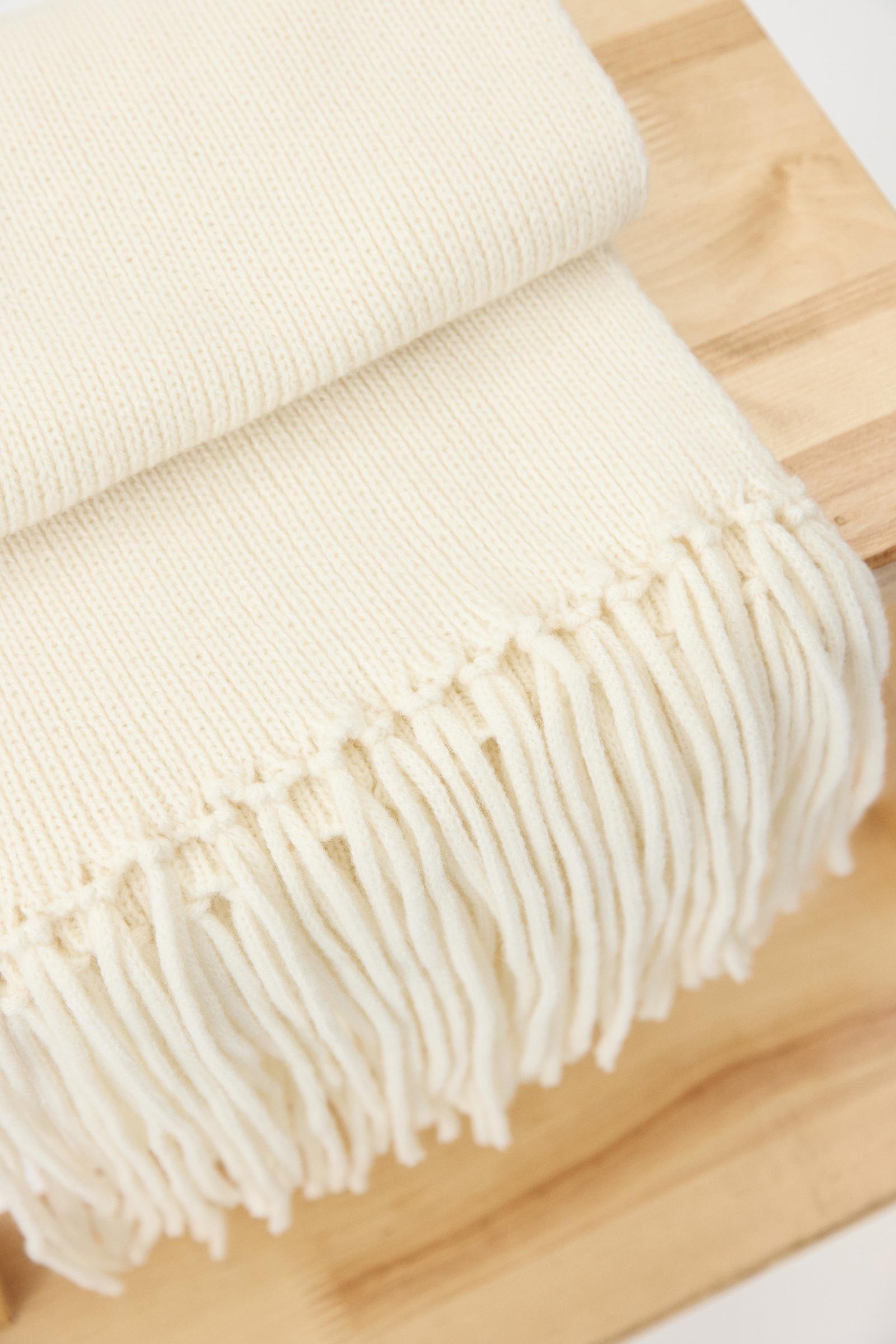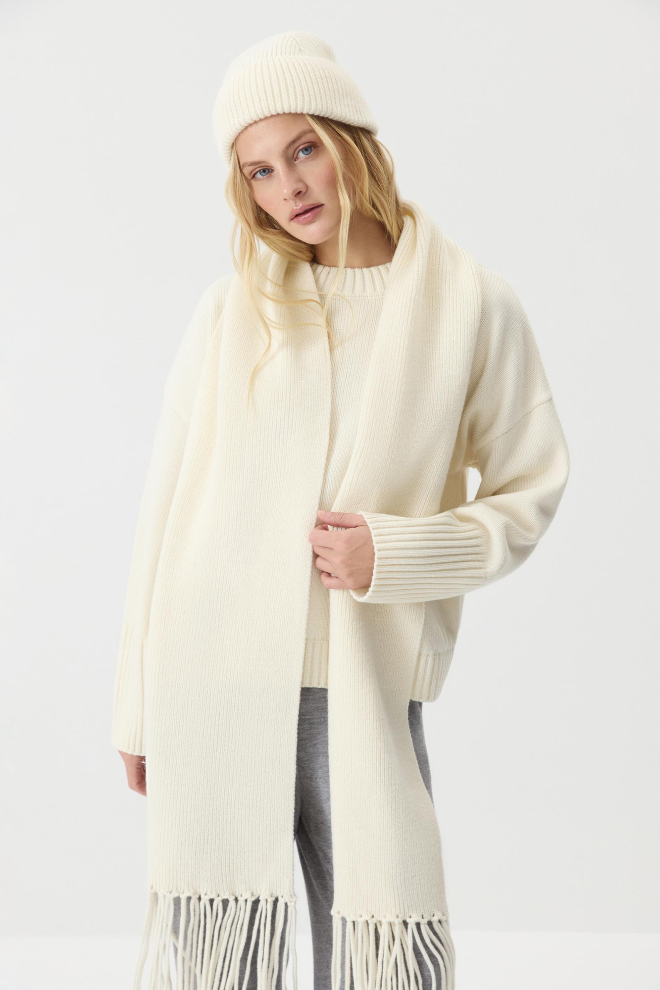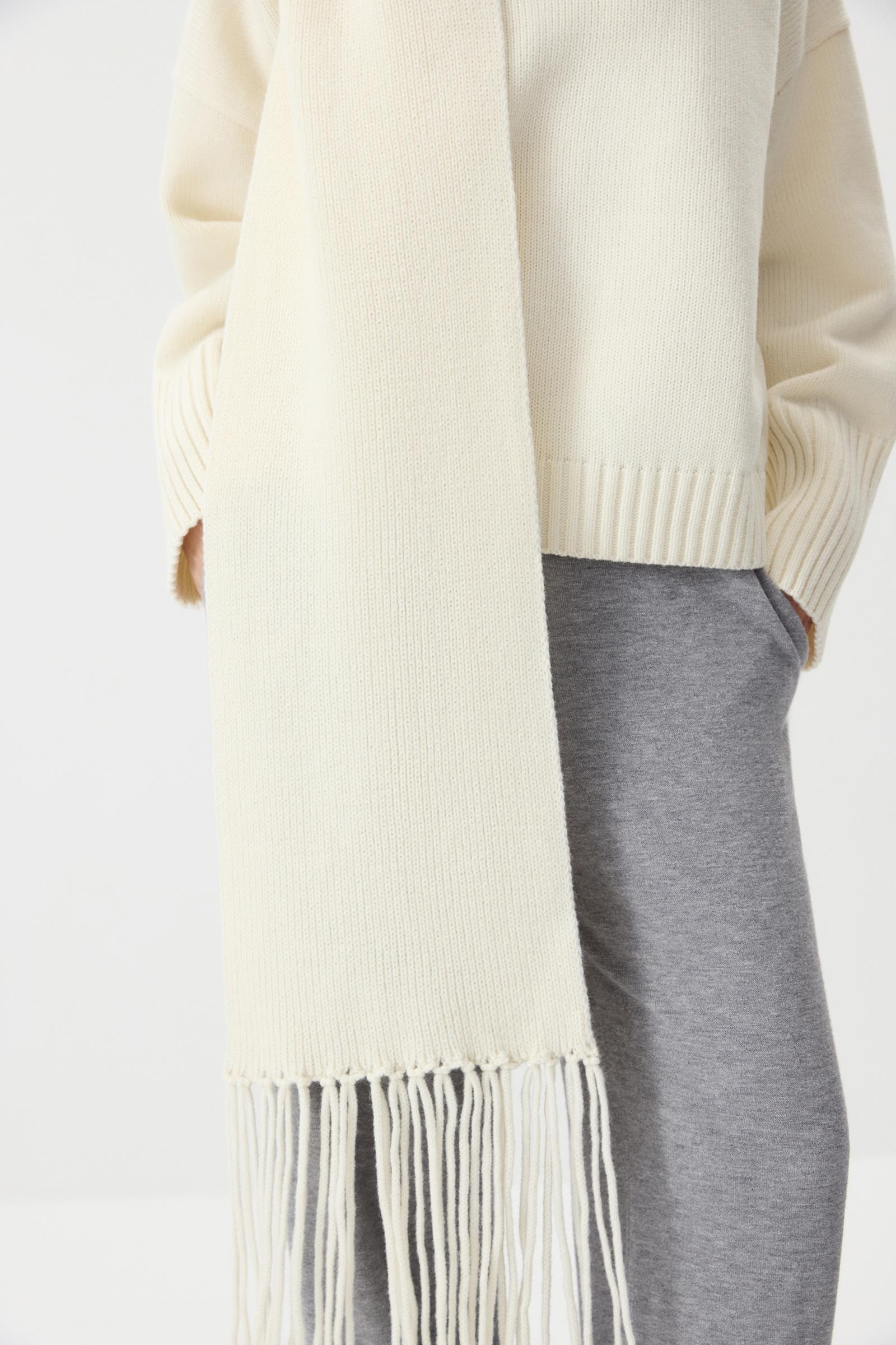 Длинный и теплый шарф, связанный из мягкой шерсти мериноса. Вы можете не только обернуть его вокруг шеи, но и накинуть поверх пальто: образ получится расслабленным и комфортным, благодаря длинной густой бахроме.