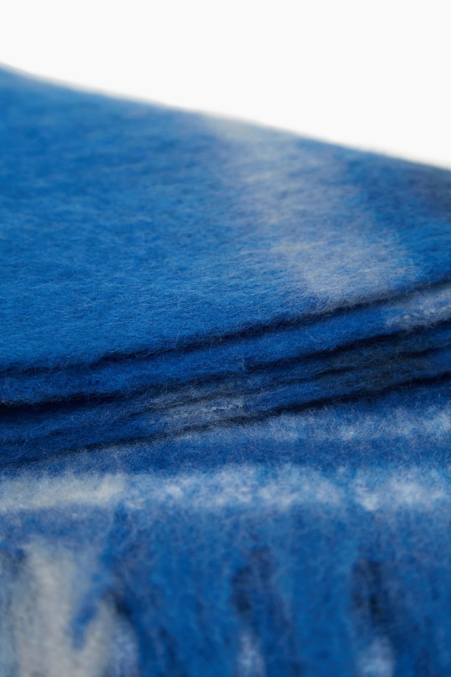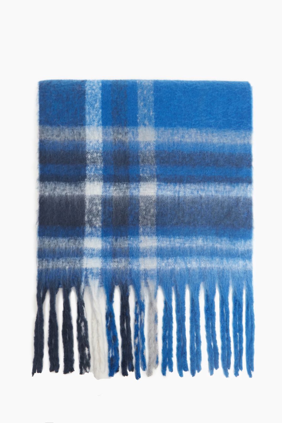 Длинный широкий шарф из смесовой пряжи декорирован принтом «полоска» и кисточками.