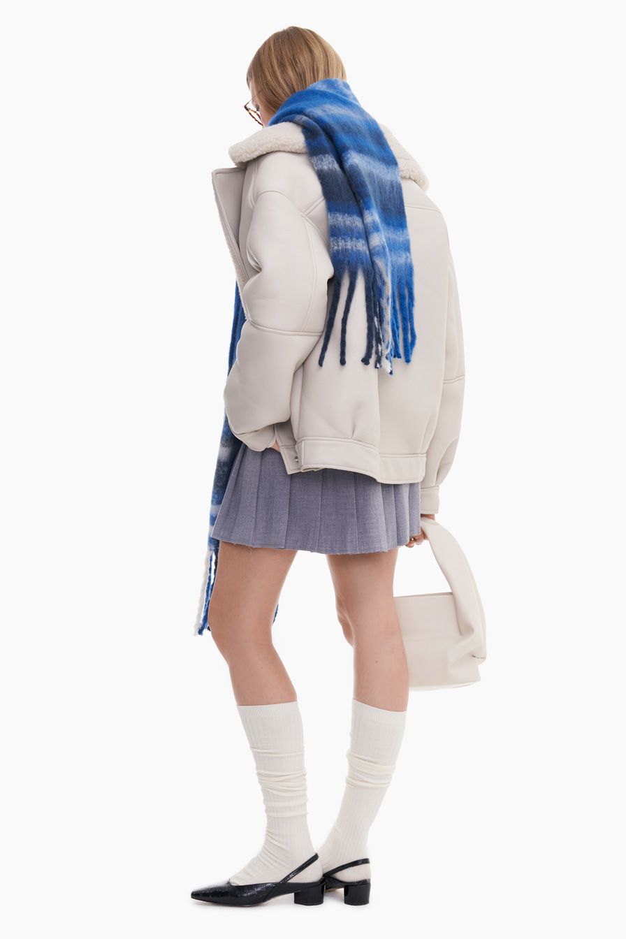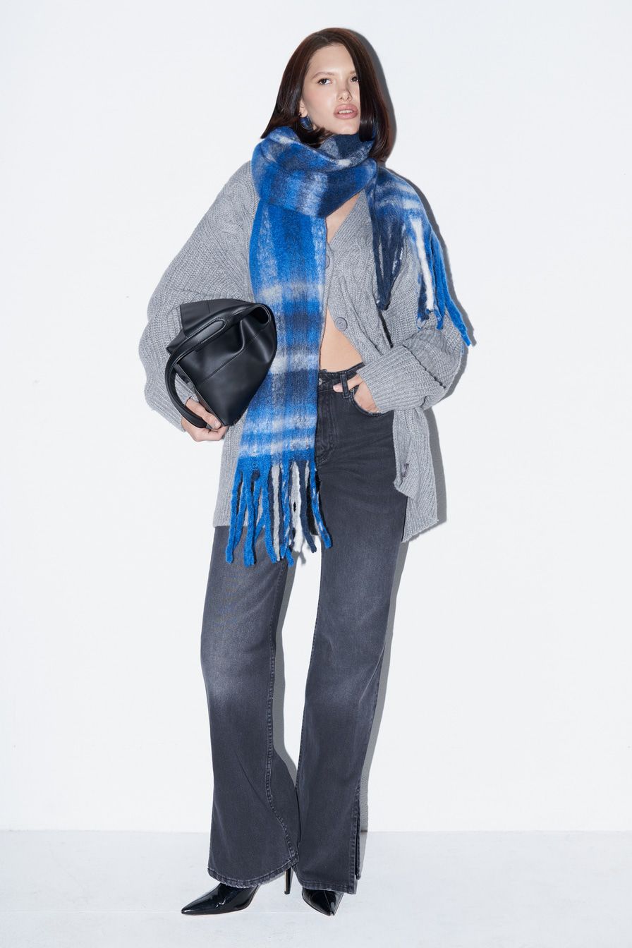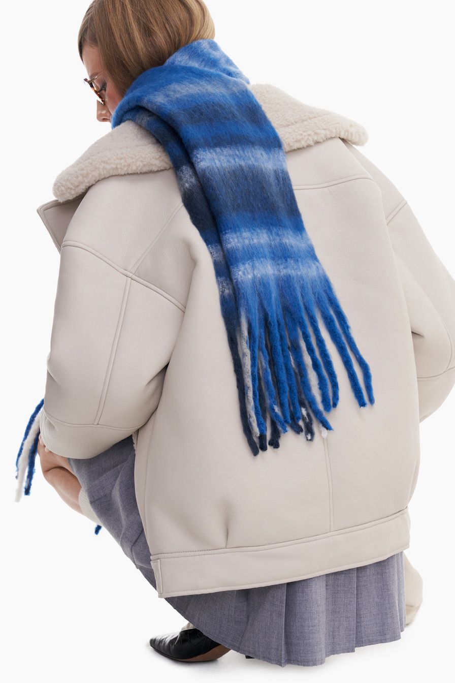 «Для повседневного лука сочетайте шарф с дубленкой, шерстяным джемпером, зауженными книзу джинсами и ботинками на скошенном каблуке».