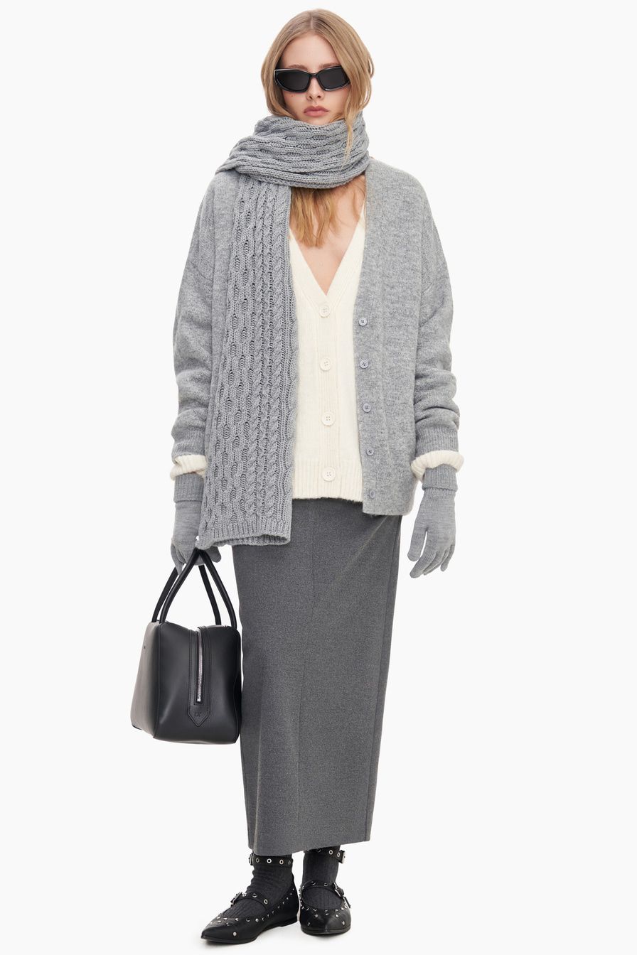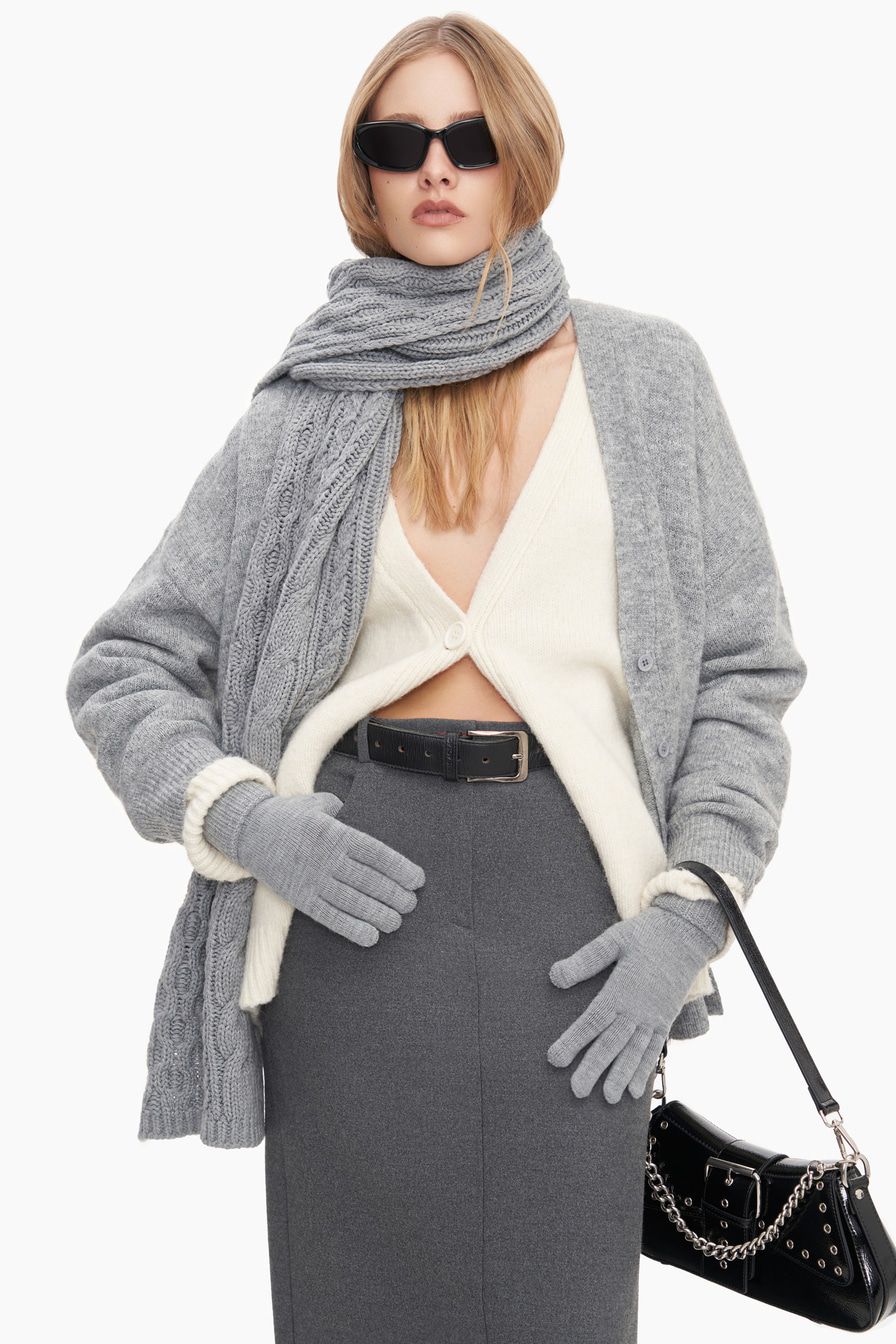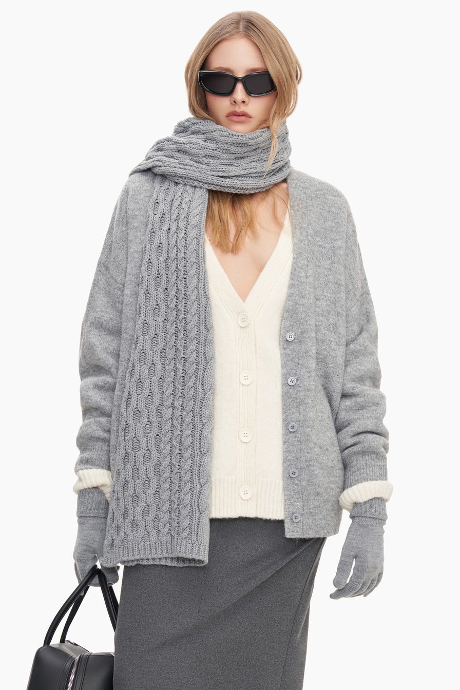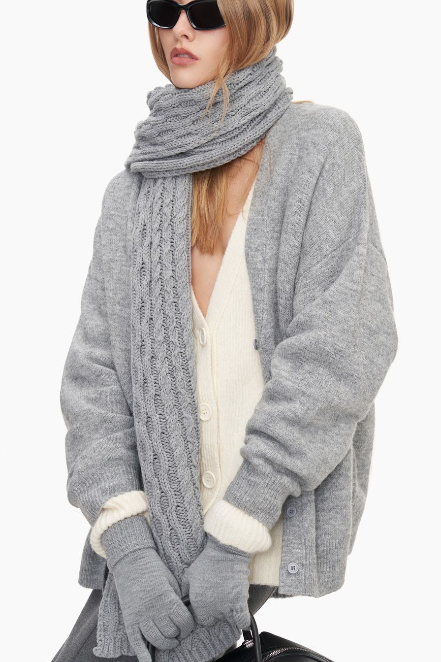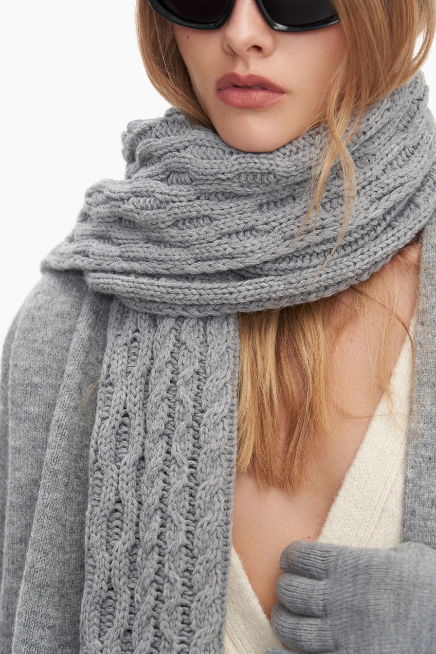 Шарф из смесовой шерсти мериноса с фактурной вязкой «косичка» – модель нейтрального серого цвета.