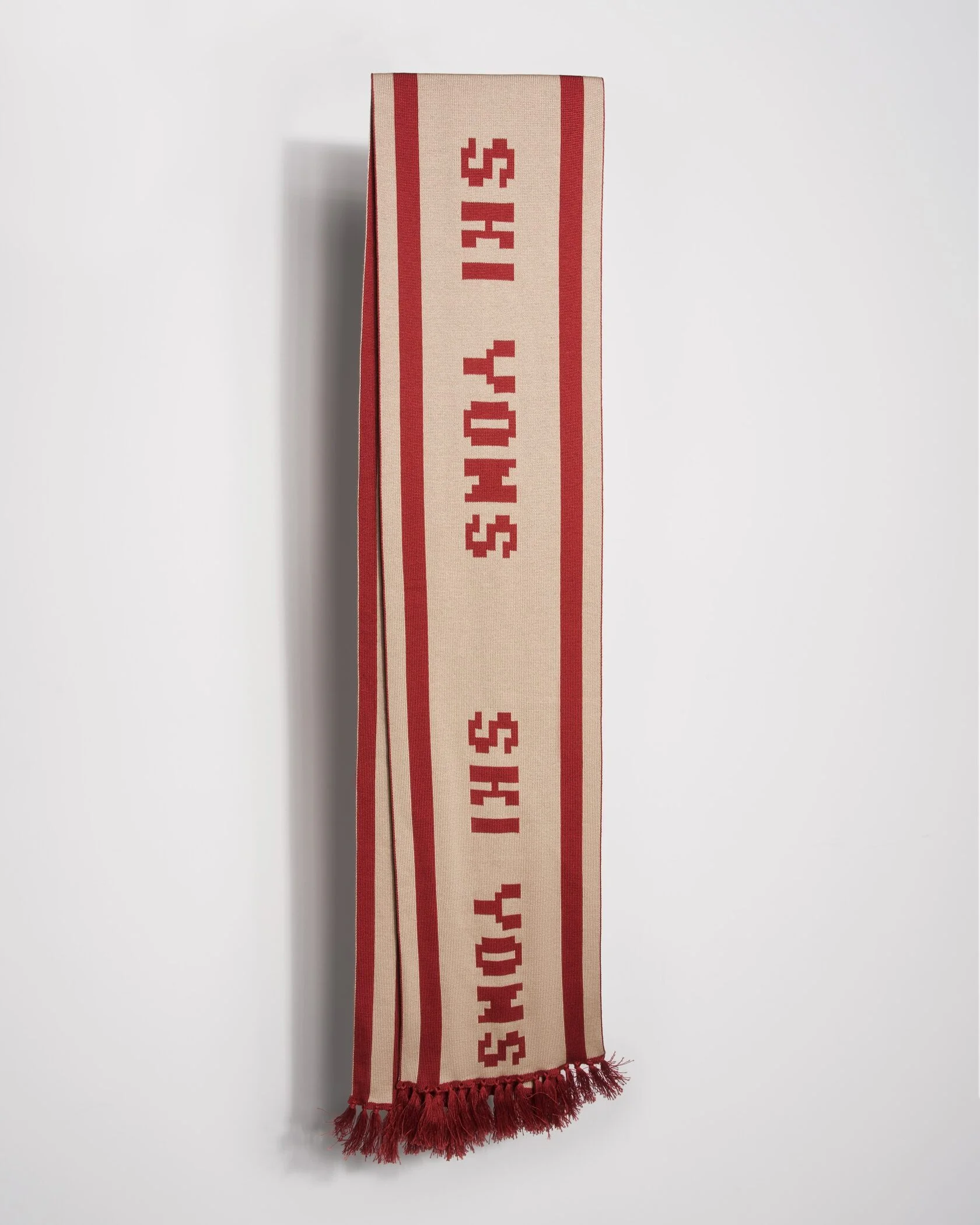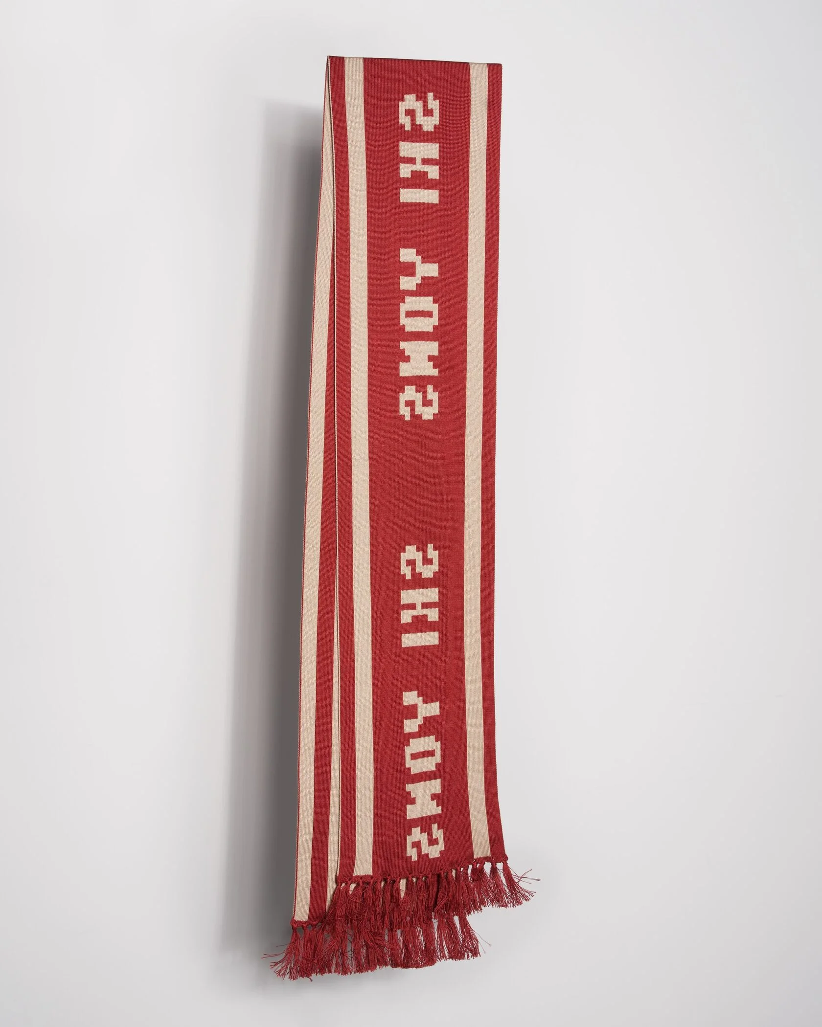 Длинный вязаный шарф SKI YONS выполнен в бежевом цвете с выразительными красными полосами и жаккардовым надписным рисунком. Мягкая плотная вязка сохраняет тепло и комфорт, а бахрома по краям добавляет завершённый вид. Универсальный аксессуар для городской и горнолыжной стилистики.