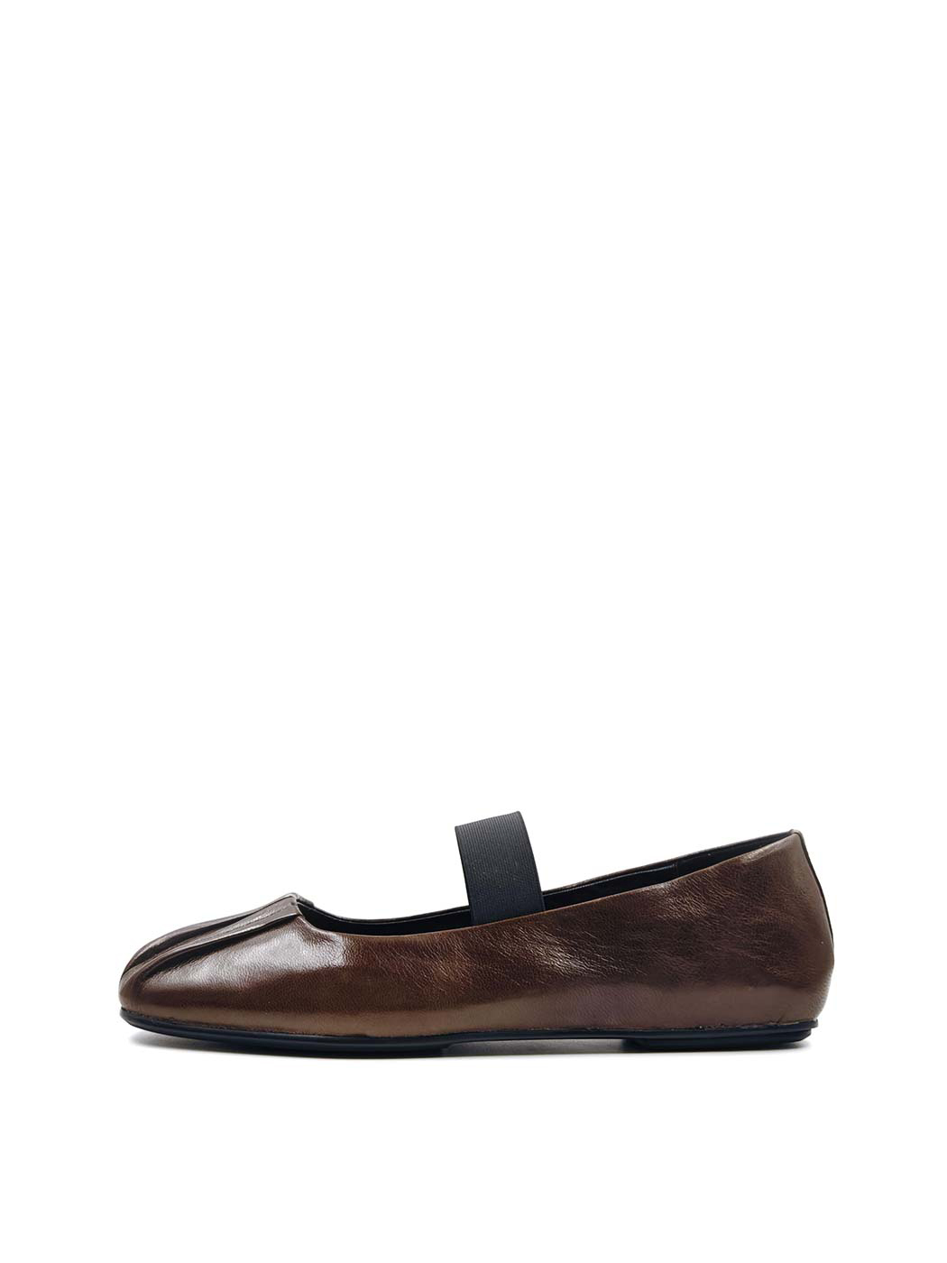 Балетки из натуральной кожи с квадратным рельефным мысом и ремешком в виде резинки.