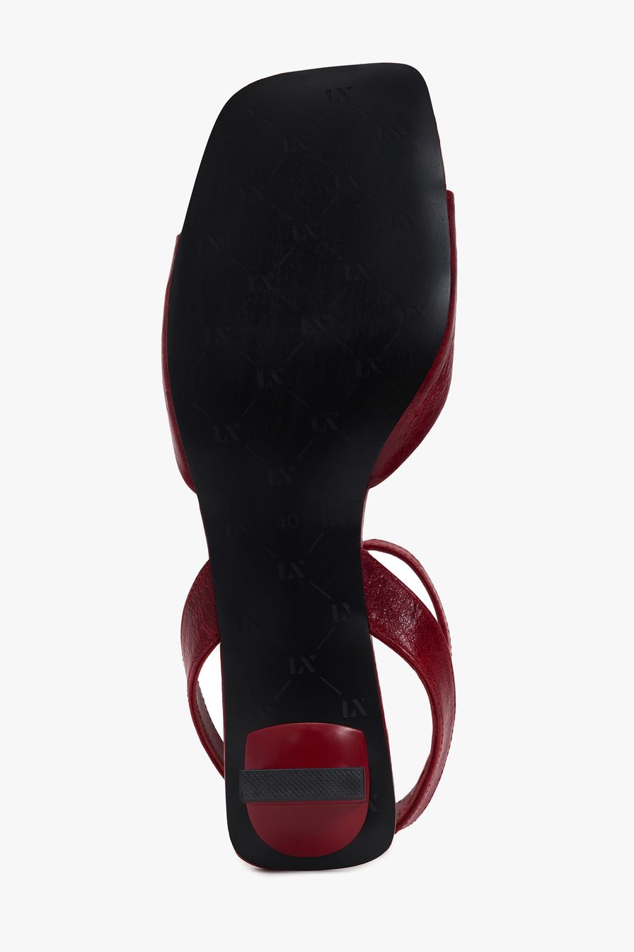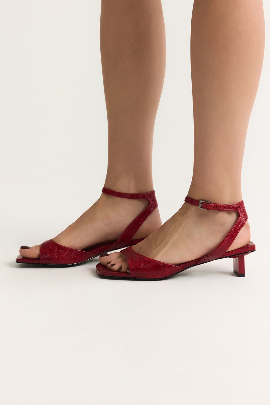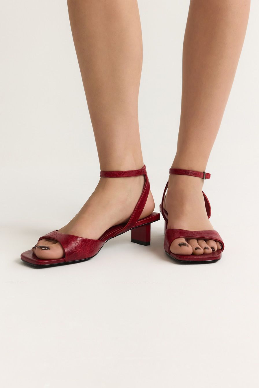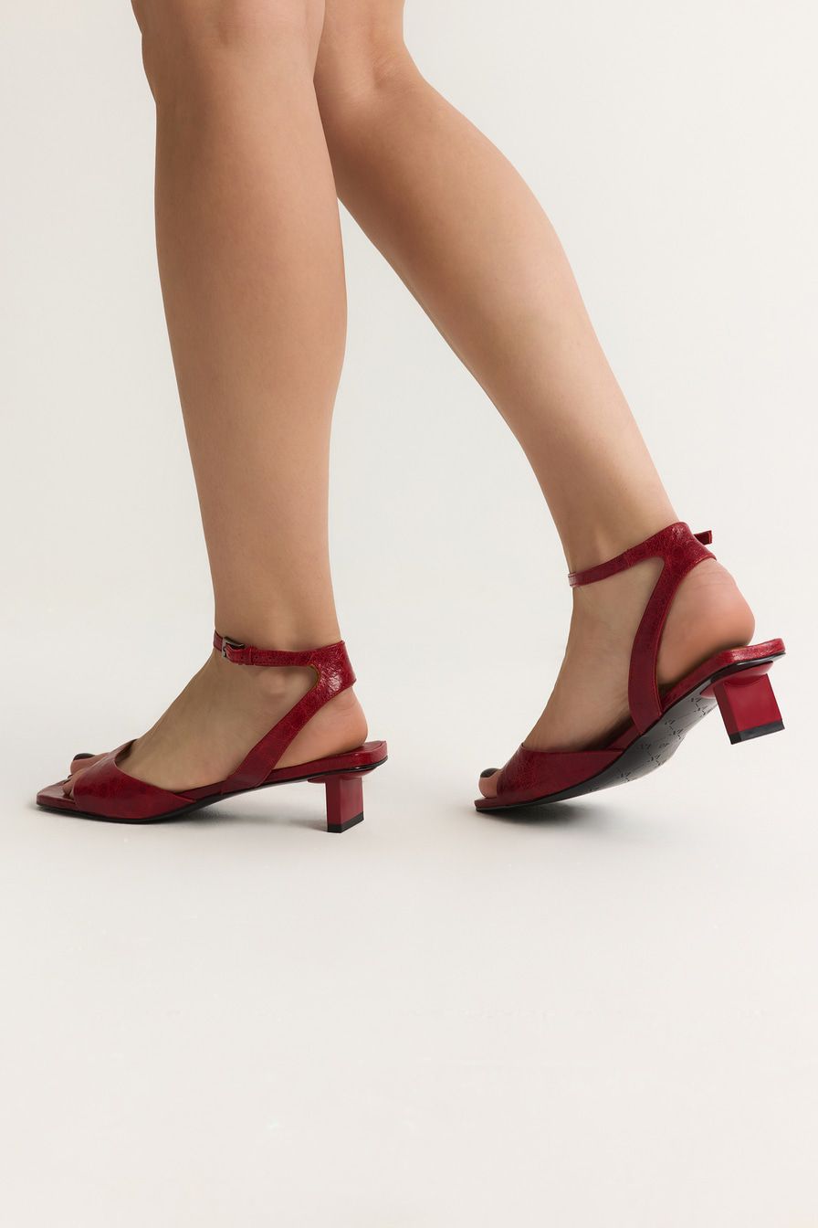 Красные босоножки из натуральной кожи – пара на широком каблуке средней высоты.
