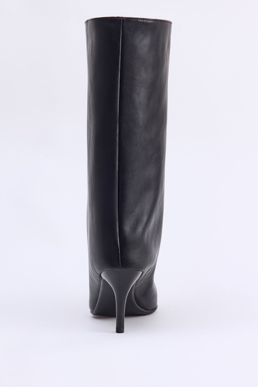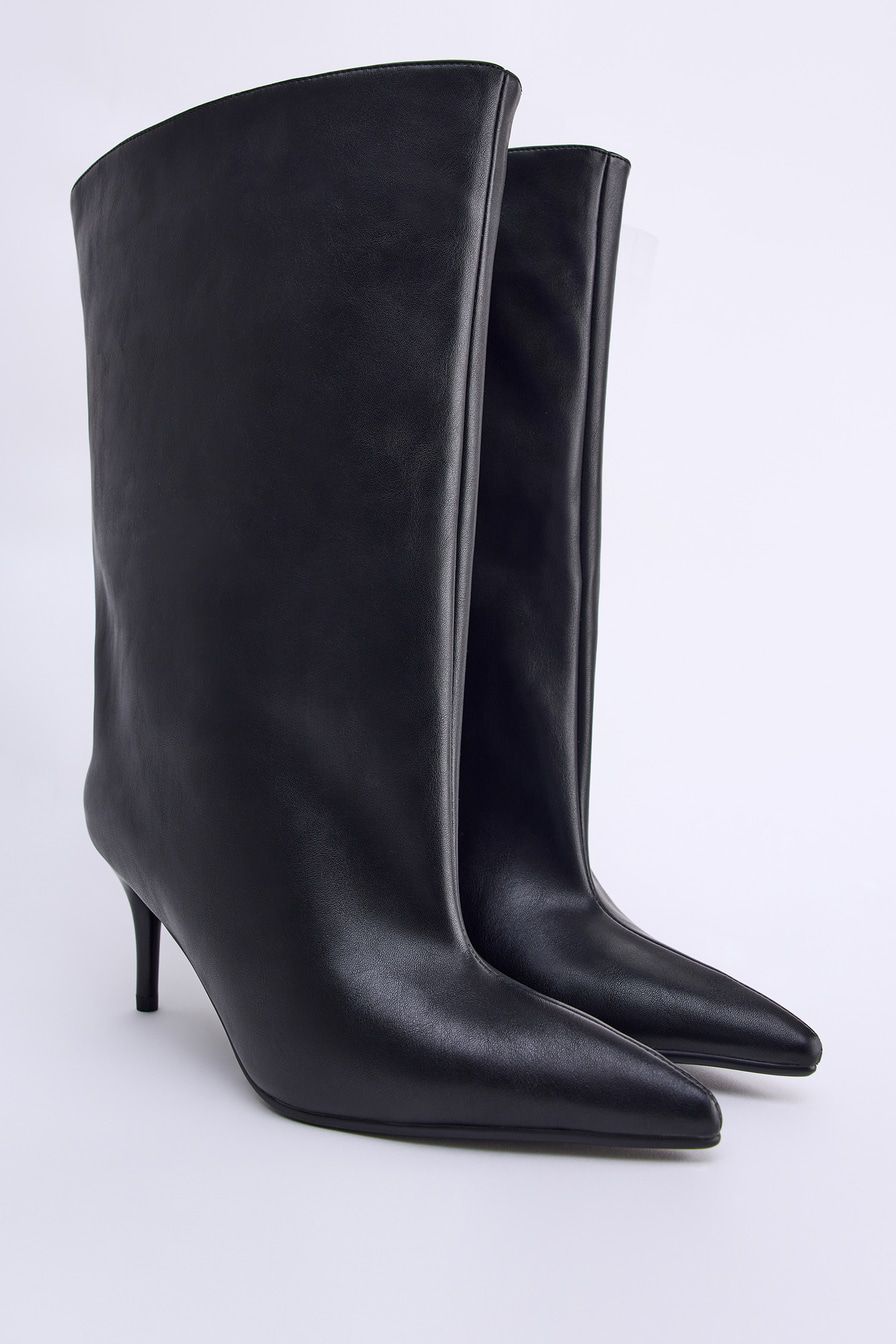 Черные полусапоги из экокожи – модель с широким голенищем и острым мысом, на тонком и высоком каблуке.