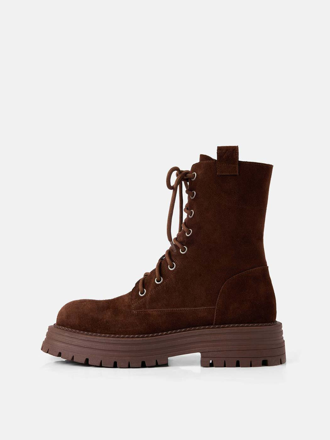 Высокие ботинки коричневого цвета выполнены из натуральной замши, дополнены шнуровкой, массивной платформой и кожаной подкладкой. Ботинки можно носить в застегнутом виде или сделав отворот.