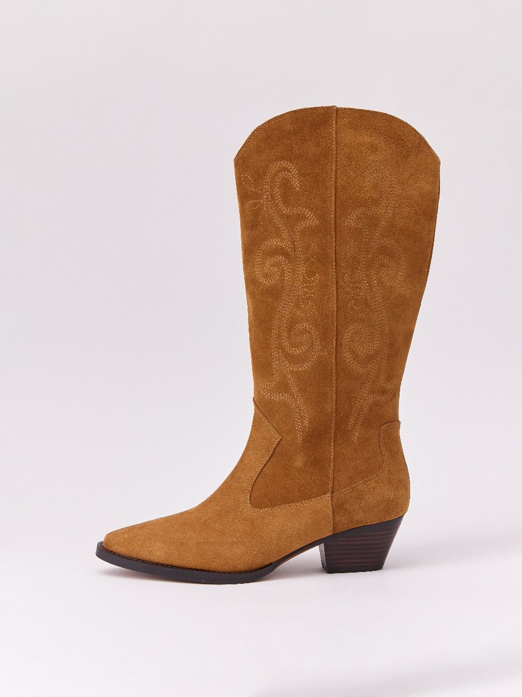 Завышенные сапоги-казаки из натуральной замши рыже-коричневого цвета. Имеют широкое голенище с вышивкой и невысокий устойчивый каблук. Подкладка и стелька выполнены из натуральной кожи. Для ваших стильных образов на каждый день.