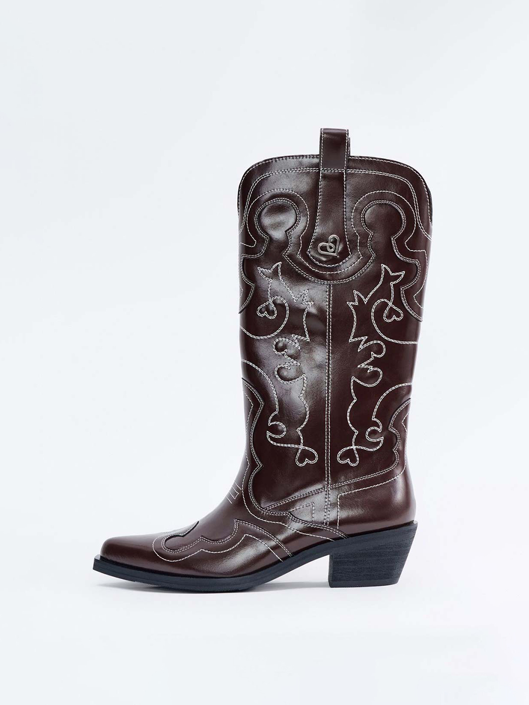 Темно-коричневые полусапоги-казаки из микрофибры – высокопрочного заменителя натуральной кожи на основе микроволокон. Пара декорирована контрастной узорной строчкой.