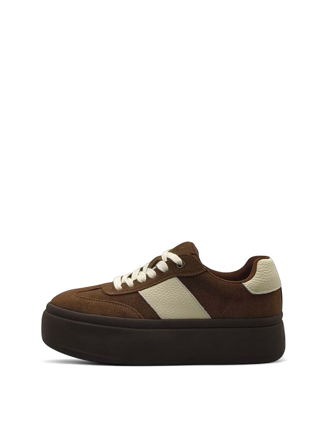 Женские кеды на толстой подошве выполнены в коричневом цвете, что позволяет сочетать их с разнообразной одеждой. Они станут стильным дополнением к повседневному образу.