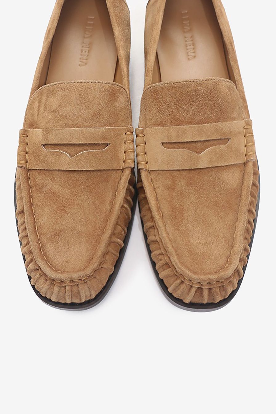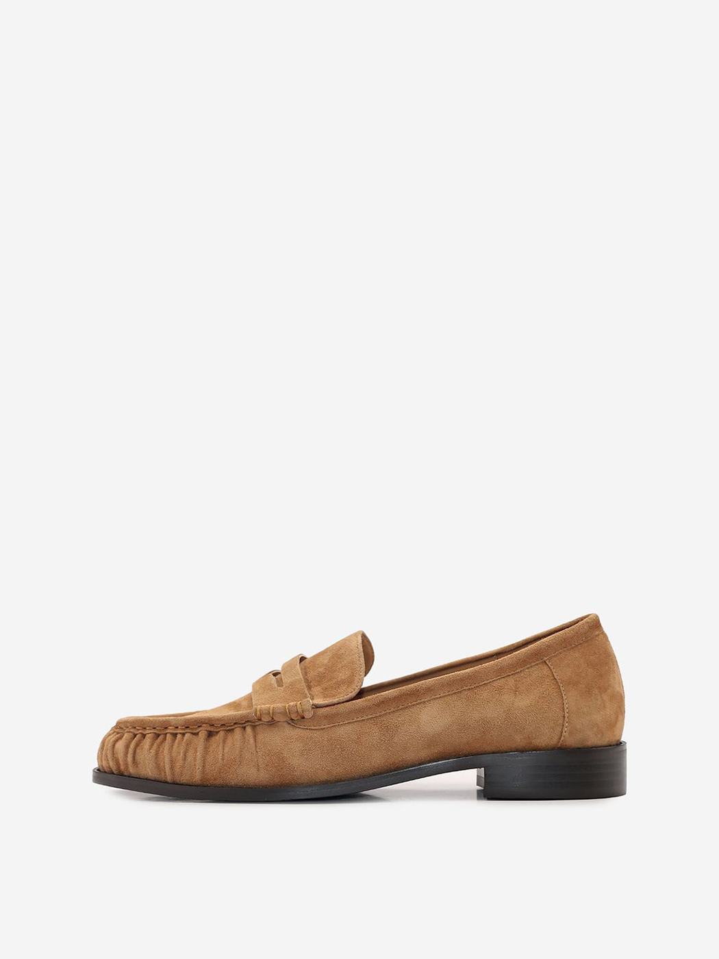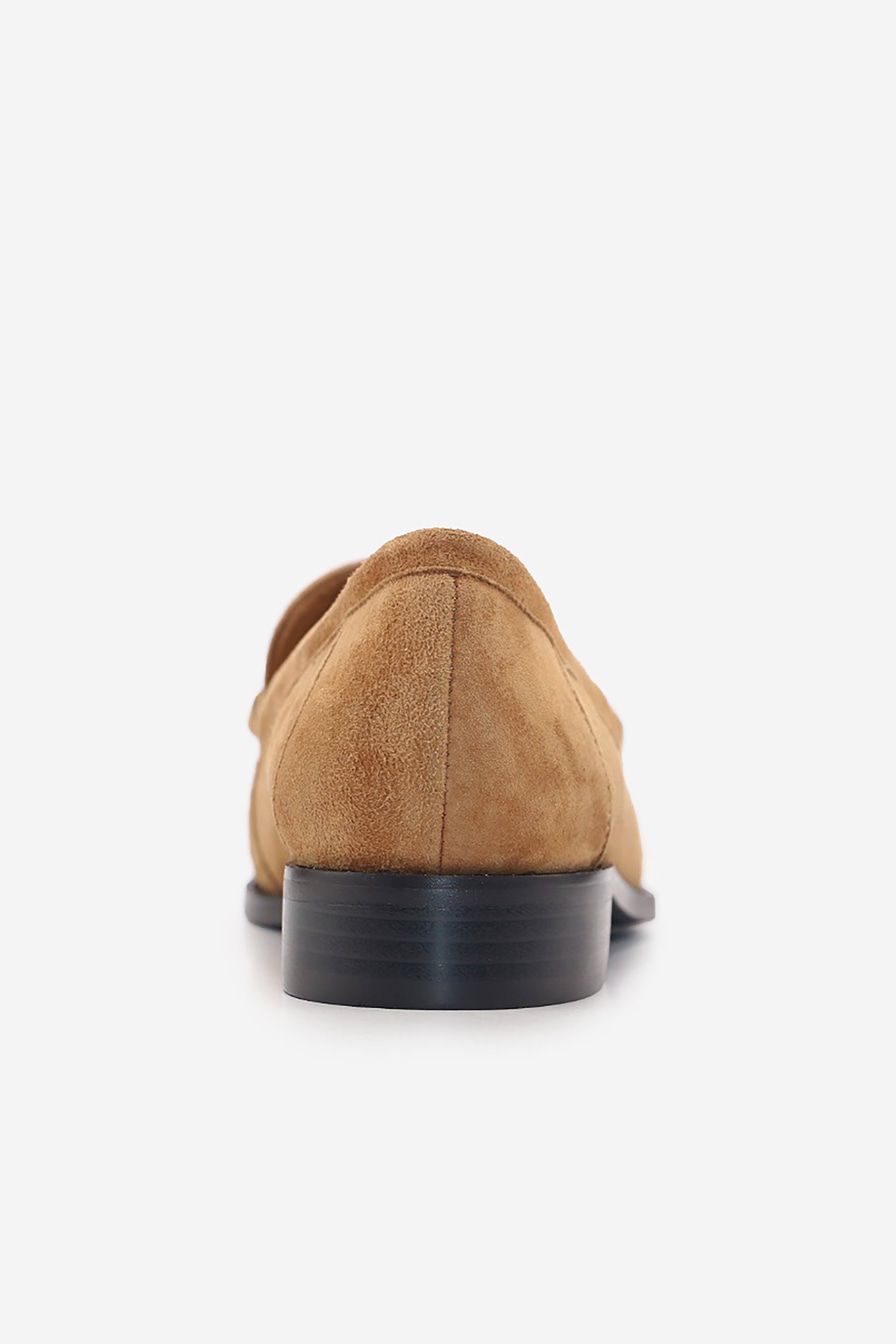Бежевые пенни-лоферы выполнены из натуральной замши и дополнены небольшим каблуком-кирпичиком.