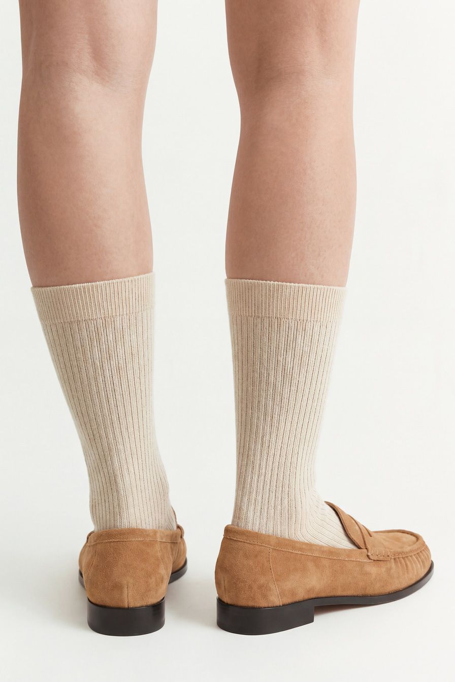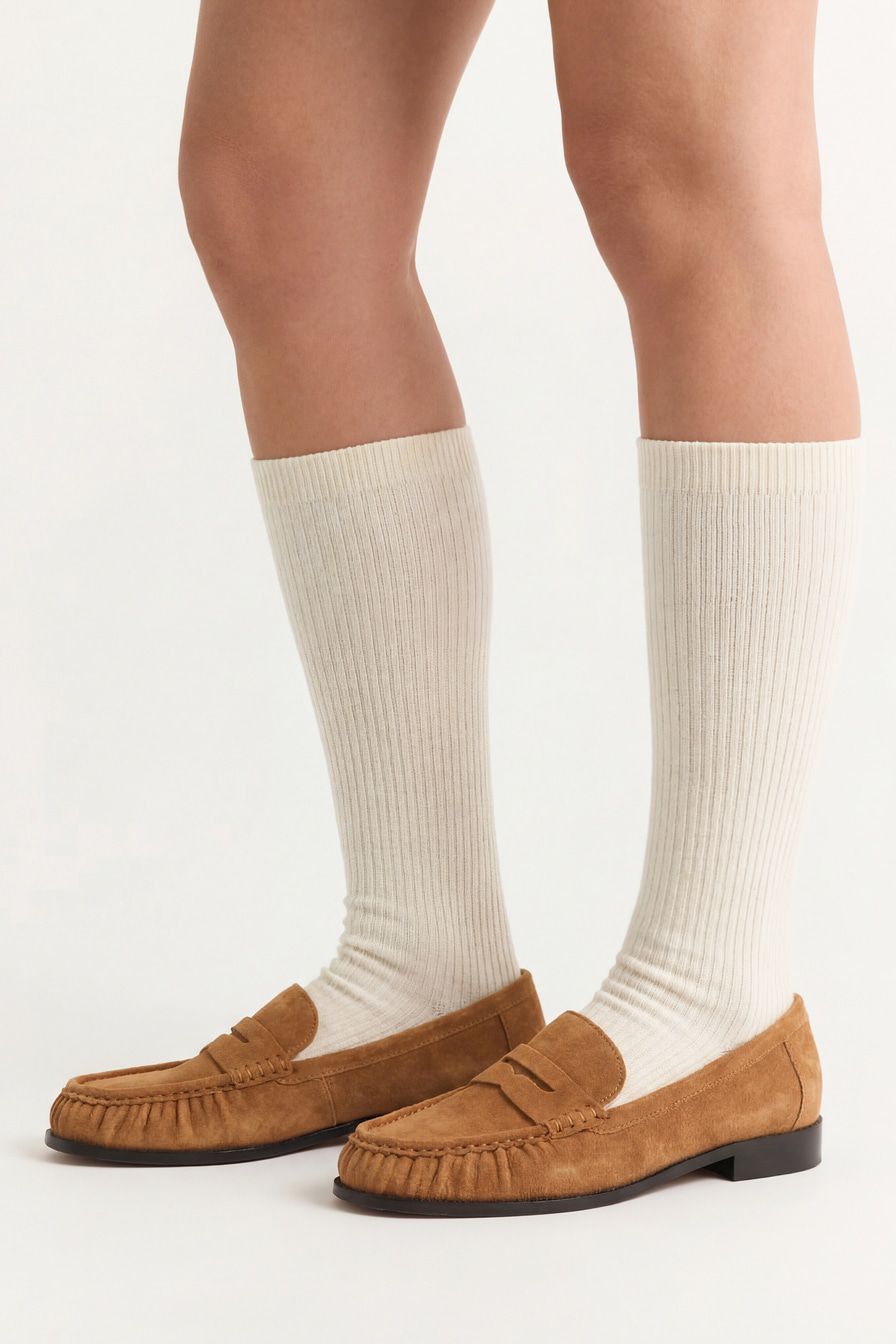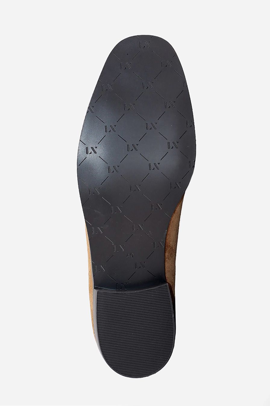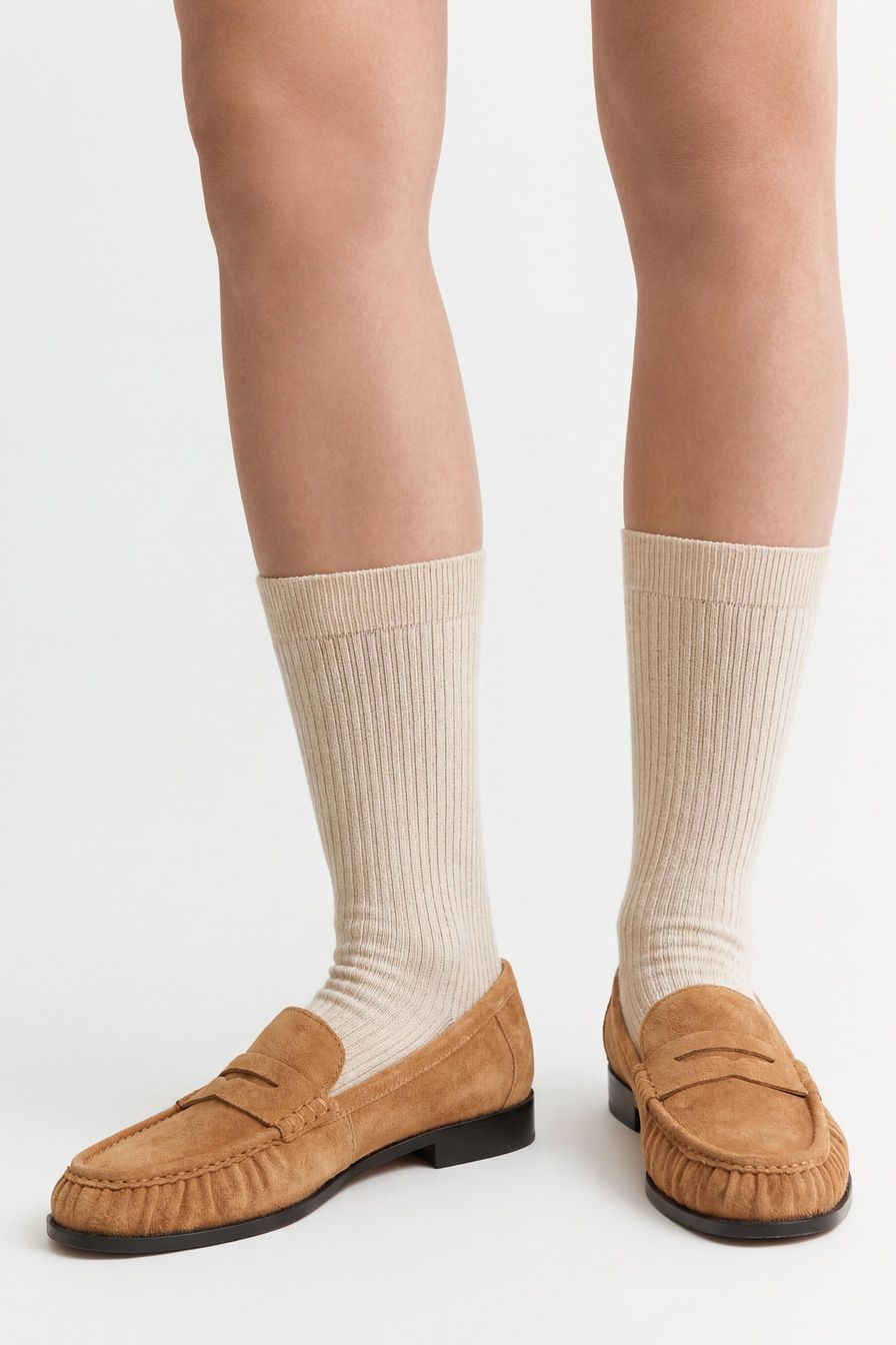 Бежевые пенни-лоферы выполнены из натуральной замши и дополнены небольшим каблуком-кирпичиком.