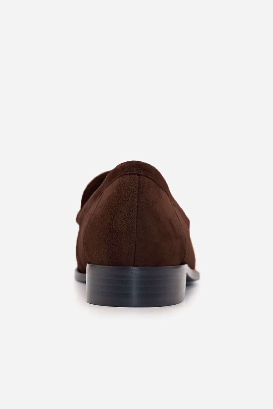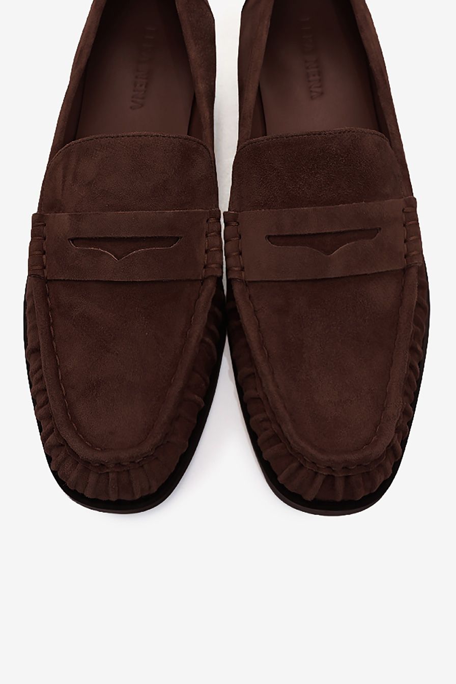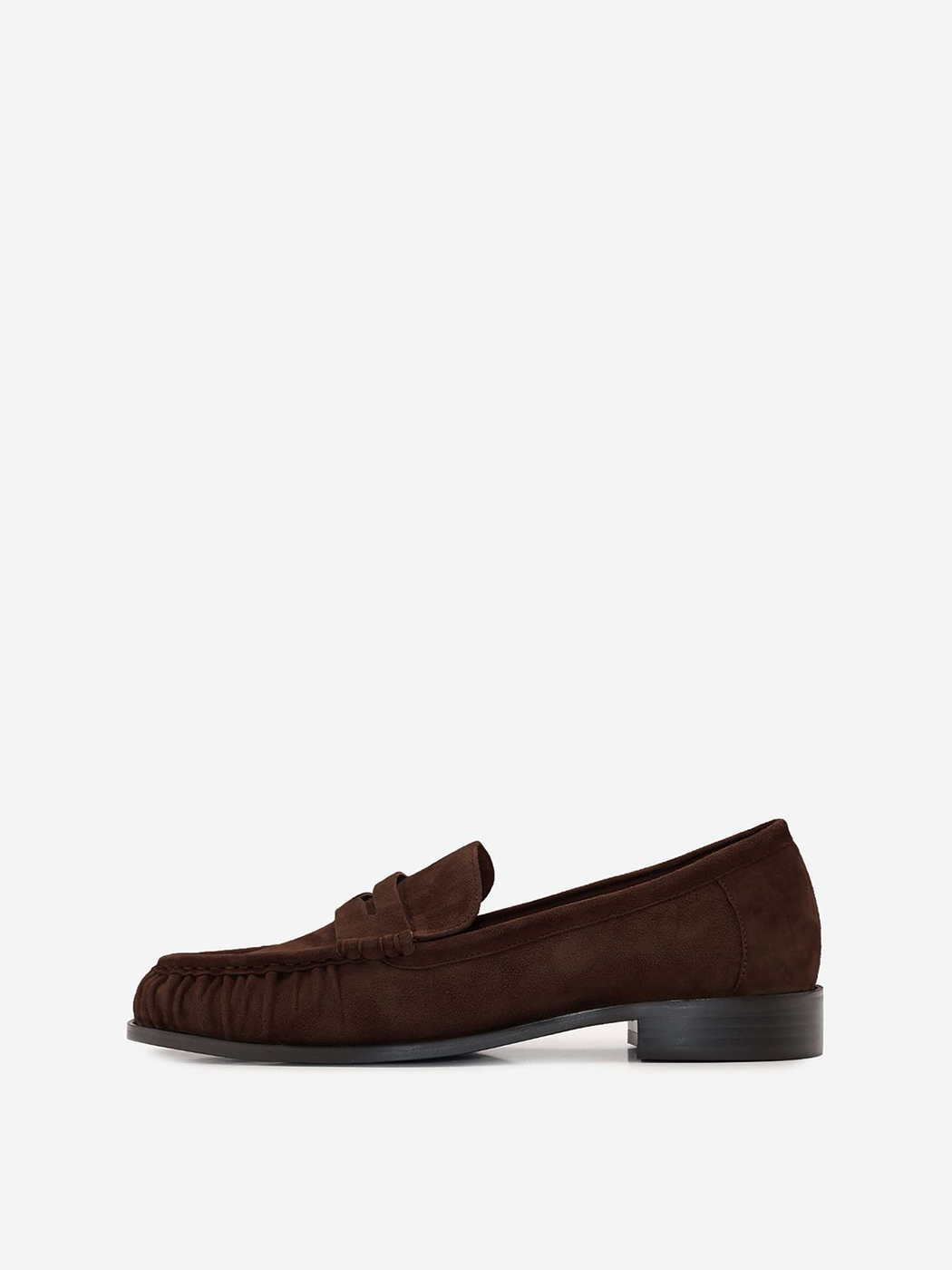 Коричневые пенни-лоферы выполнены из натуральной замши и дополнены небольшим каблуком-кирпичиком.