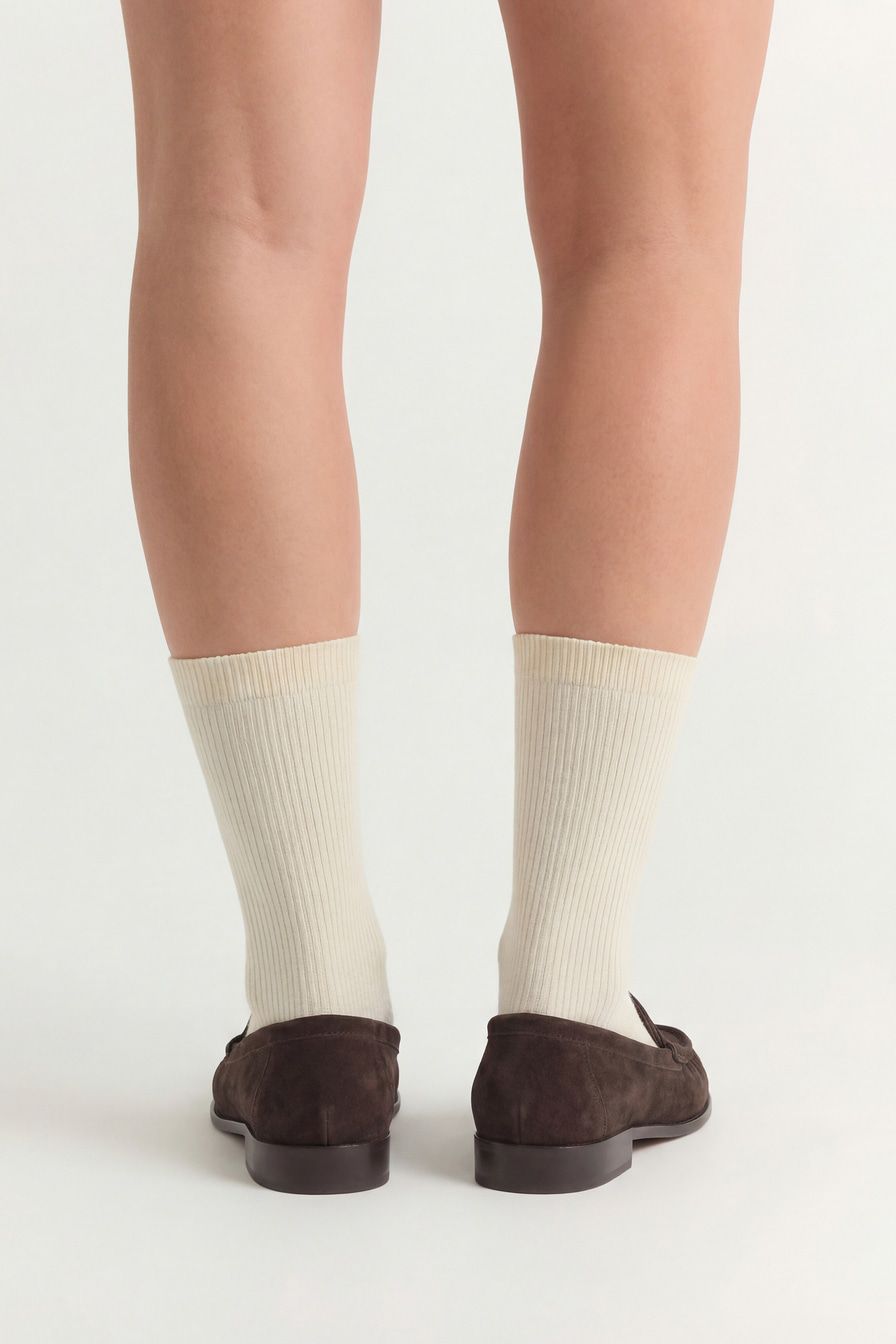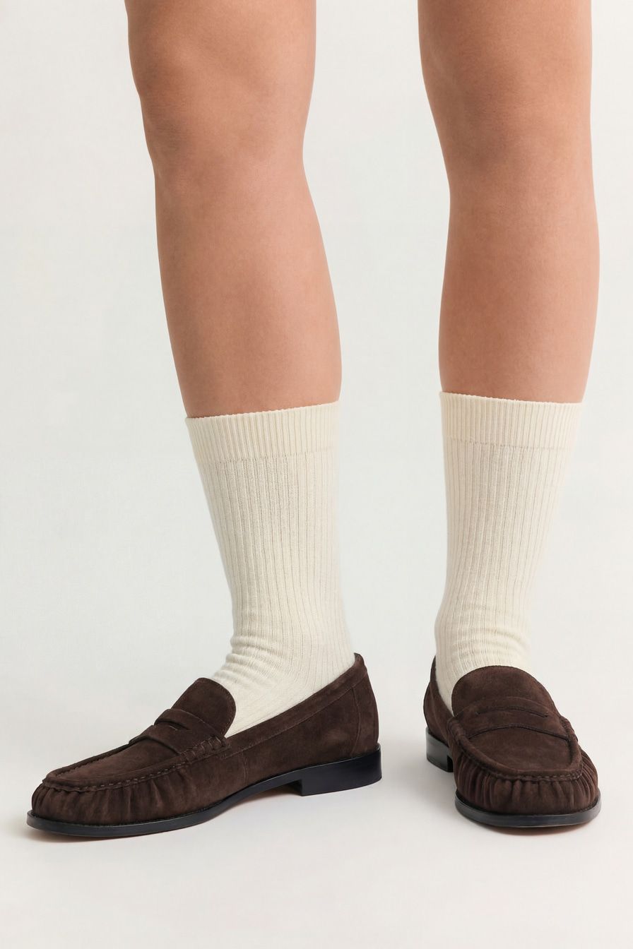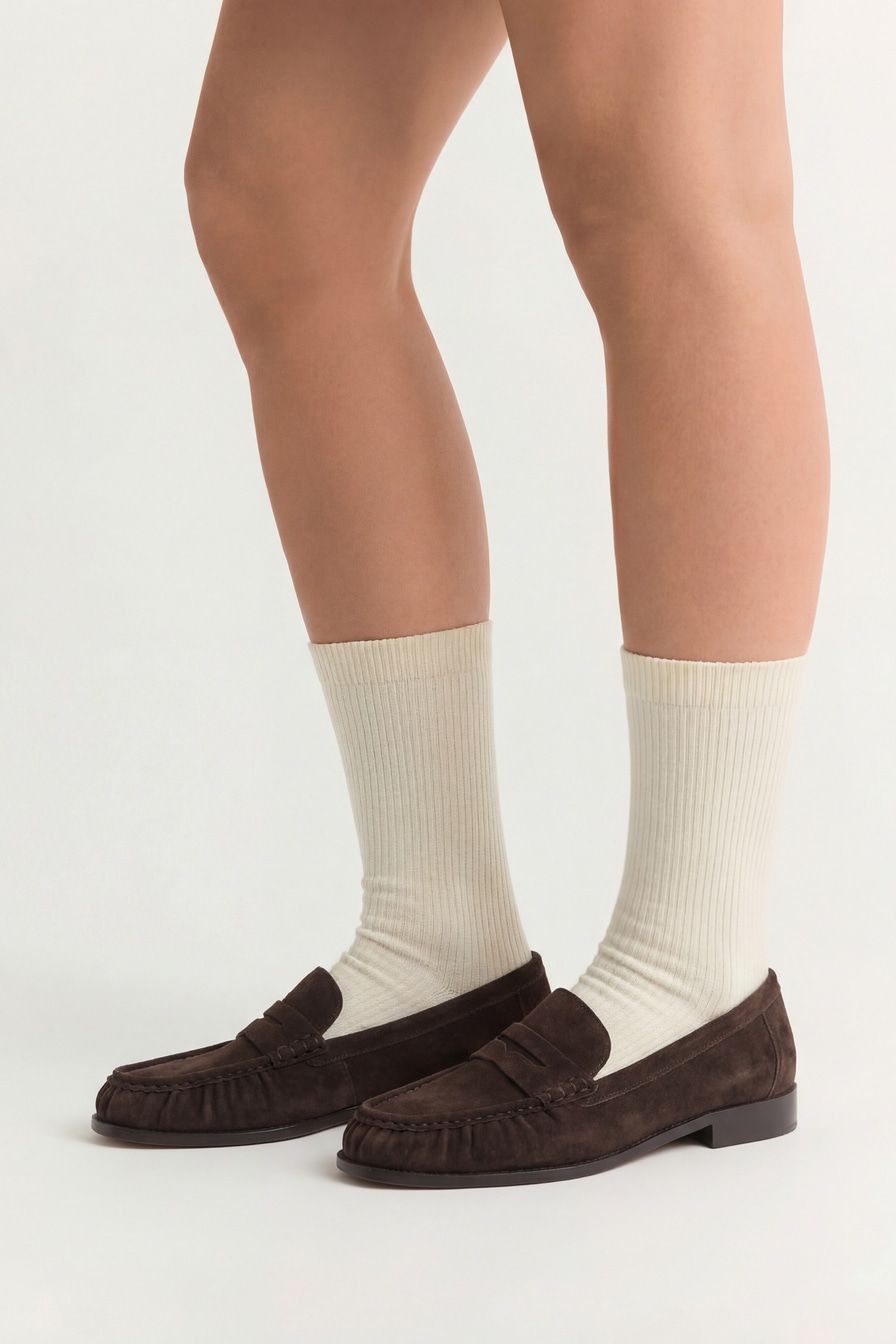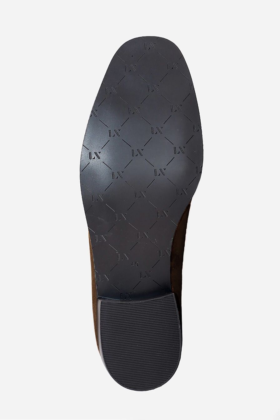 Коричневые пенни-лоферы выполнены из натуральной замши и дополнены небольшим каблуком-кирпичиком.