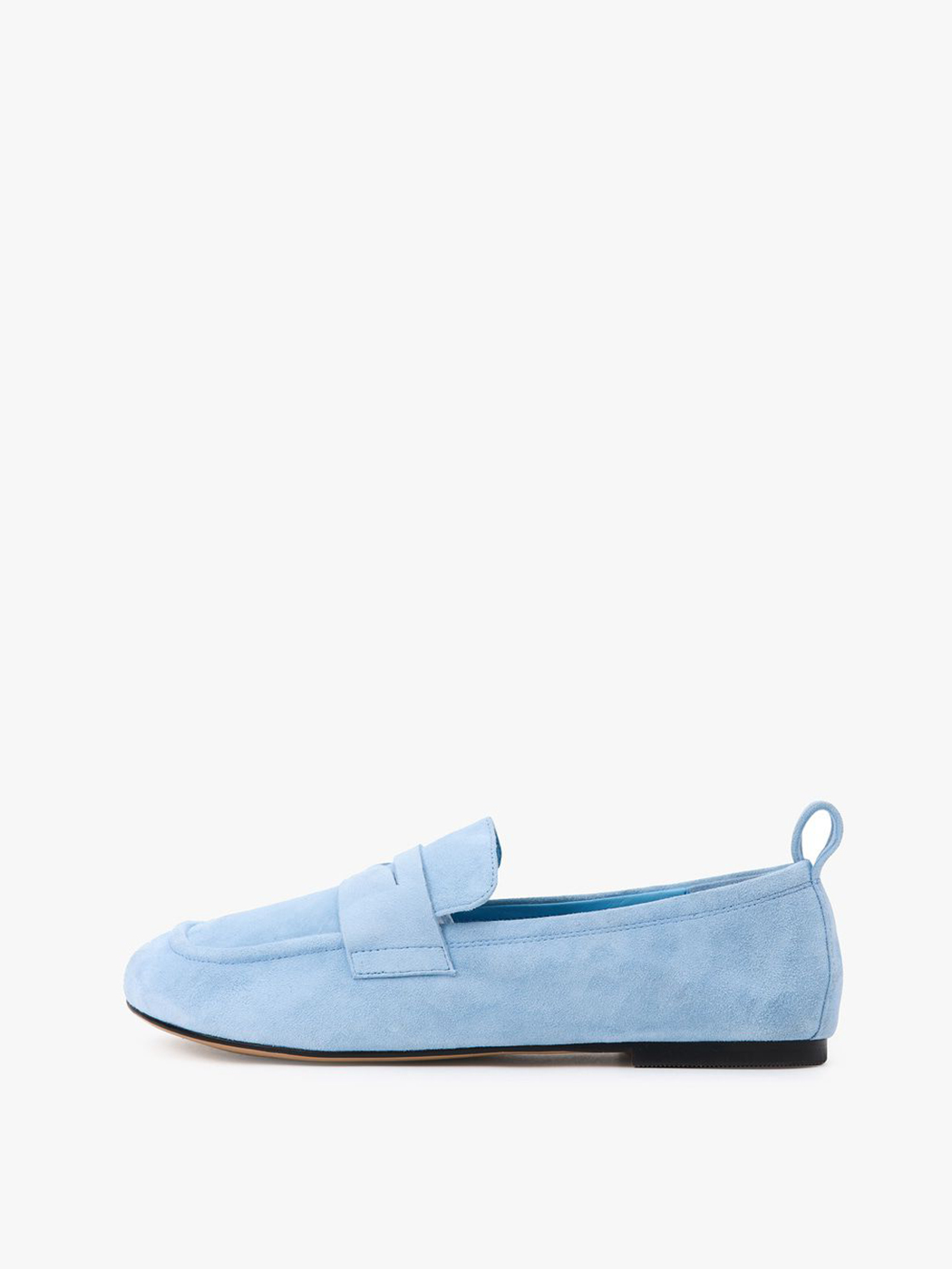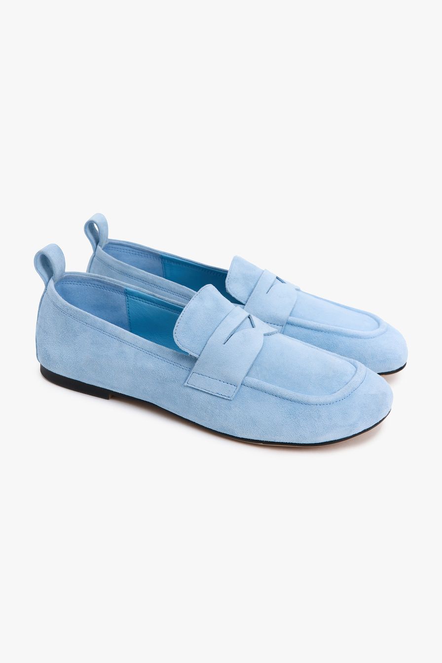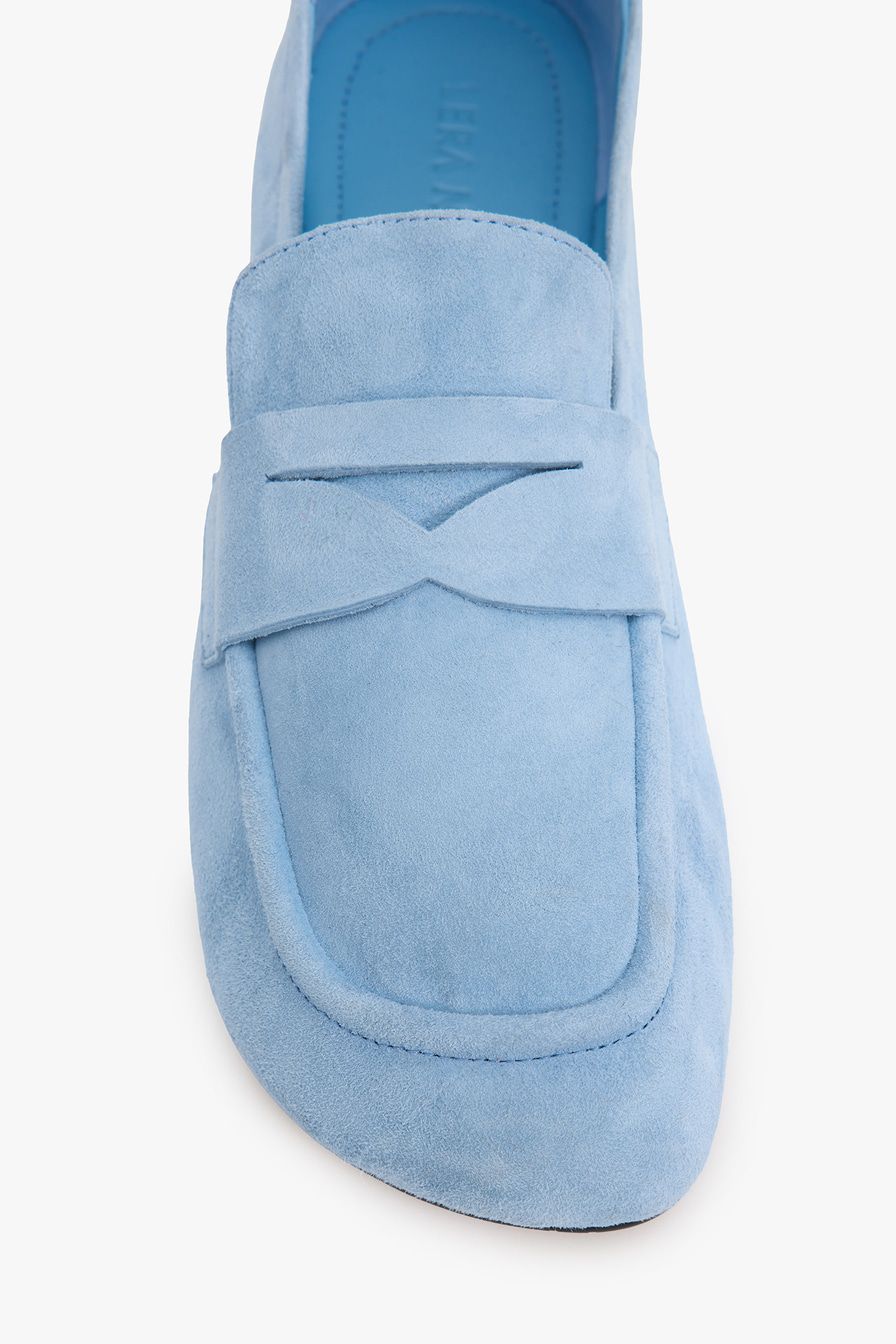 Пенни-лоферы голубого цвета выполнены из натуральной замши и дополнены небольшим каблуком-кирпичиком.