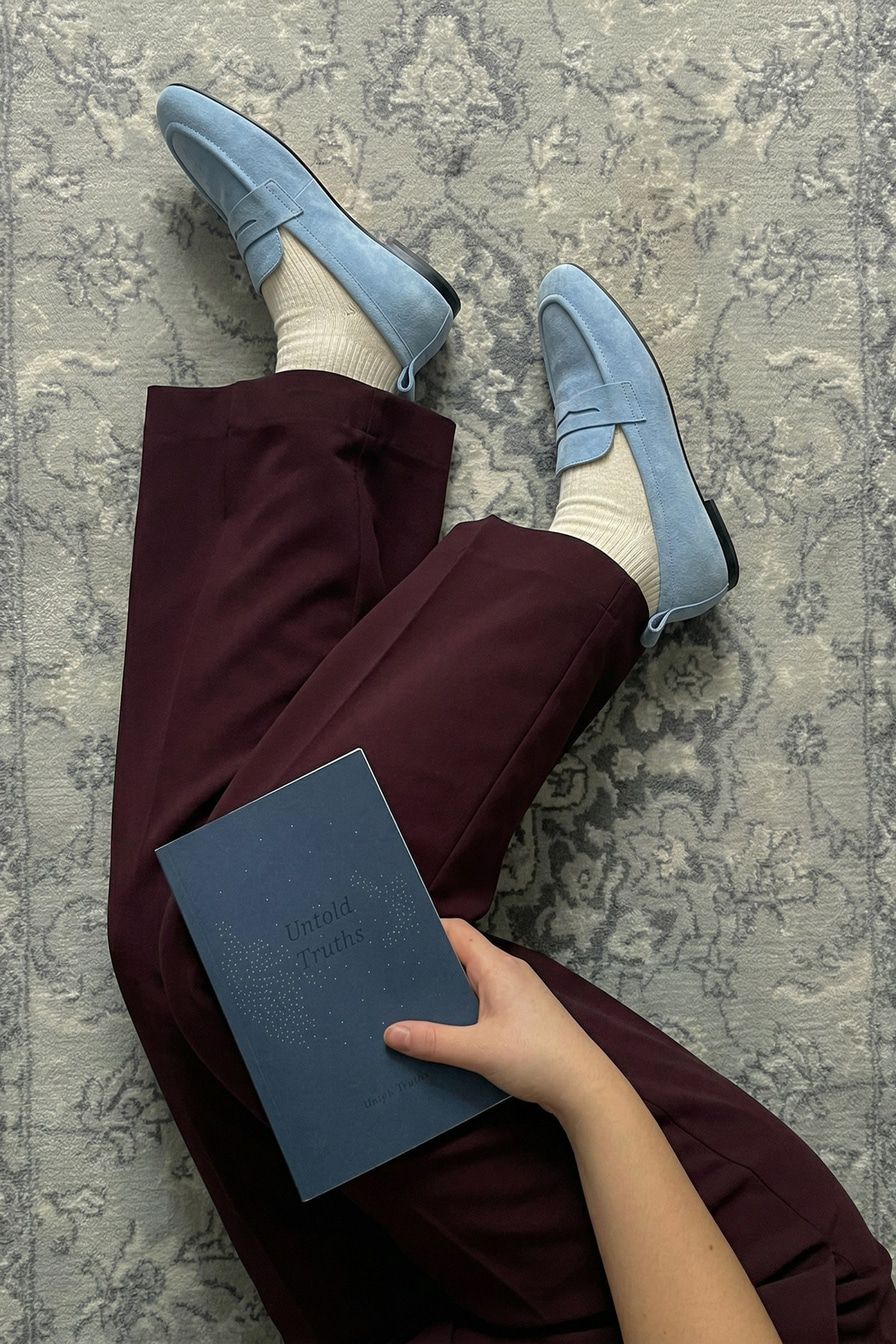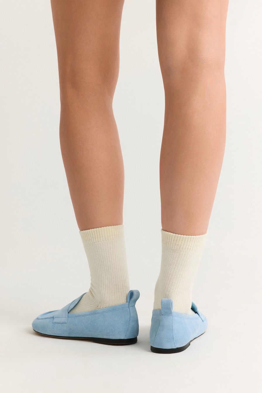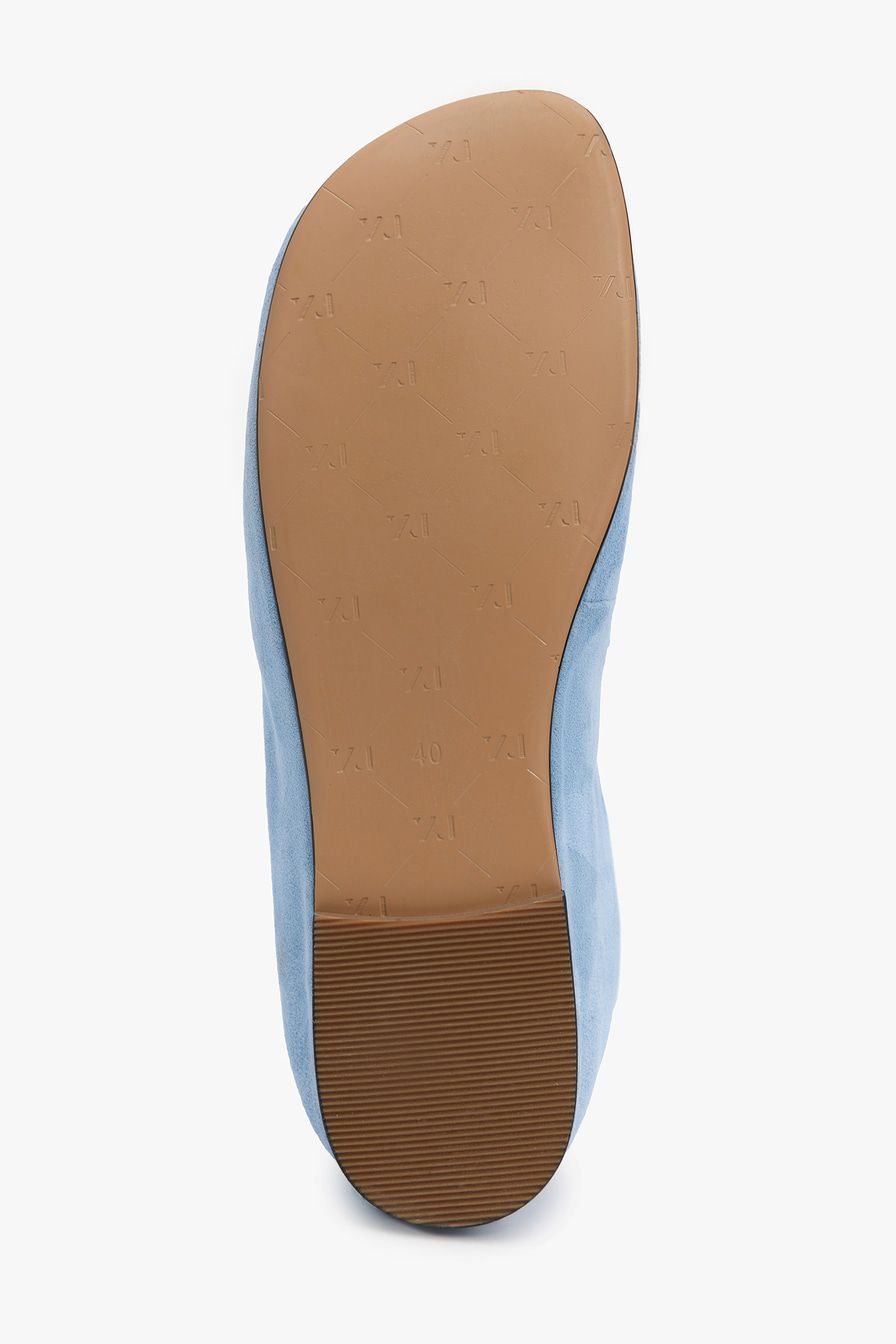 Пенни-лоферы голубого цвета выполнены из натуральной замши и дополнены небольшим каблуком-кирпичиком.