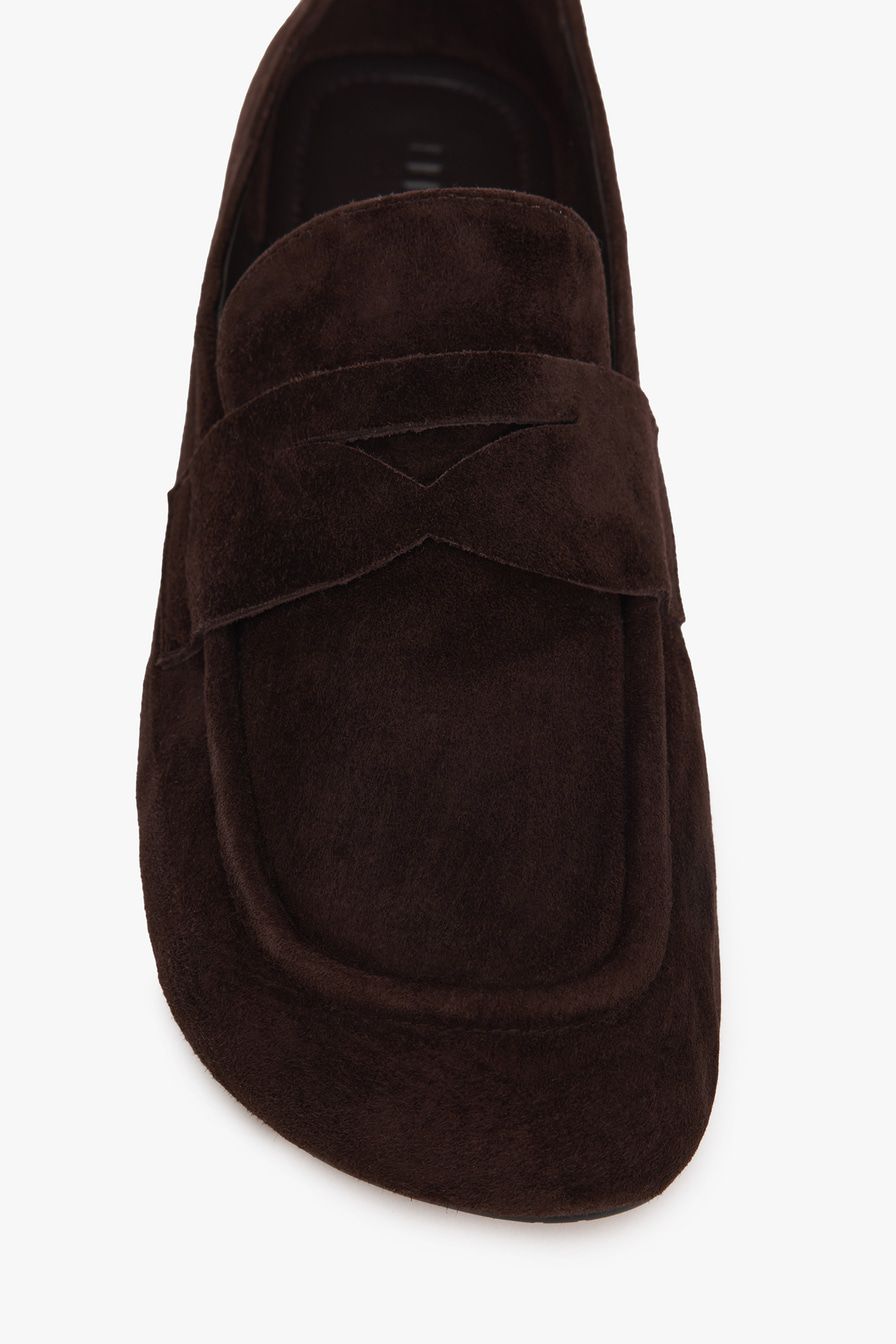 Пенни-лоферы коричневого цвета выполнены из натуральной замши и дополнены небольшим каблуком-кирпичиком.