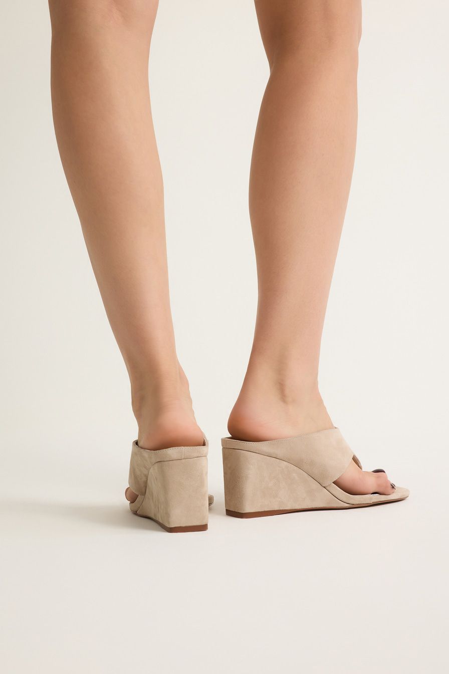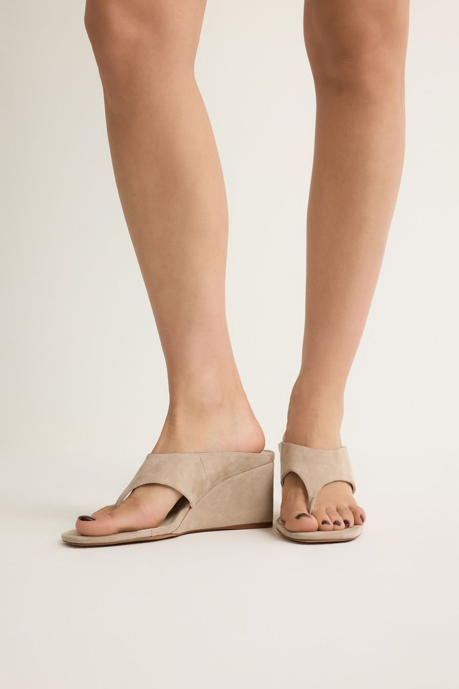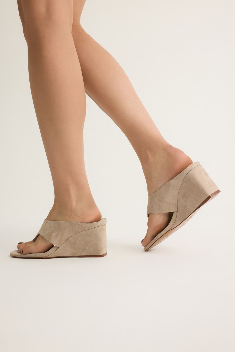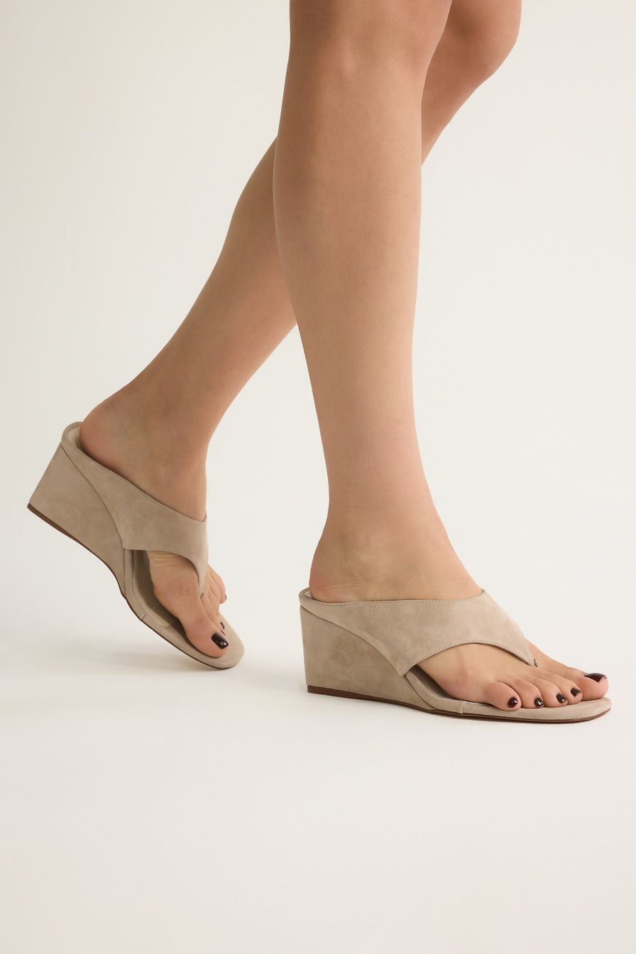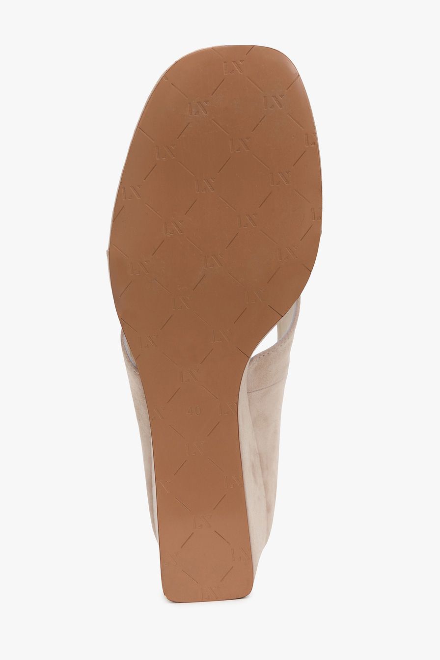 Бежевые босоножки на танкетке выполнены из натуральной замши.