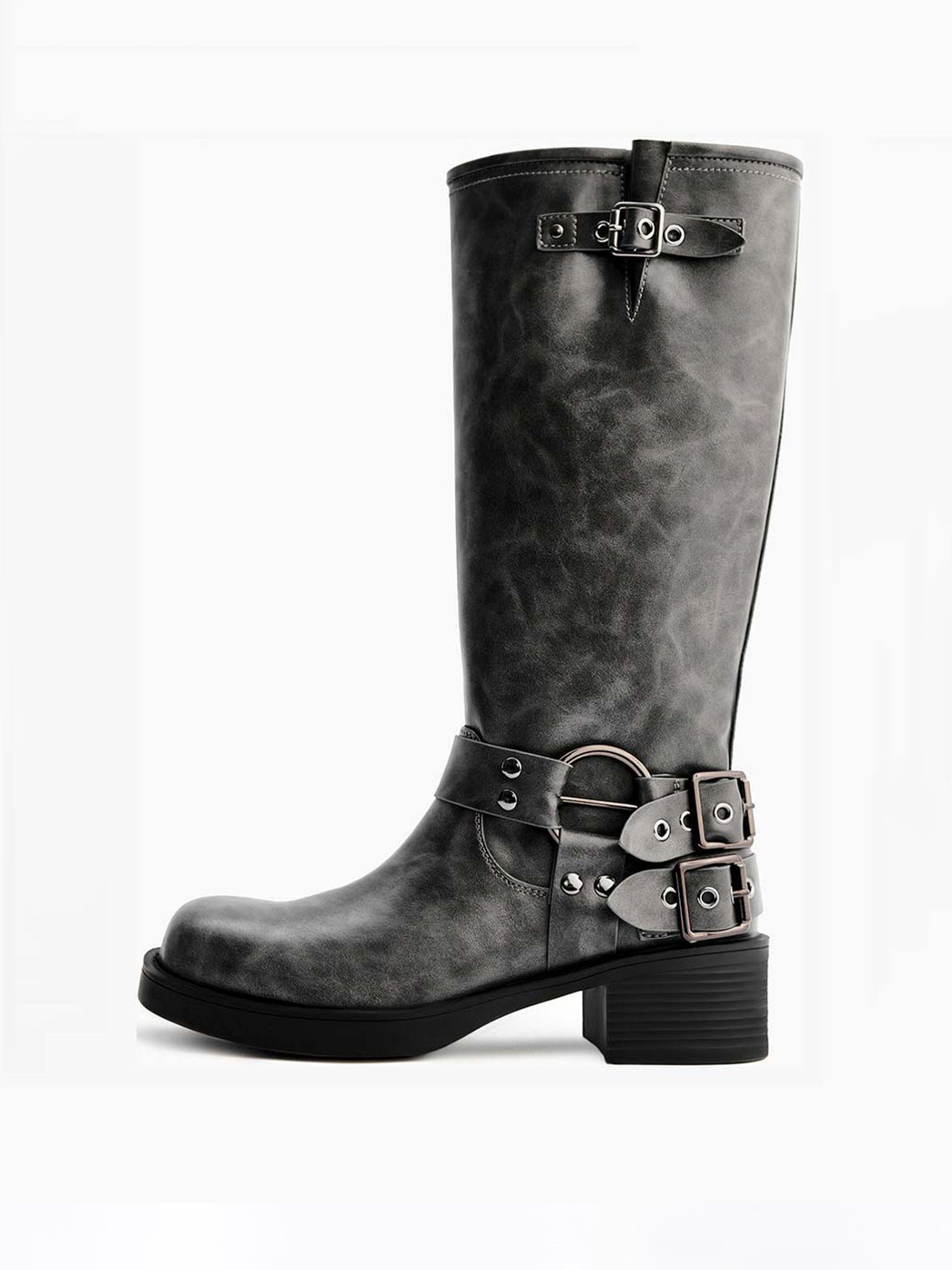 Серые сапоги с винтажным эффектом – модель из микрофибры, высокопрочного заменителя натуральной кожи на основе микроволокон. Сапоги дополнены декоративными ремешками и широким каблуком.