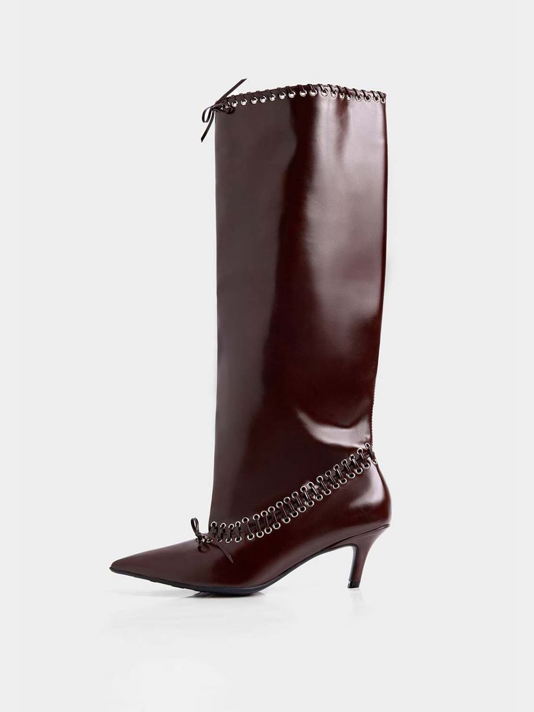 Высокие темно-коричневые сапоги со свободным голенищем выполнены из микрофибры – высокопрочного заменителя натуральной кожи на основе микроволокон. Сапоги декорированы люверсами и шнуровкой.