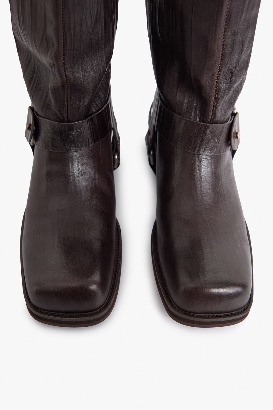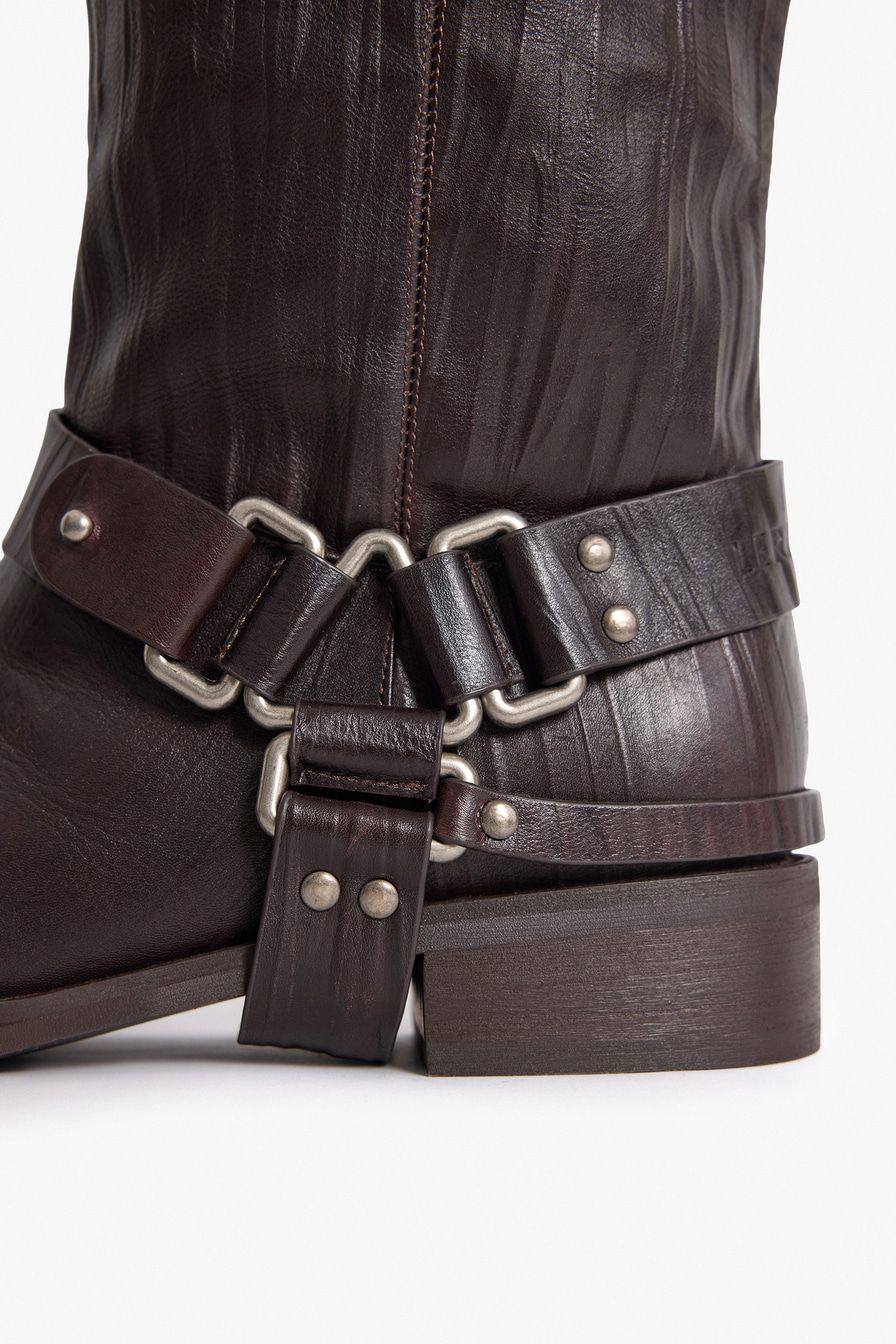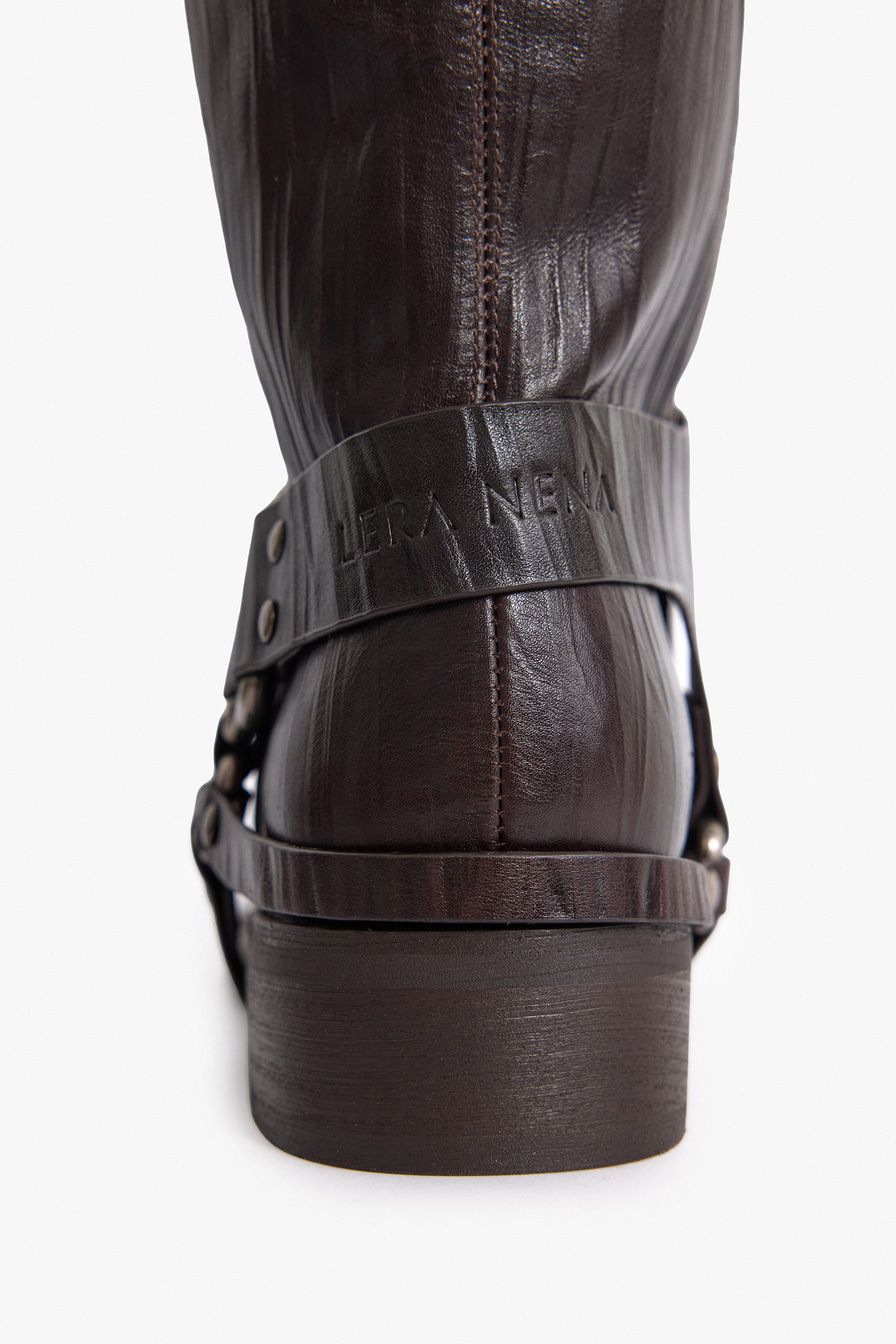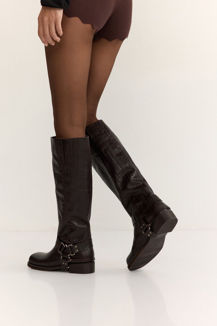 Коричневые сапоги в «байкерском» стиле выполнены из фактурной натуральной кожи и дополнены декоративными ремешками.