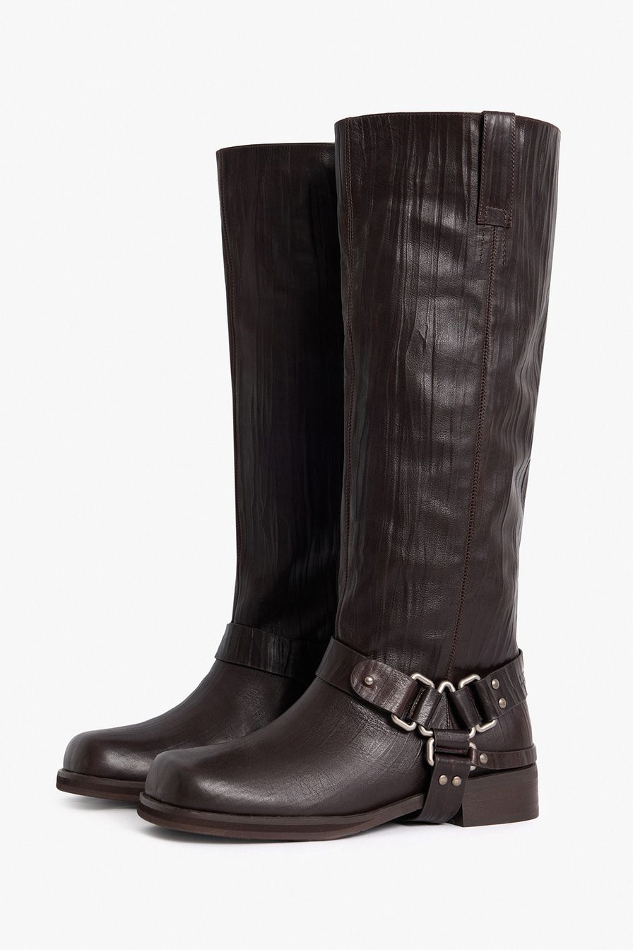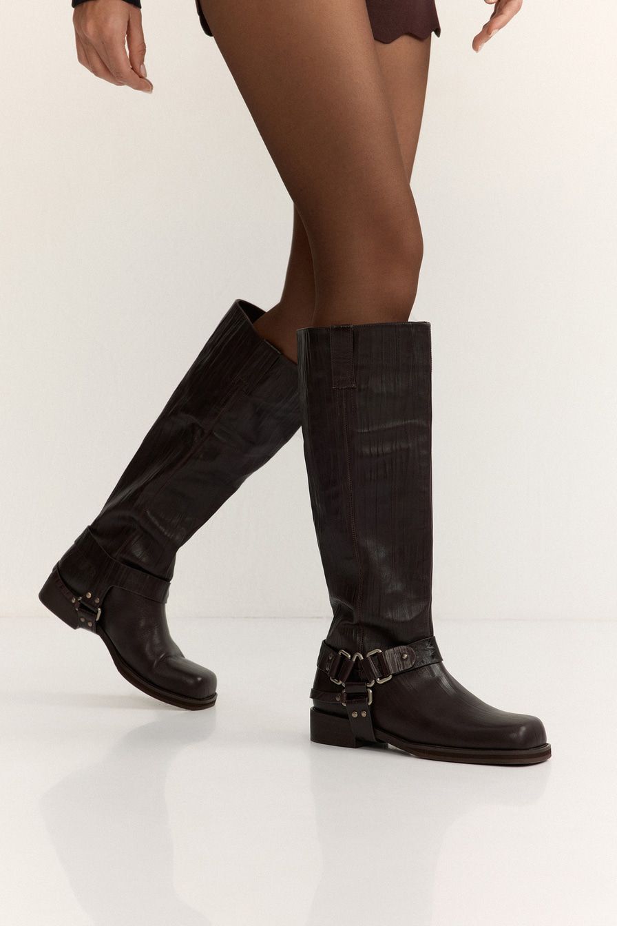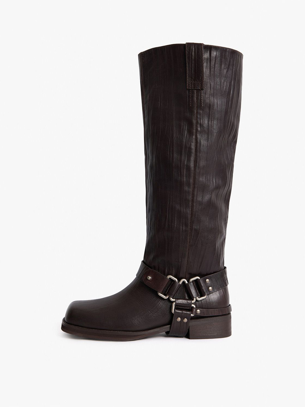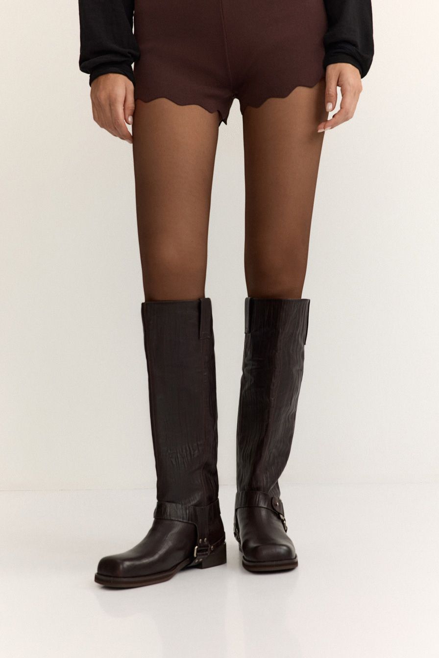 Коричневые сапоги в «байкерском» стиле выполнены из фактурной натуральной кожи и дополнены декоративными ремешками.