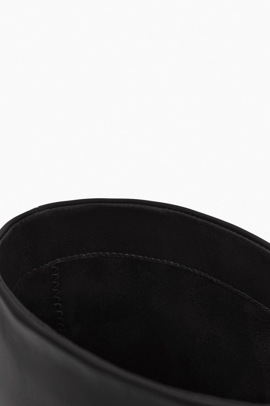 Черные сапоги из экокожи – модель с широким голенищем и квадратным мысом.