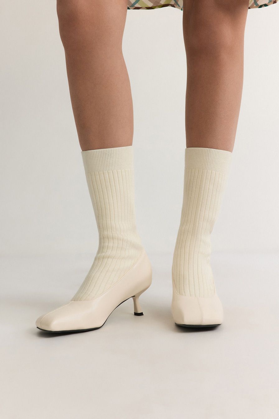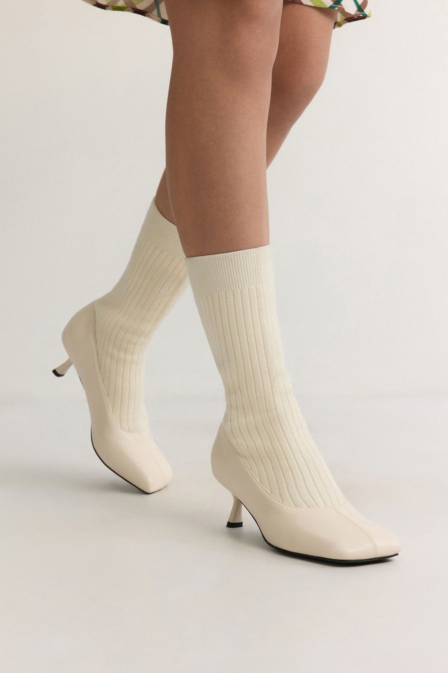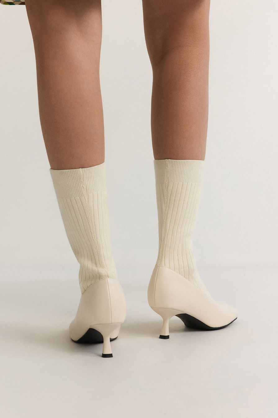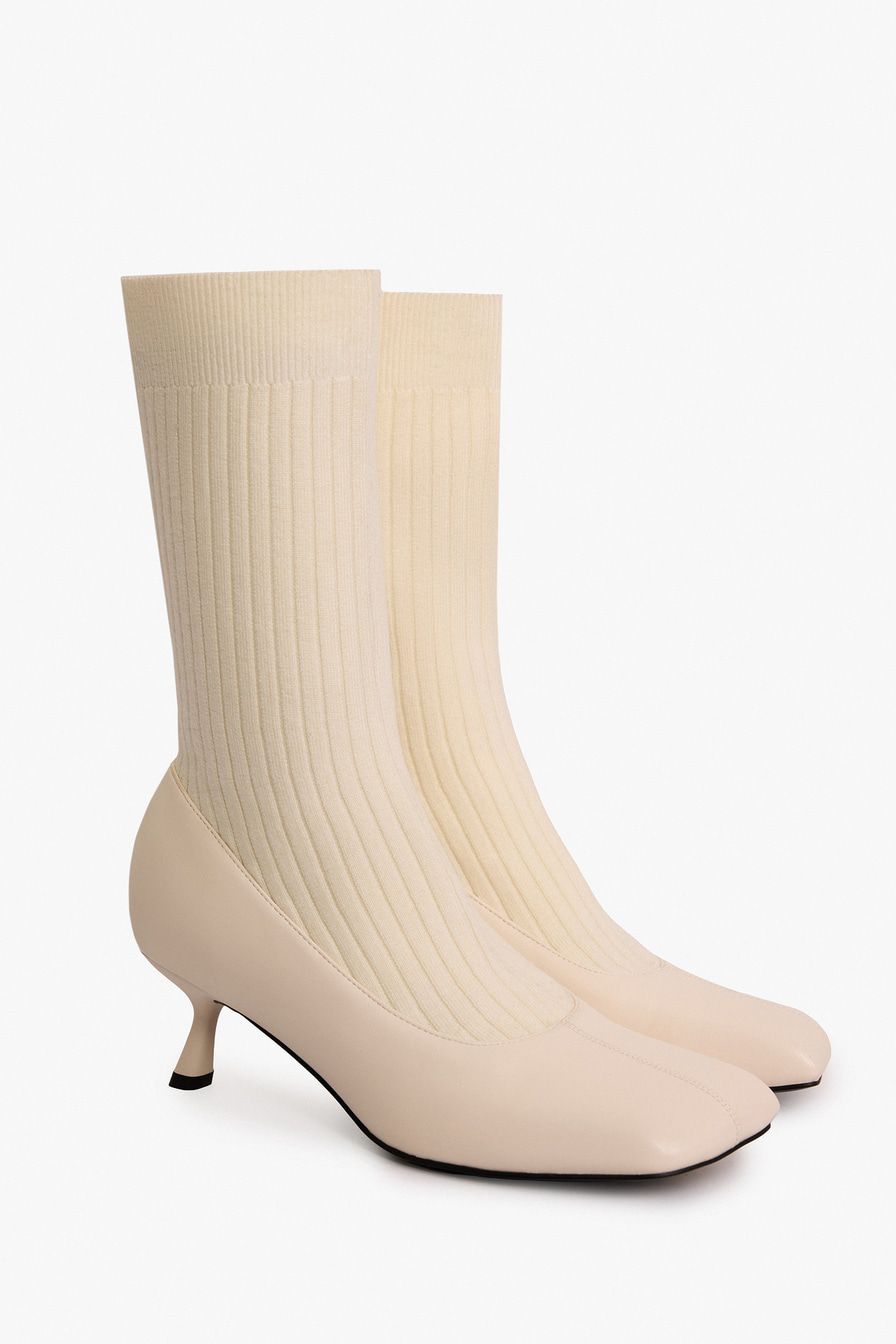 Полусапоги из экокожи и текстиля имитируют туфли в комплекте с носками в крупный рубчик. Модель молочного цвета дополнена квадратным мысом и высоким каблуком.