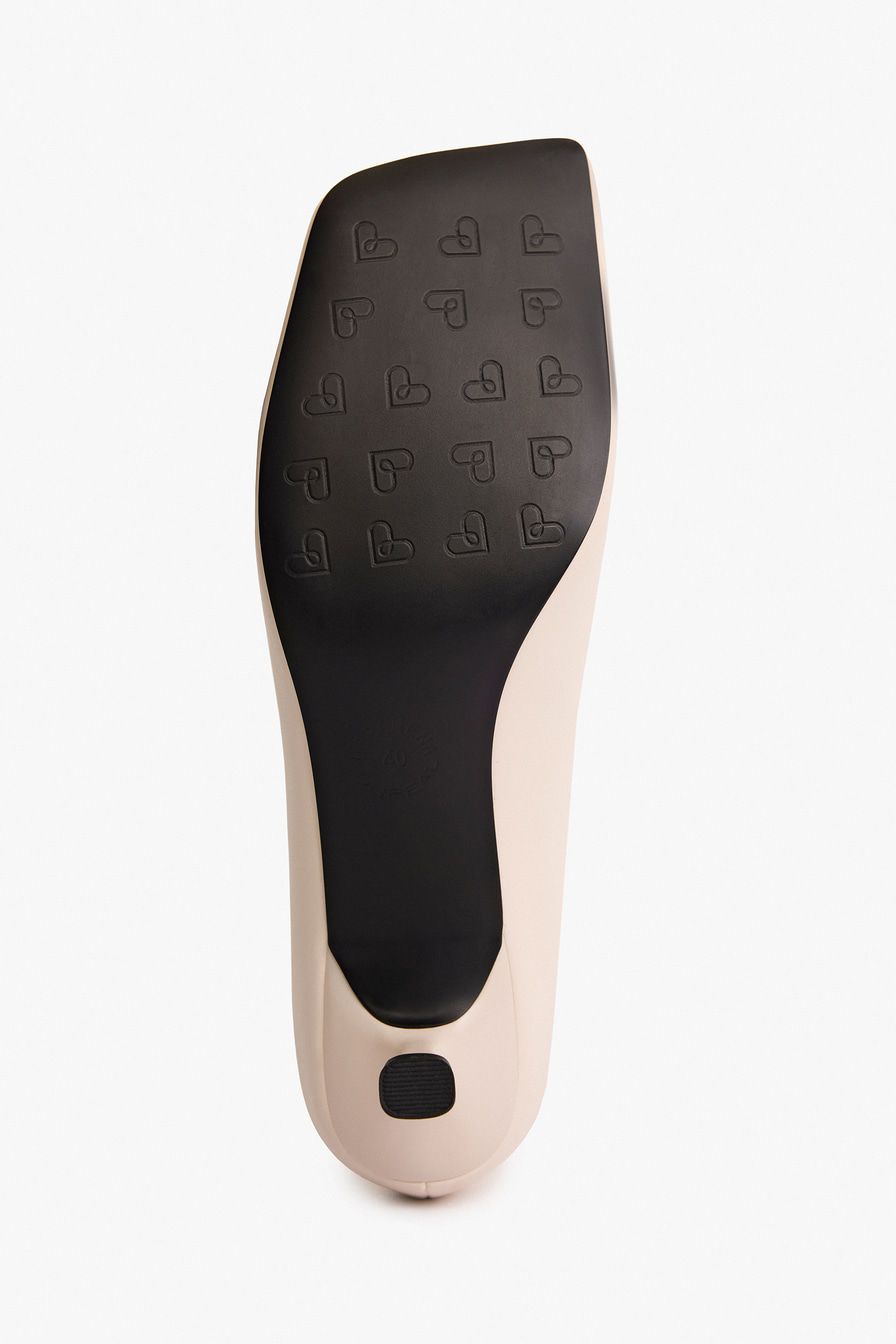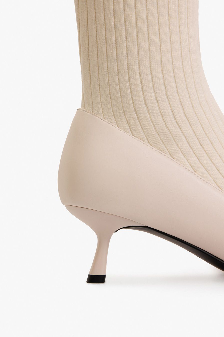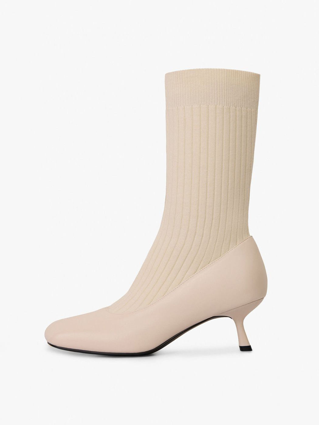 Полусапоги из экокожи и текстиля имитируют туфли в комплекте с носками в крупный рубчик. Модель молочного цвета дополнена квадратным мысом и высоким каблуком.