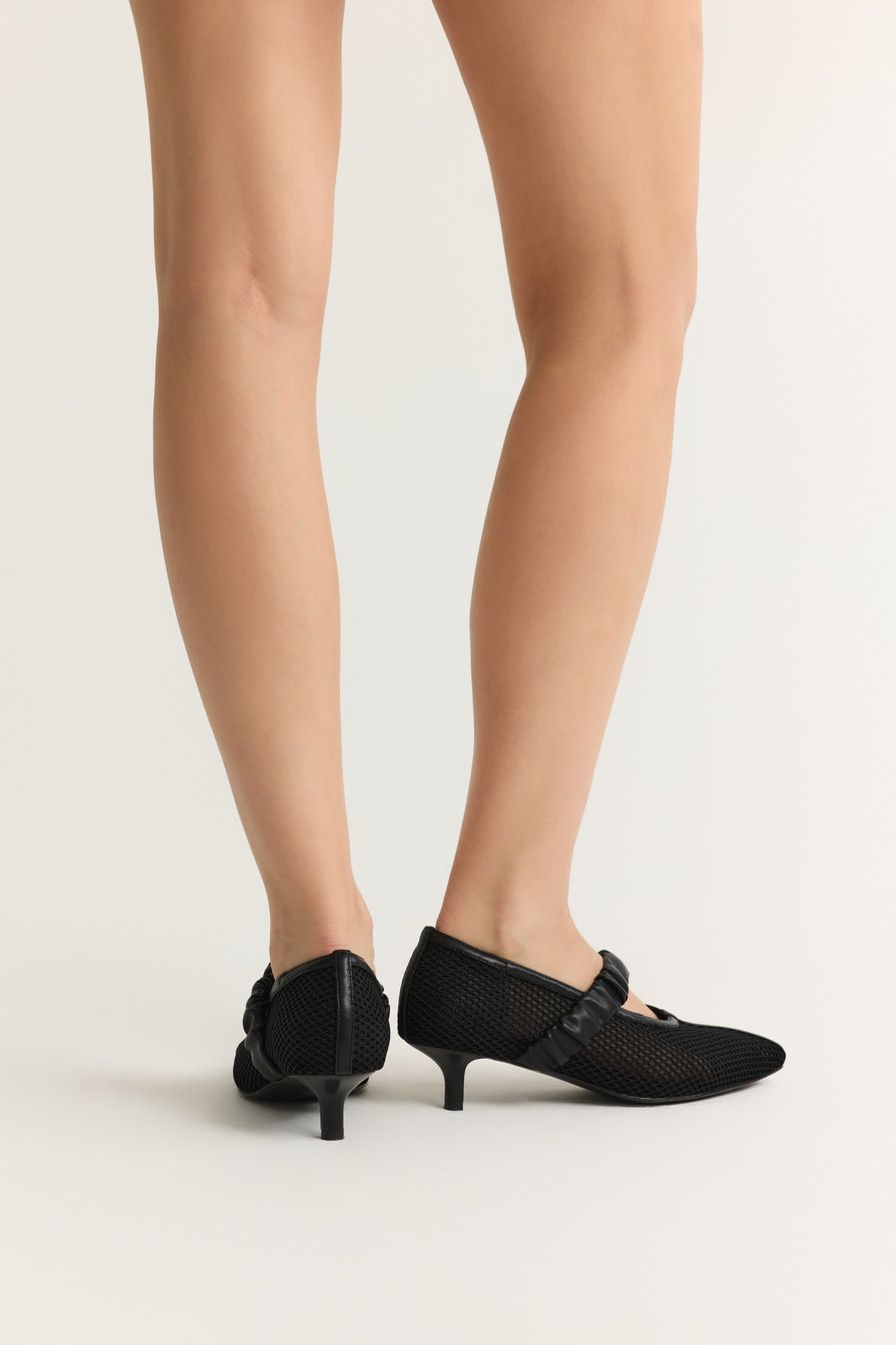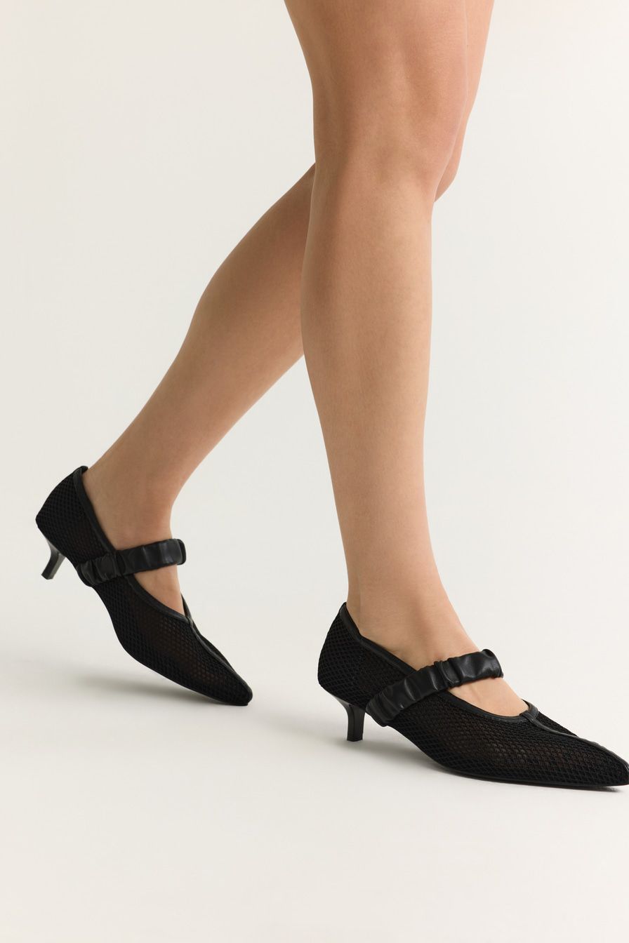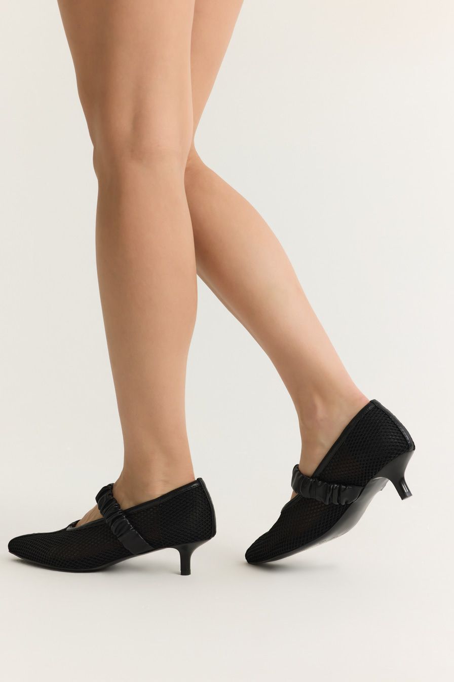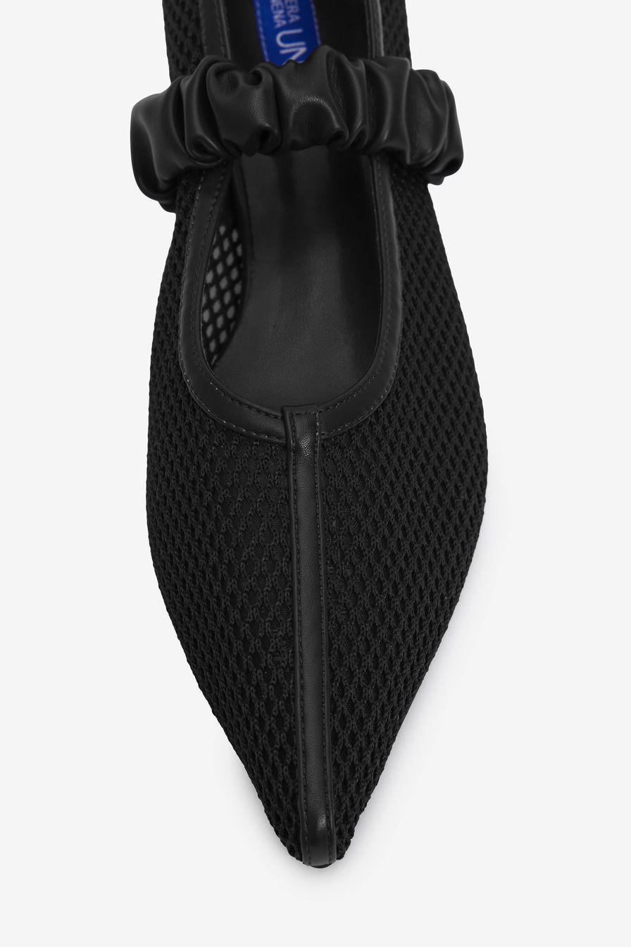 Черные туфли из сетки – модель с острым мысом на каблуке средней высоты. Туфли дополнены широкими ремешками из экокожи.