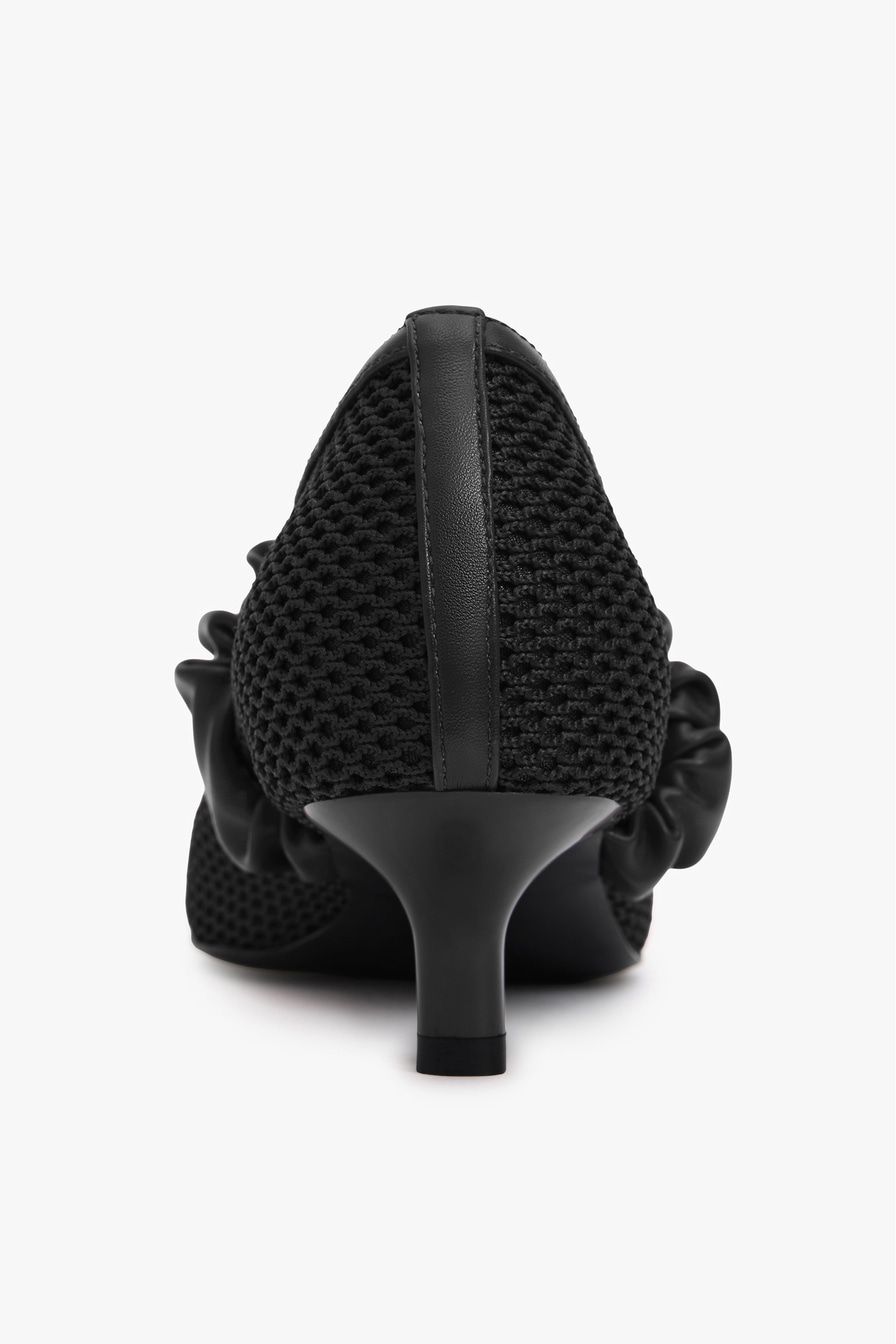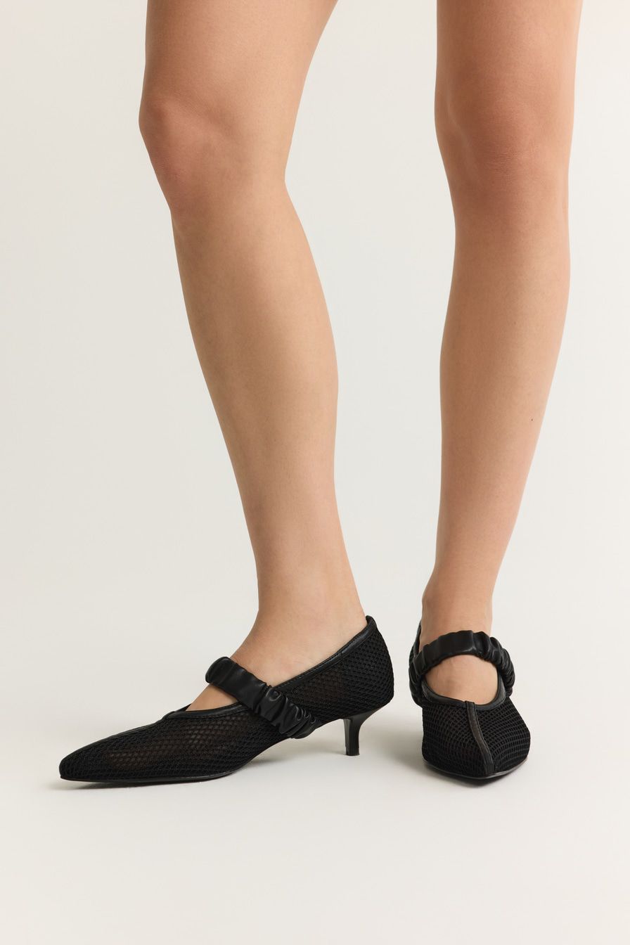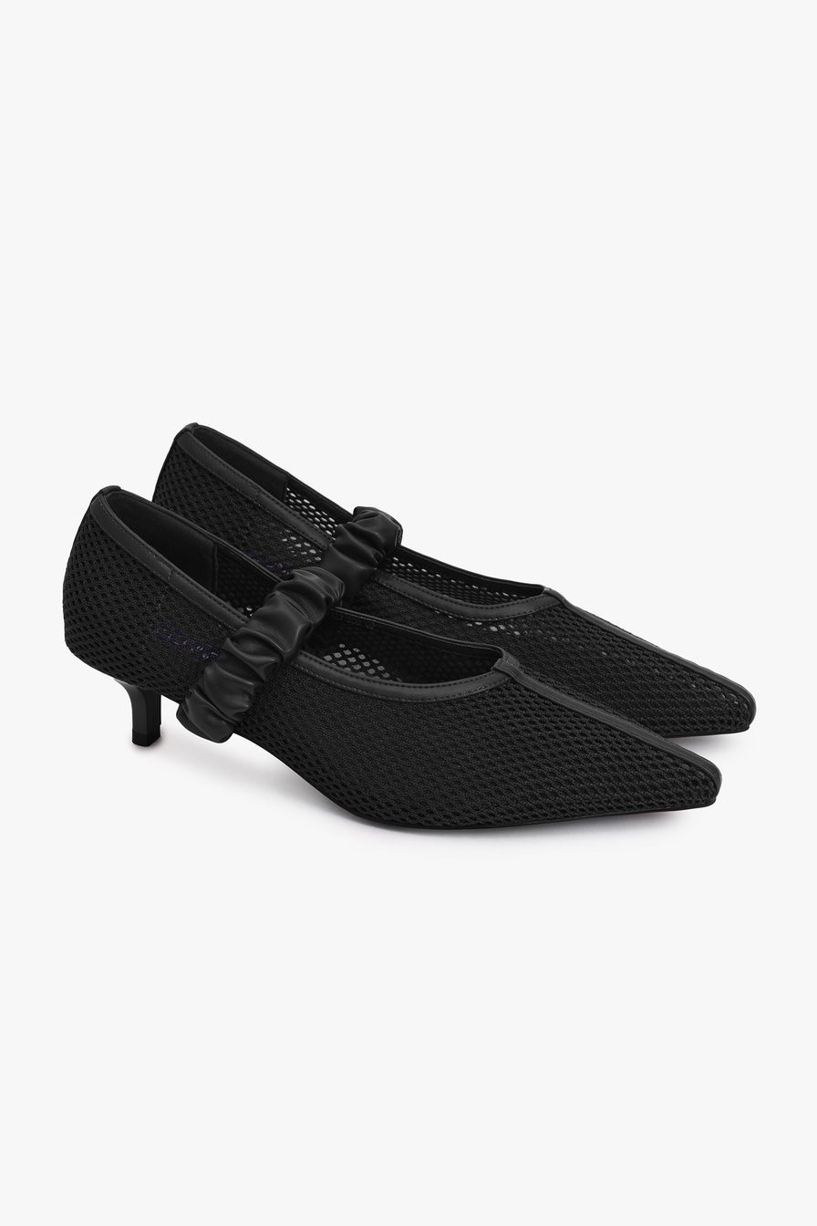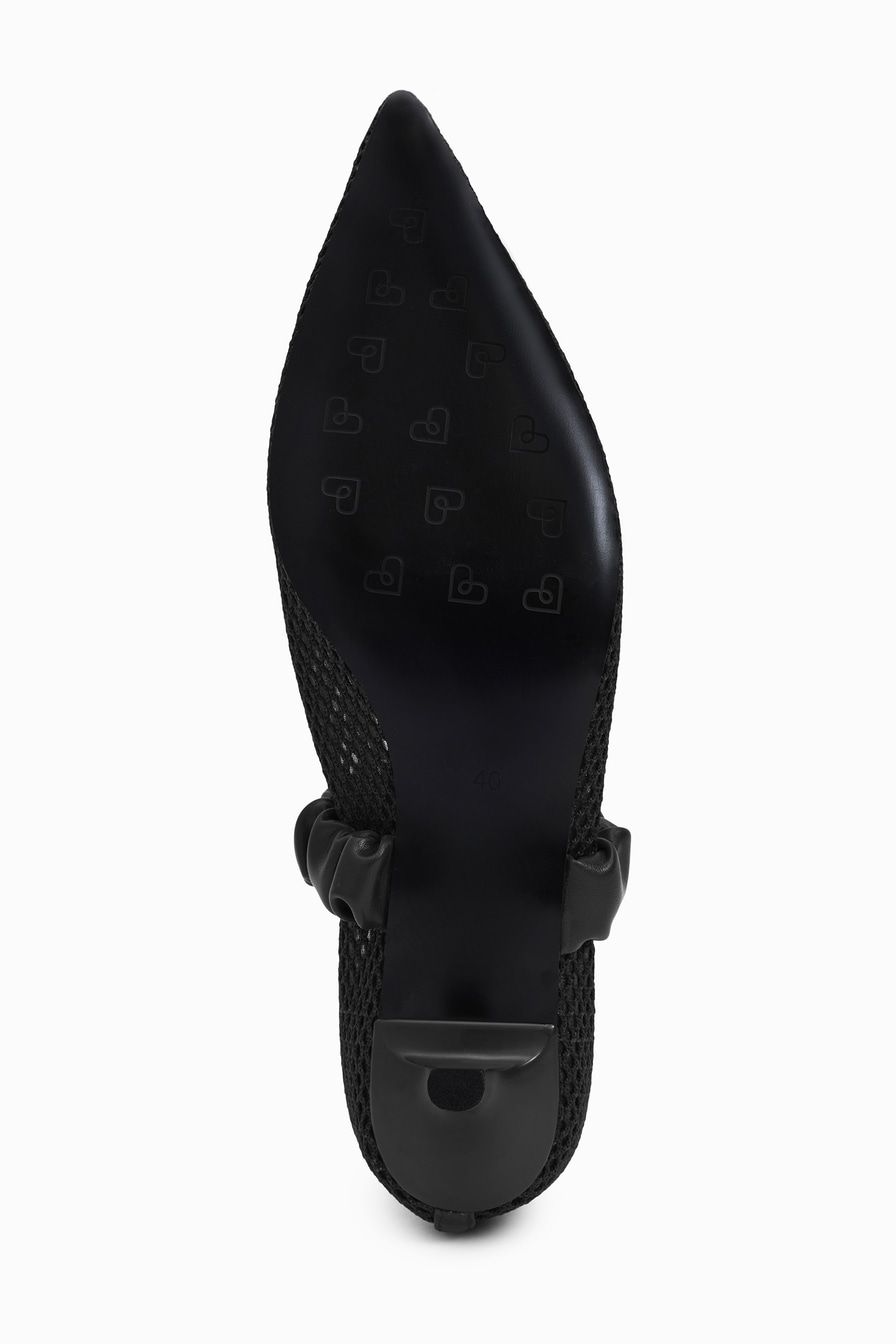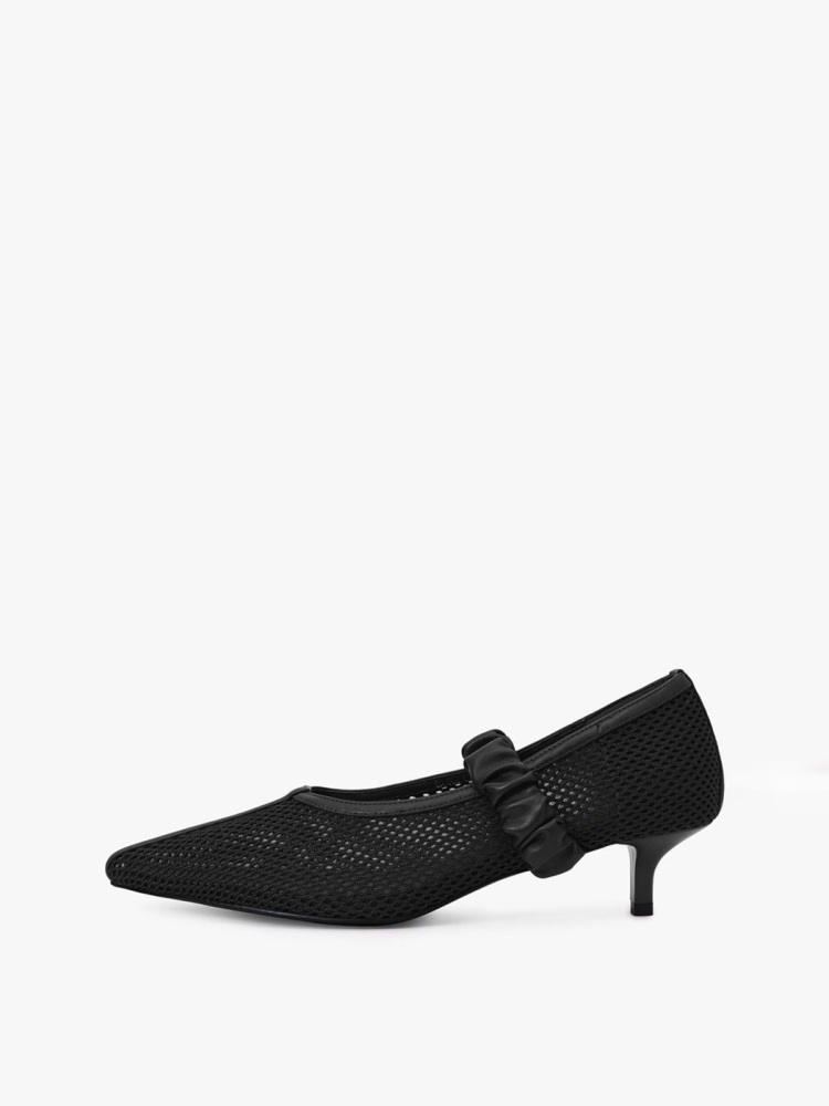 Черные туфли из сетки – модель с острым мысом на каблуке средней высоты. Туфли дополнены широкими ремешками из экокожи.