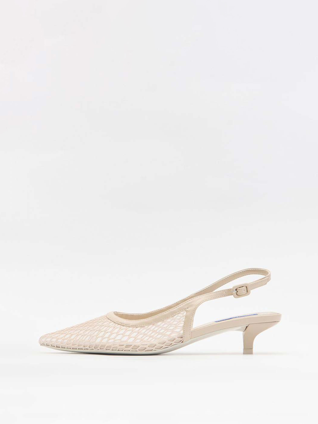 Молочные туфли-слингбэки из сетки – модель с острым мысом на каблуке kitten heel.