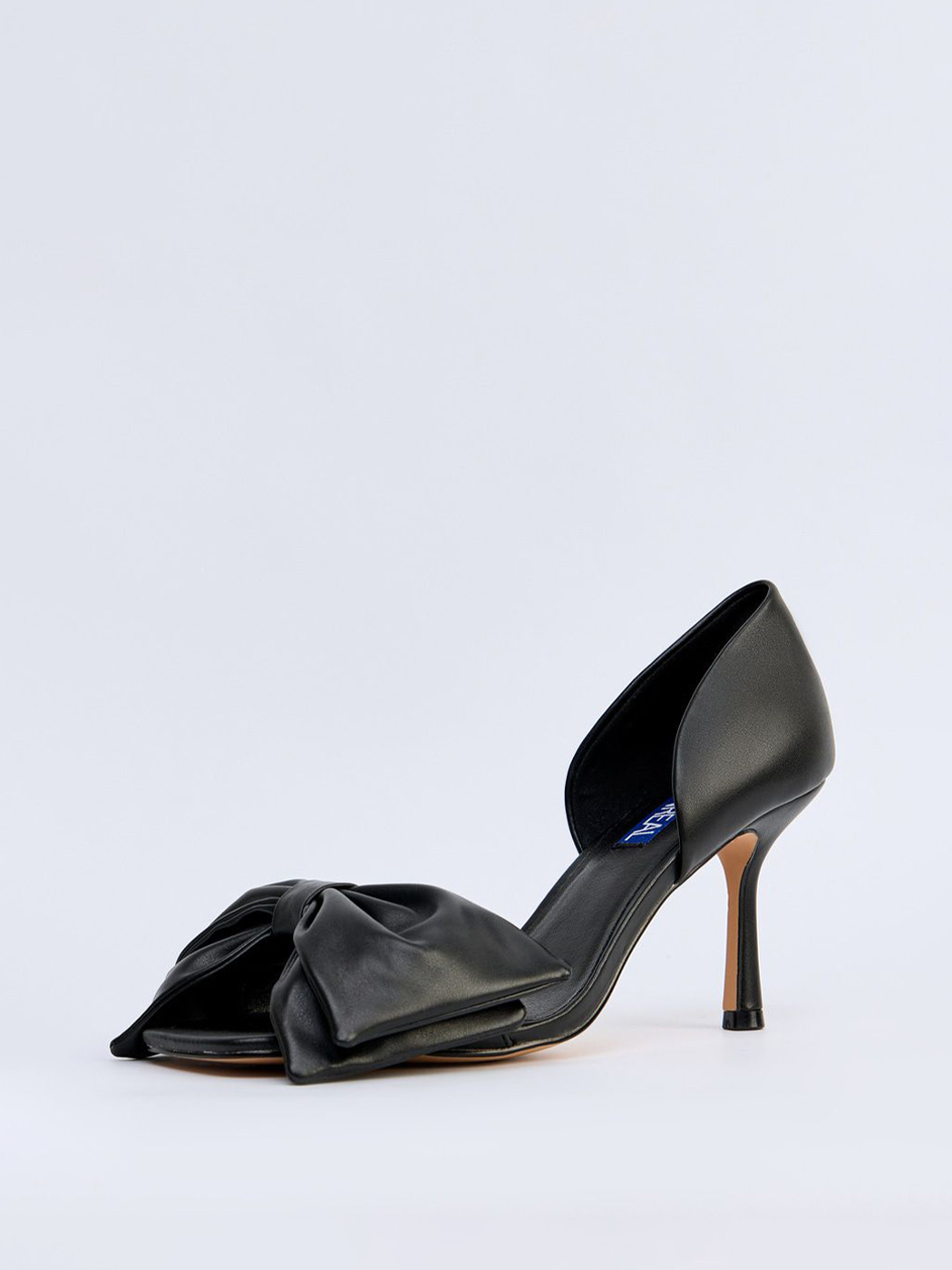 Черные туфли из экокожи – модель с открытым мысом на высоком каблуке. Туфли декорированы бантом.
