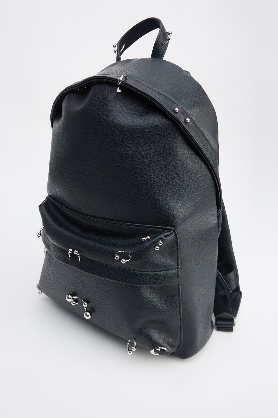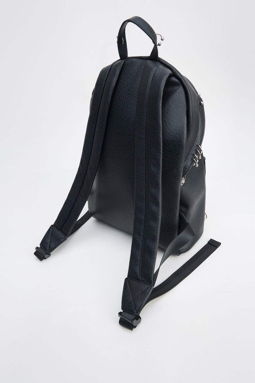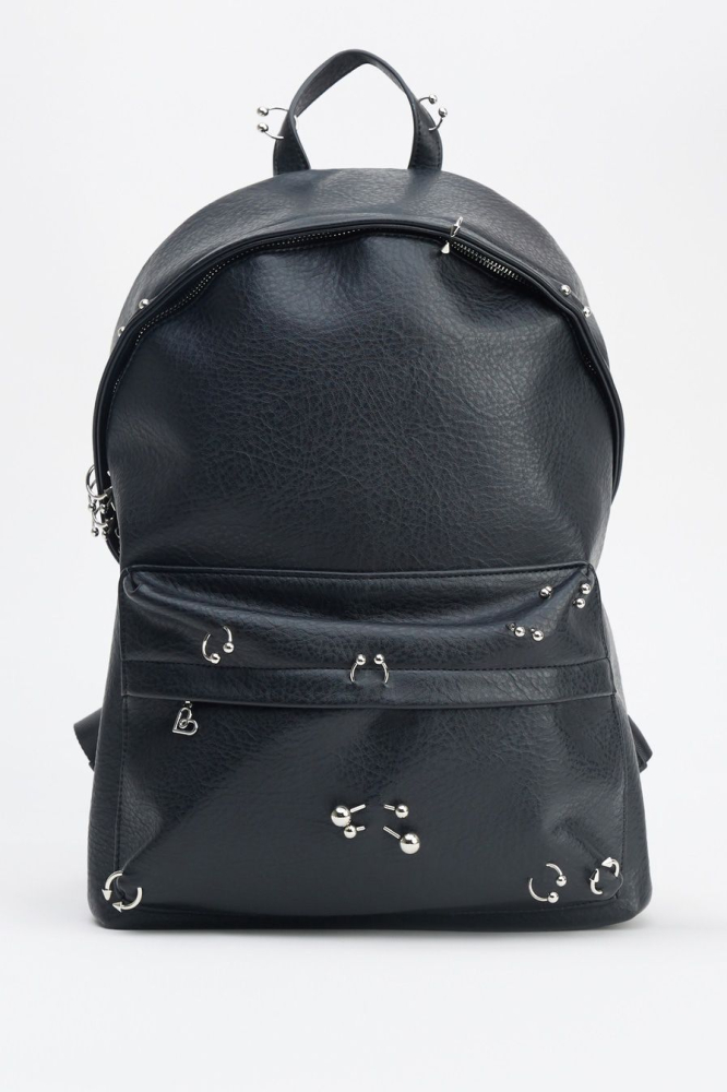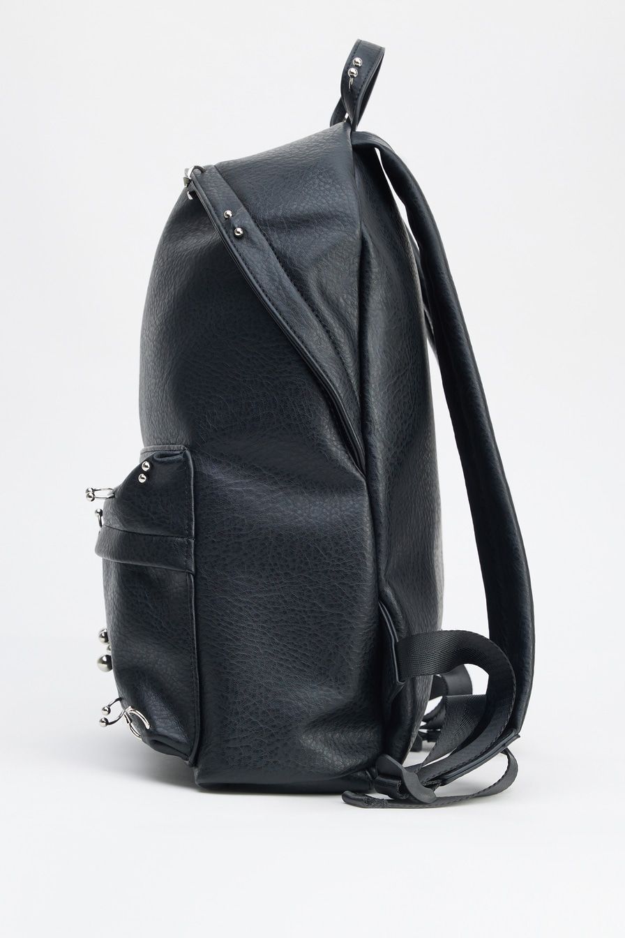 Рюкзак из фактурной экокожи – модель черного цвета. Рюкзак с одним основным отделением и дополнительным внешним карманом на молнии декорирован металлическими элементами: серьгами для пирсинга.