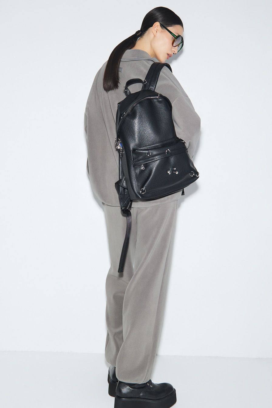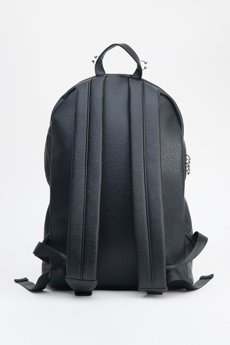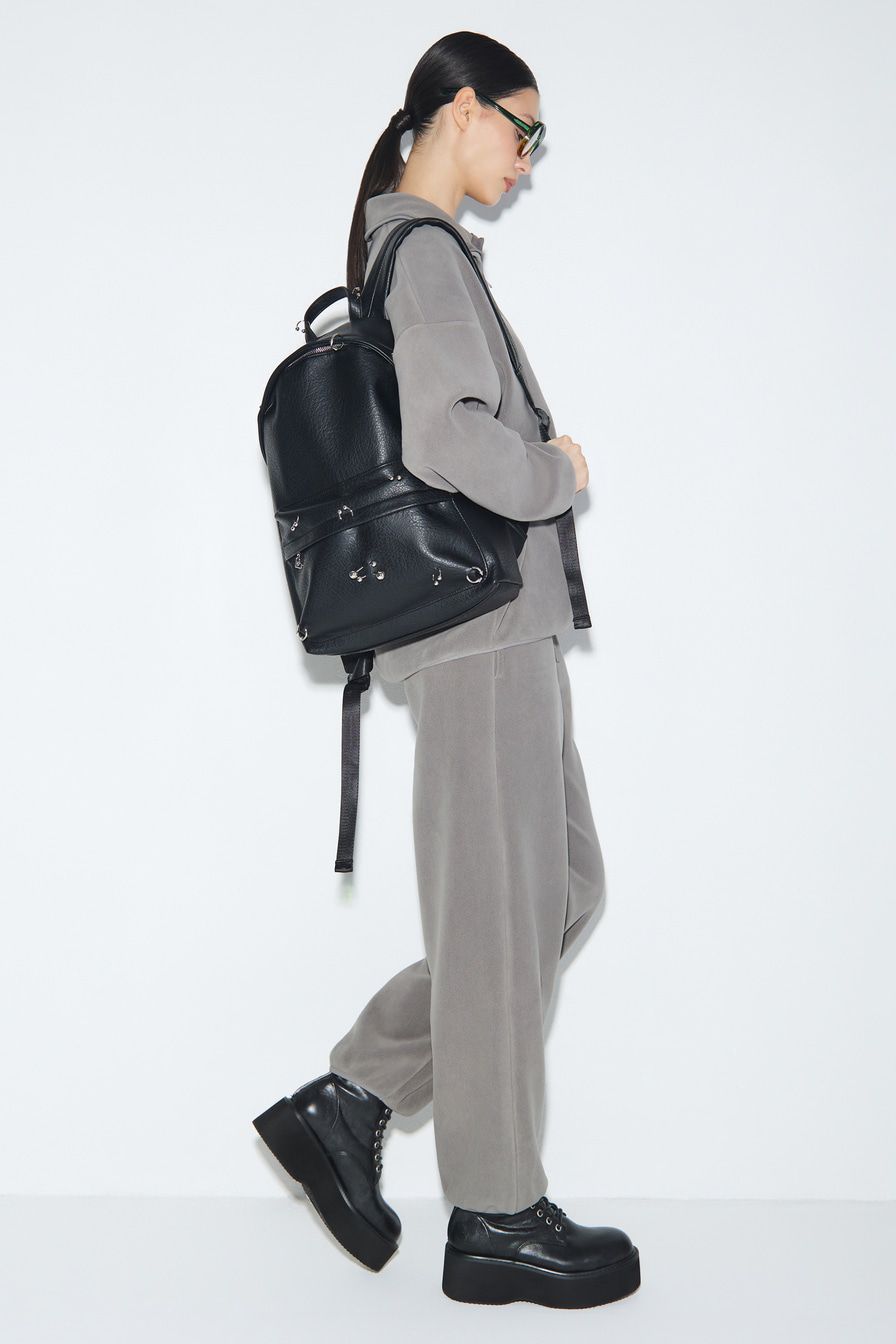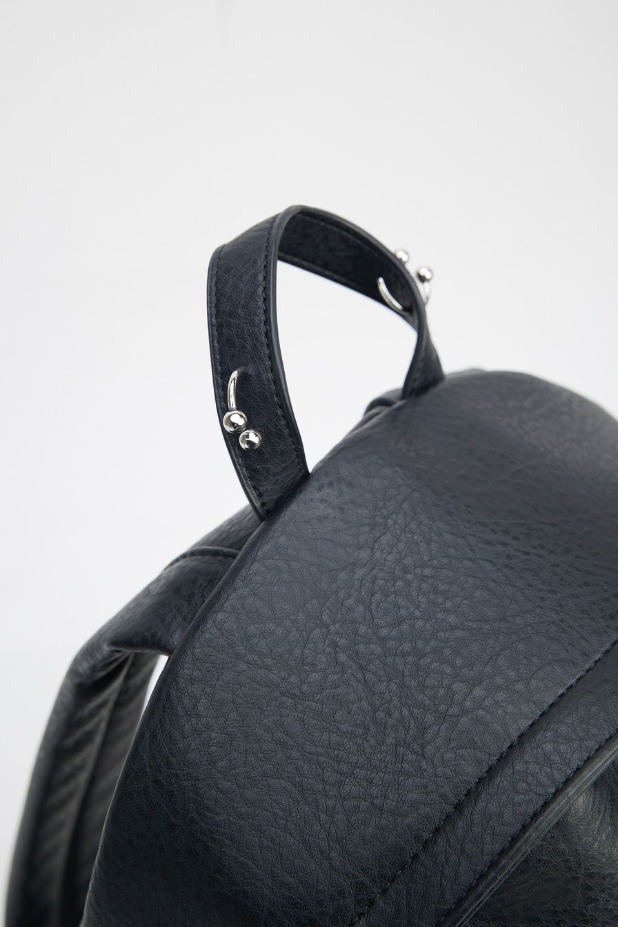 Рюкзак из фактурной экокожи – модель черного цвета. Рюкзак с одним основным отделением и дополнительным внешним карманом на молнии декорирован металлическими элементами: серьгами для пирсинга.
