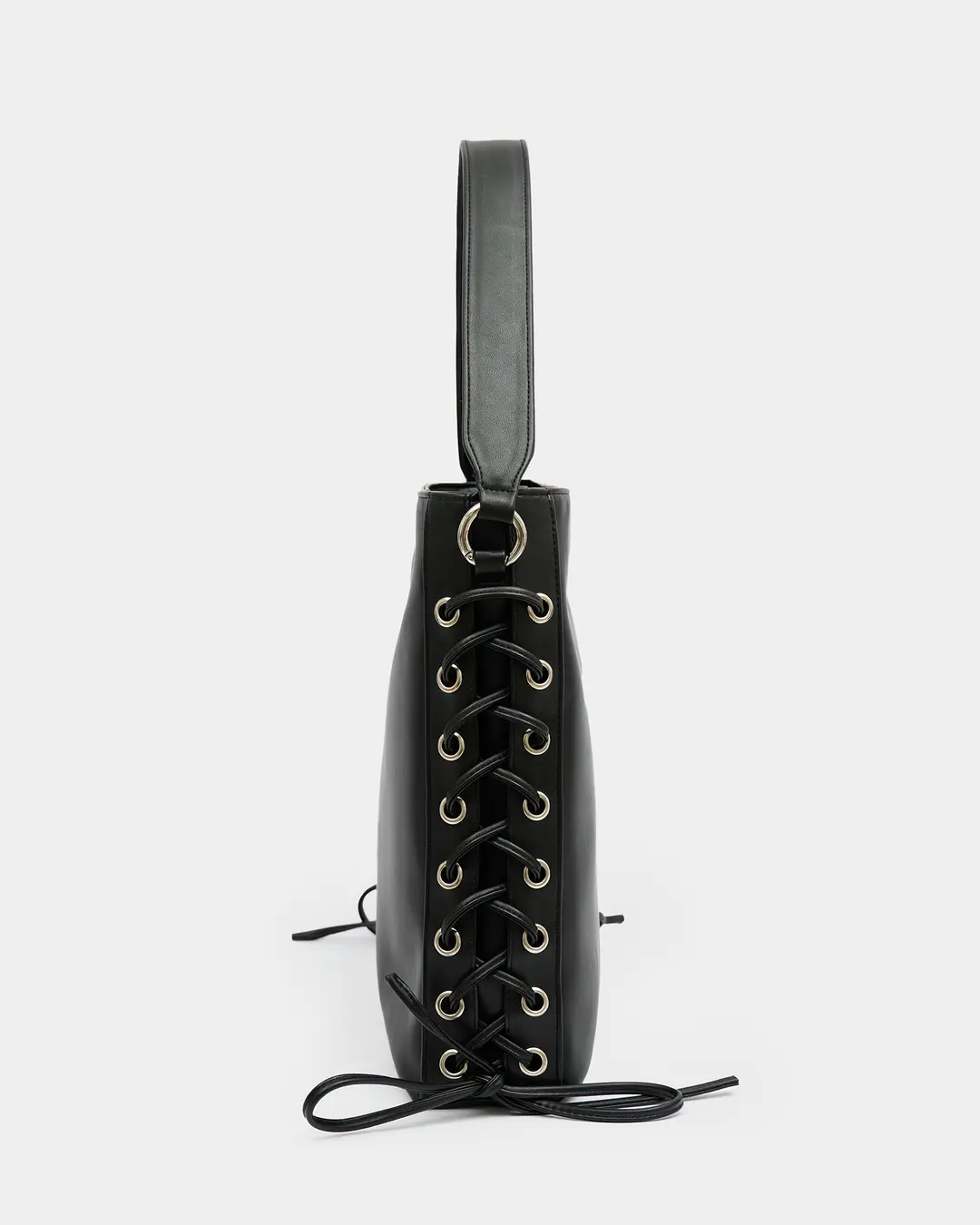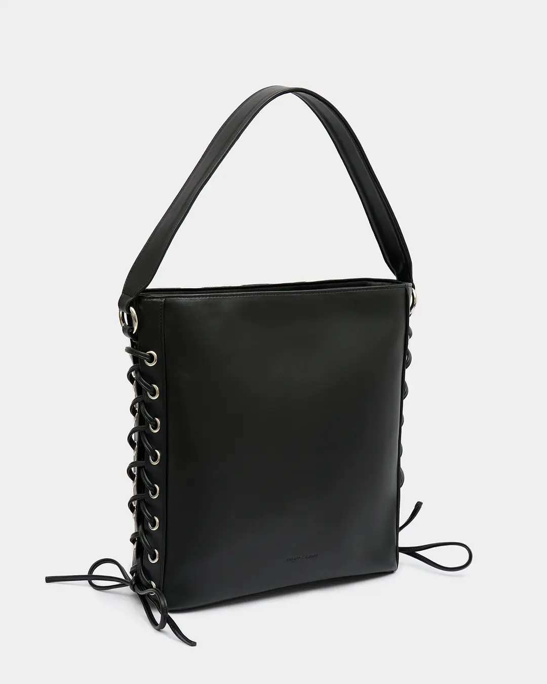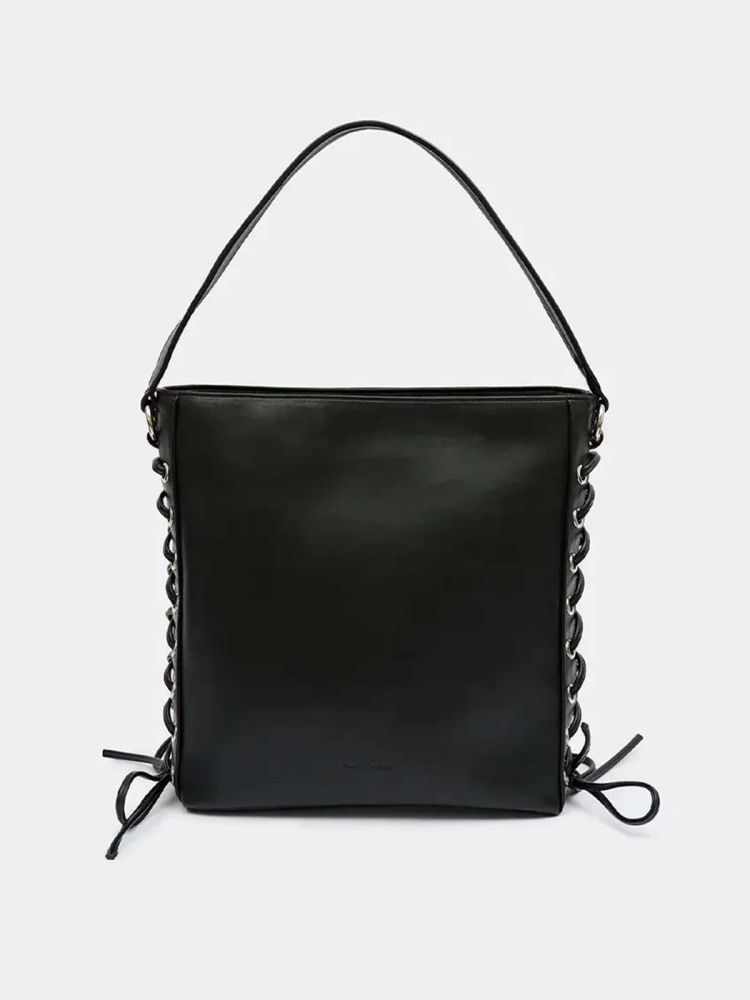Прямоугольный шопер с декоративной шнуровкой по бокам в черном цвете.
