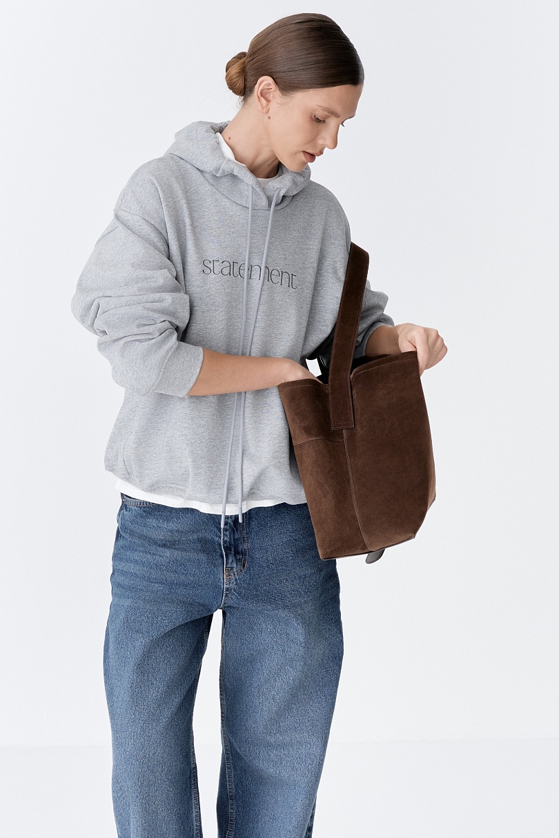 Просторная и стильная сумка-шоппер из натуральной замши с мягкой бархатистой фактурой. Универсальный дизайн делает её идеальным выбором для города, работы или шопинга: она легко вмещает всё необходимое, сохраняя при этом изысканный внешний вид.