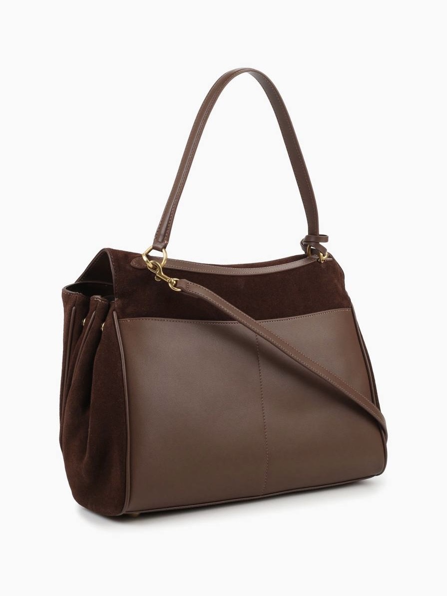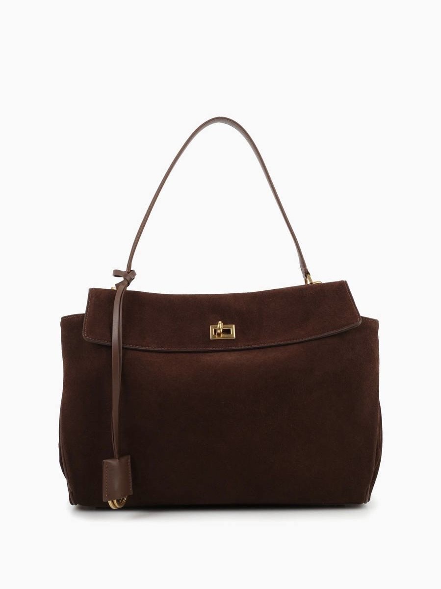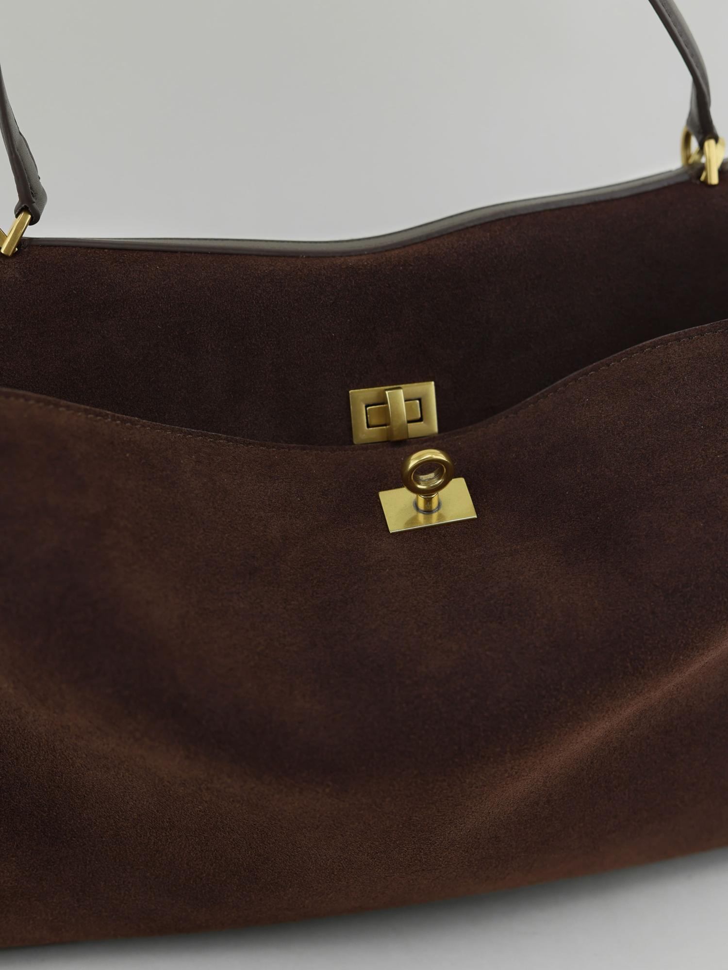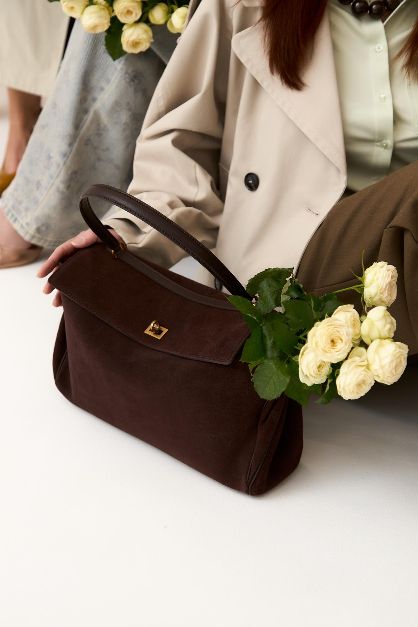 Сумка выполнена из натуральной замши, закрывается перекидным клапаном на фурнитуру. Внутри два отделения, сбоку отделение на молнии. Поместятся документы формата А4. Снаружи сзади два кармана. Сумочка носится на плече, на сгибе руки или в руке. Прилагается длинный ремешок на плечо, длина 116 см (регулируется).