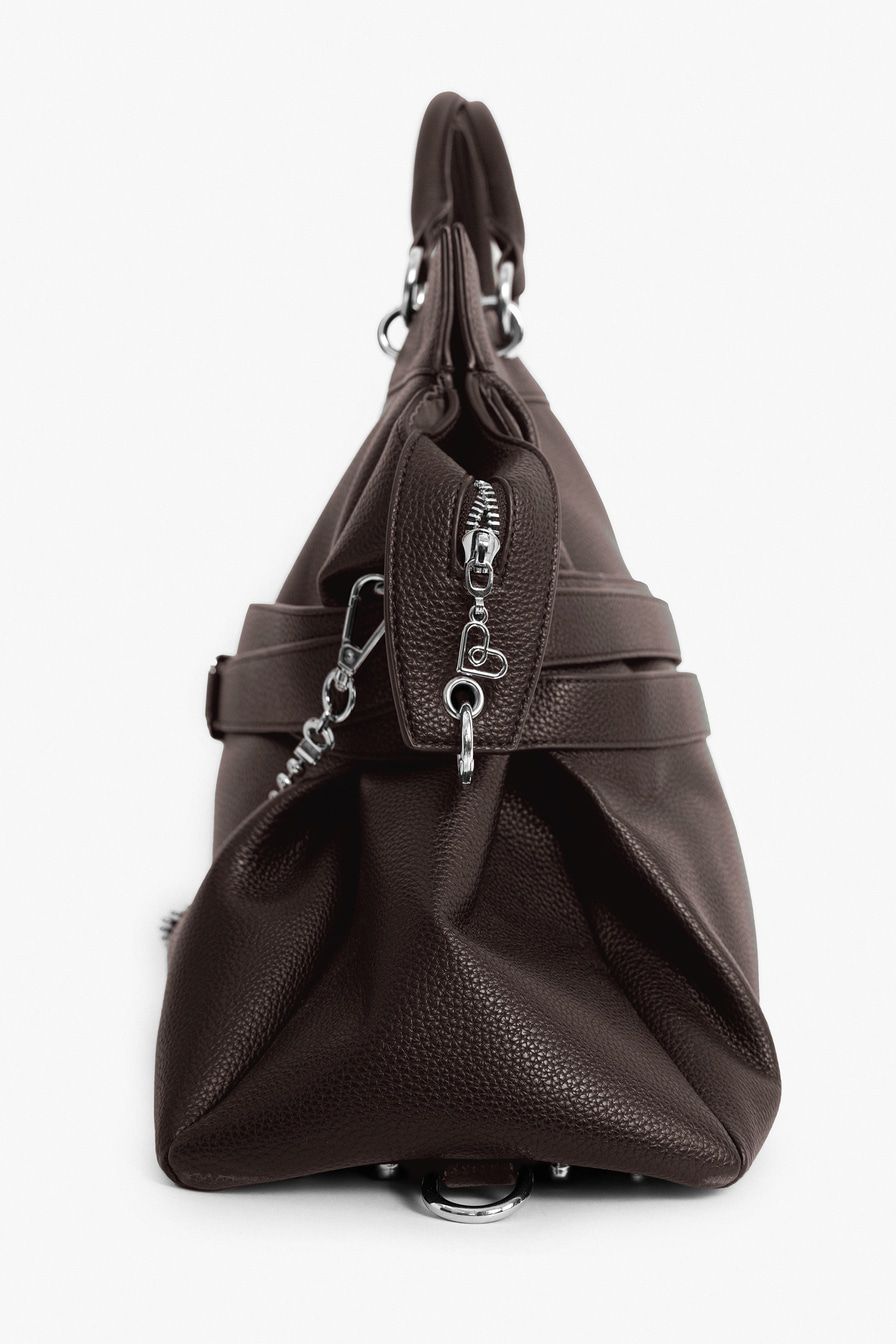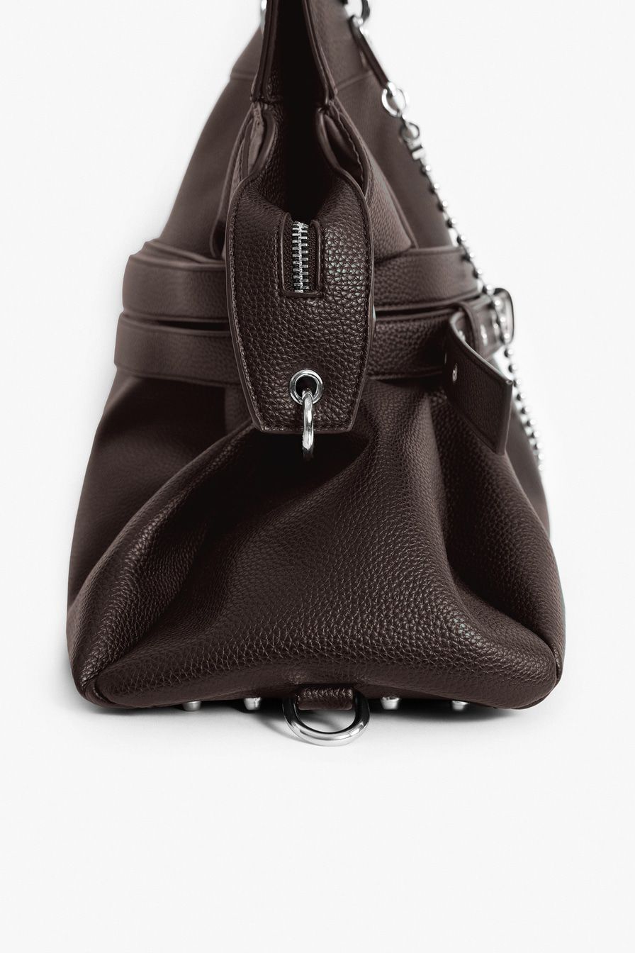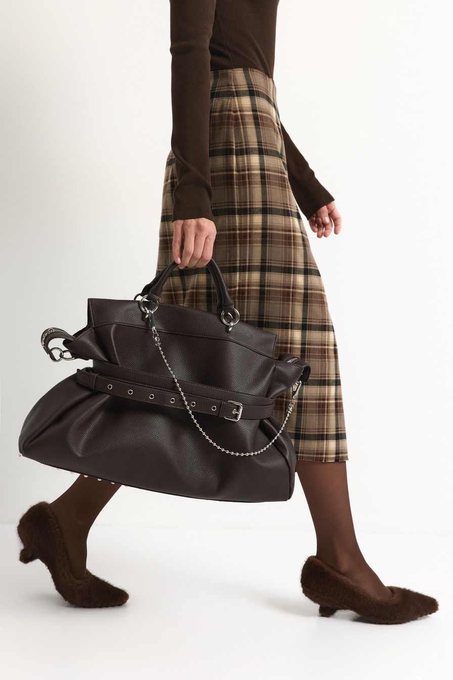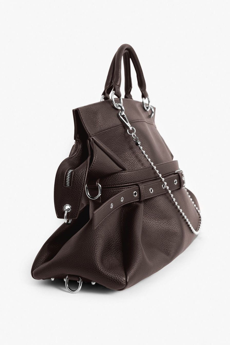 Объемная коричневая сумка из экокожи – модель с короткими ручками и съемным плечевым ремнем. Сумка дополнена декоративными ремешками, цепочкой и металлическими шипами на дне.