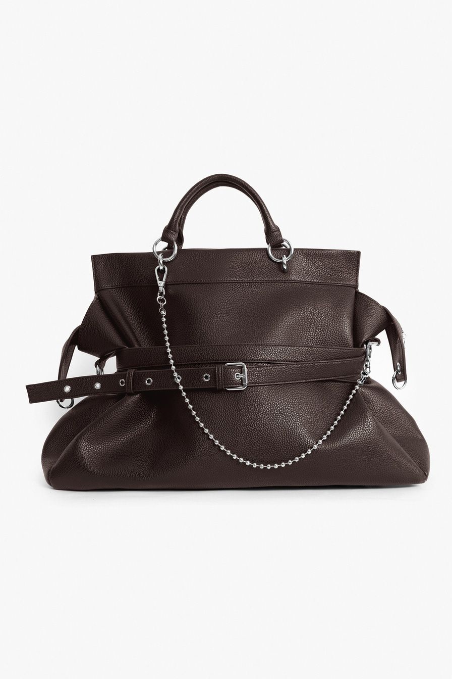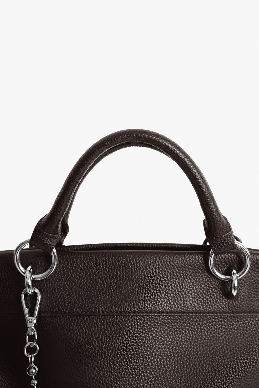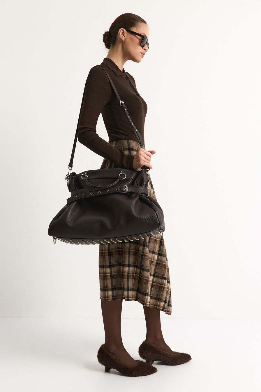 Объемная коричневая сумка из экокожи – модель с короткими ручками и съемным плечевым ремнем. Сумка дополнена декоративными ремешками, цепочкой и металлическими шипами на дне.