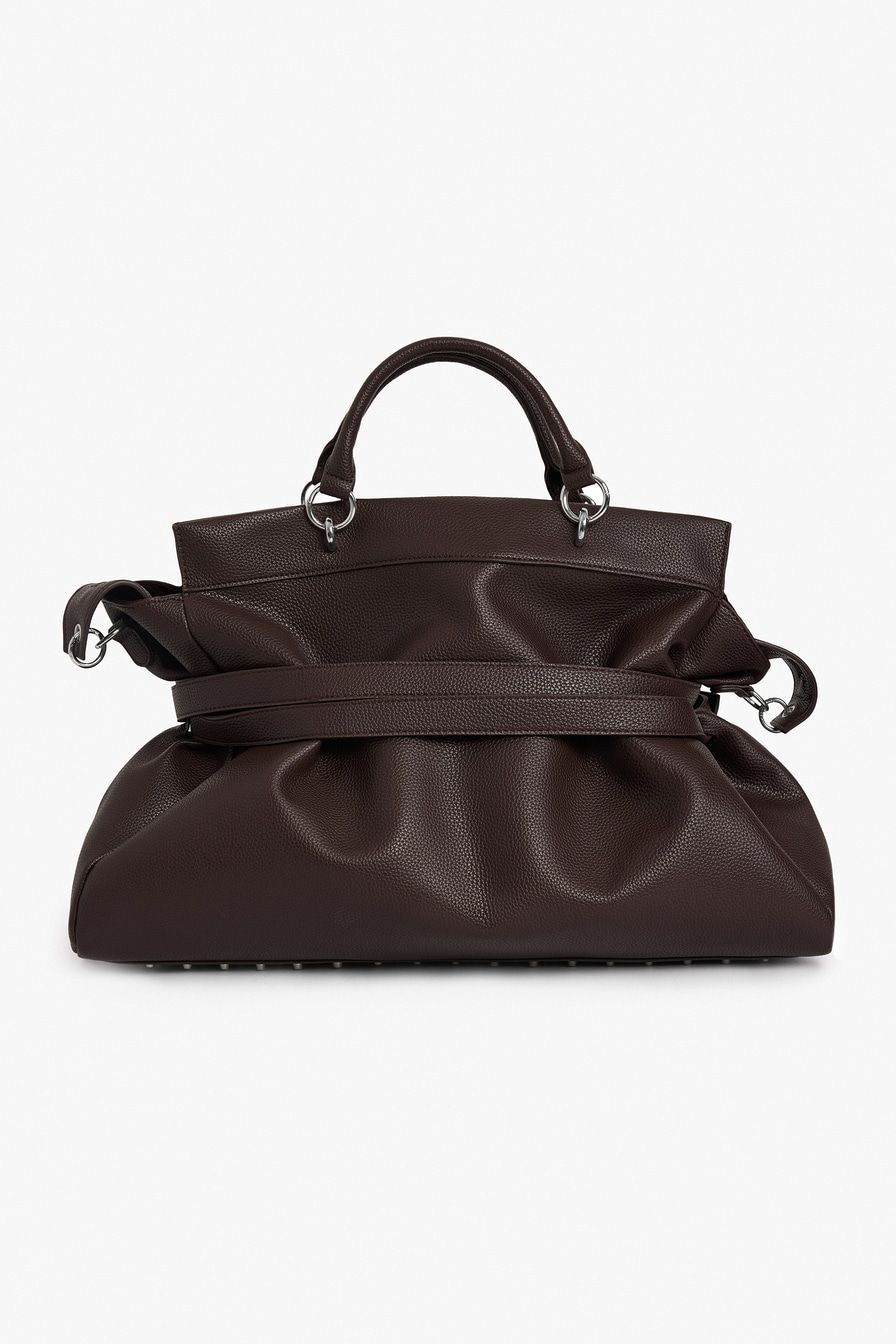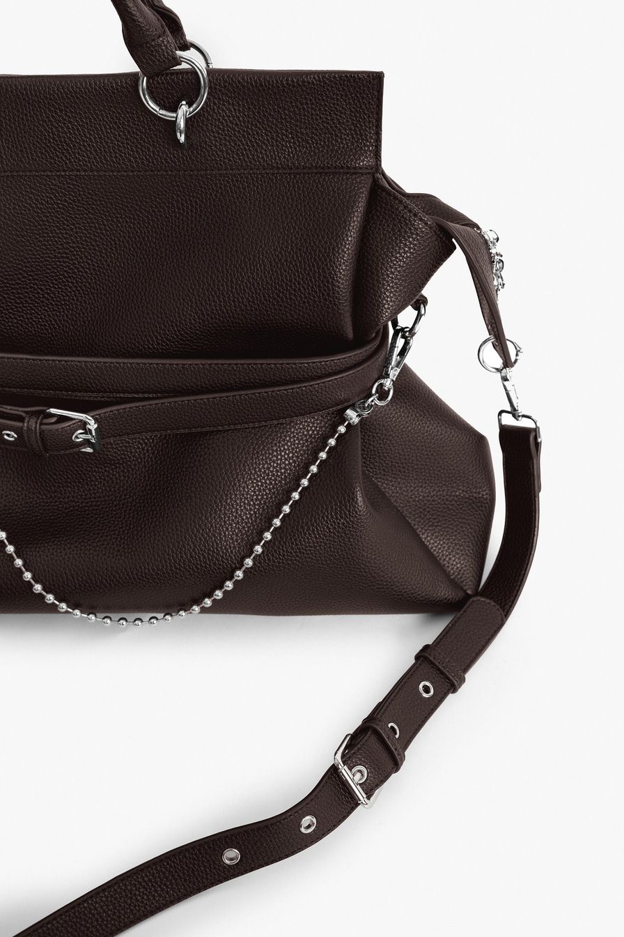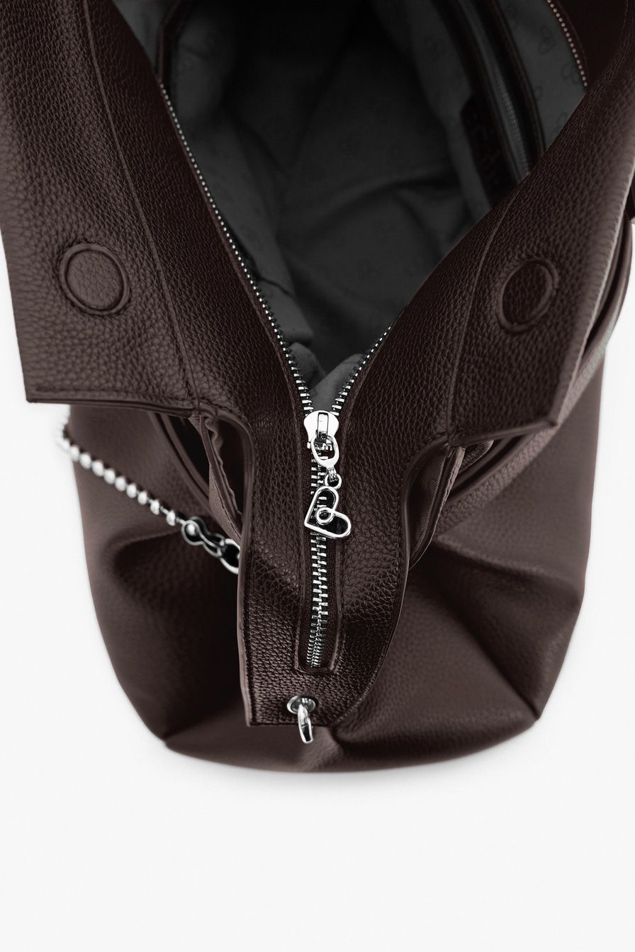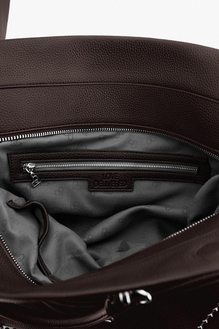 Объемная коричневая сумка из экокожи – модель с короткими ручками и съемным плечевым ремнем. Сумка дополнена декоративными ремешками, цепочкой и металлическими шипами на дне.