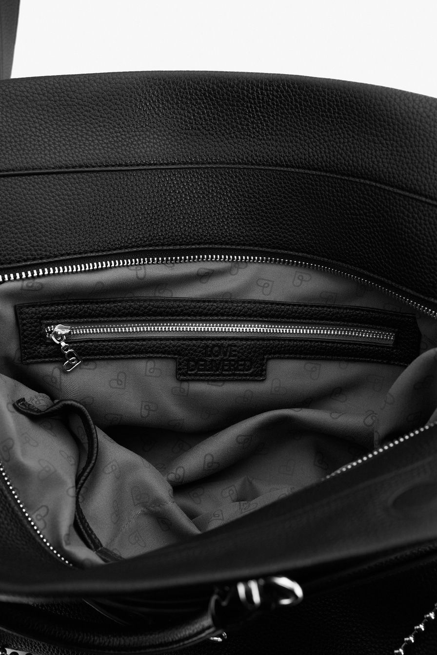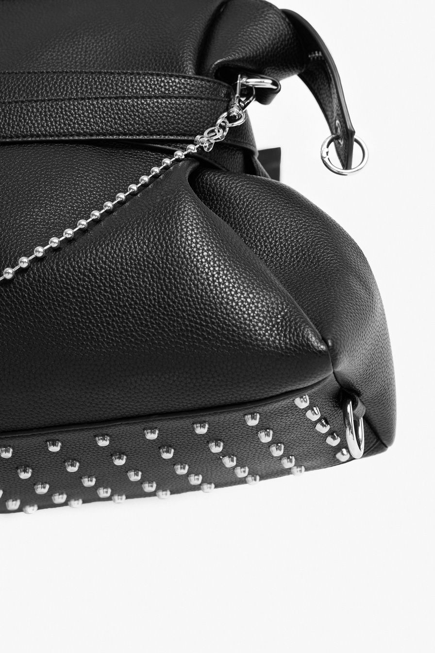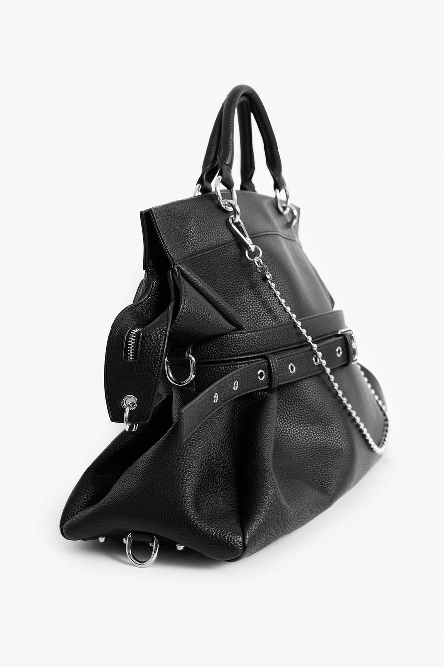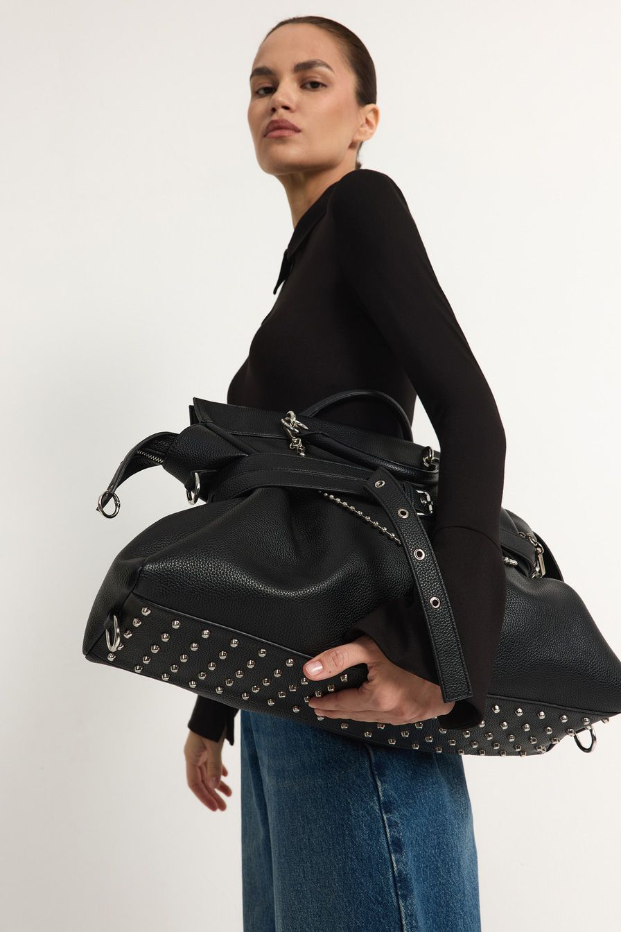 Объемная черная сумка из экокожи – модель с короткими ручками и съемным плечевым ремнем. Сумка дополнена декоративными ремешками, цепочкой и металлическими шипами на дне.