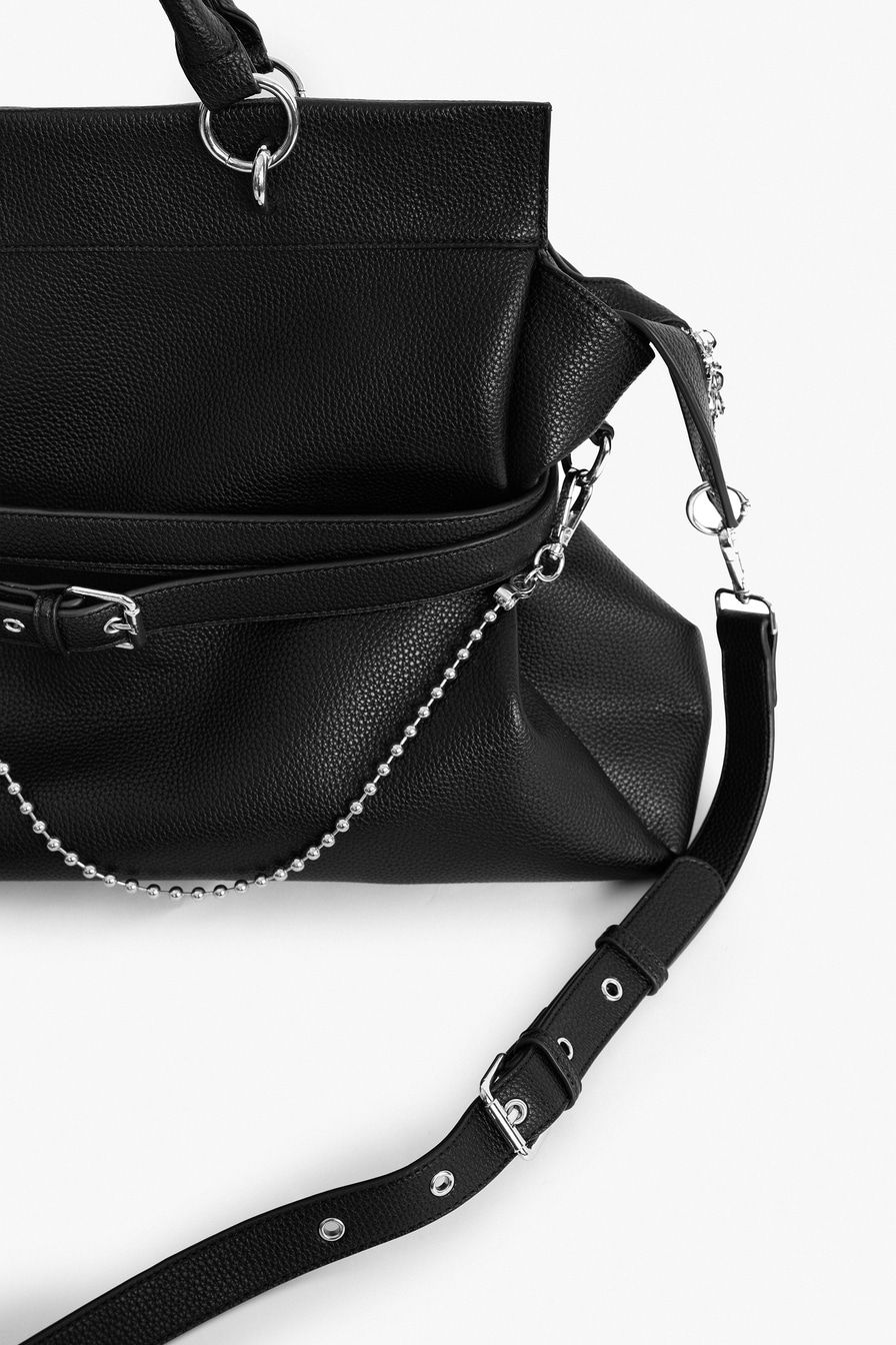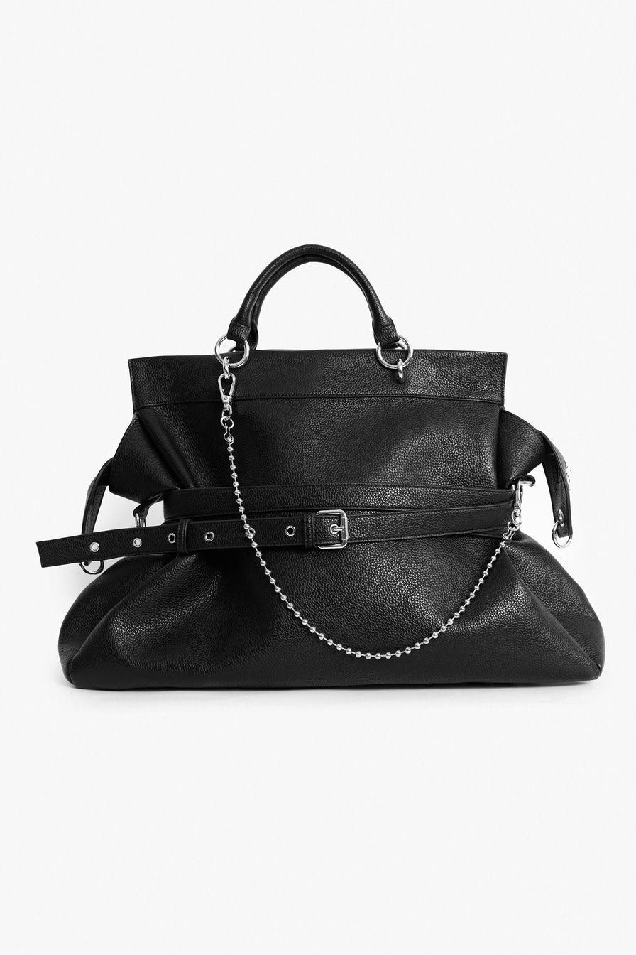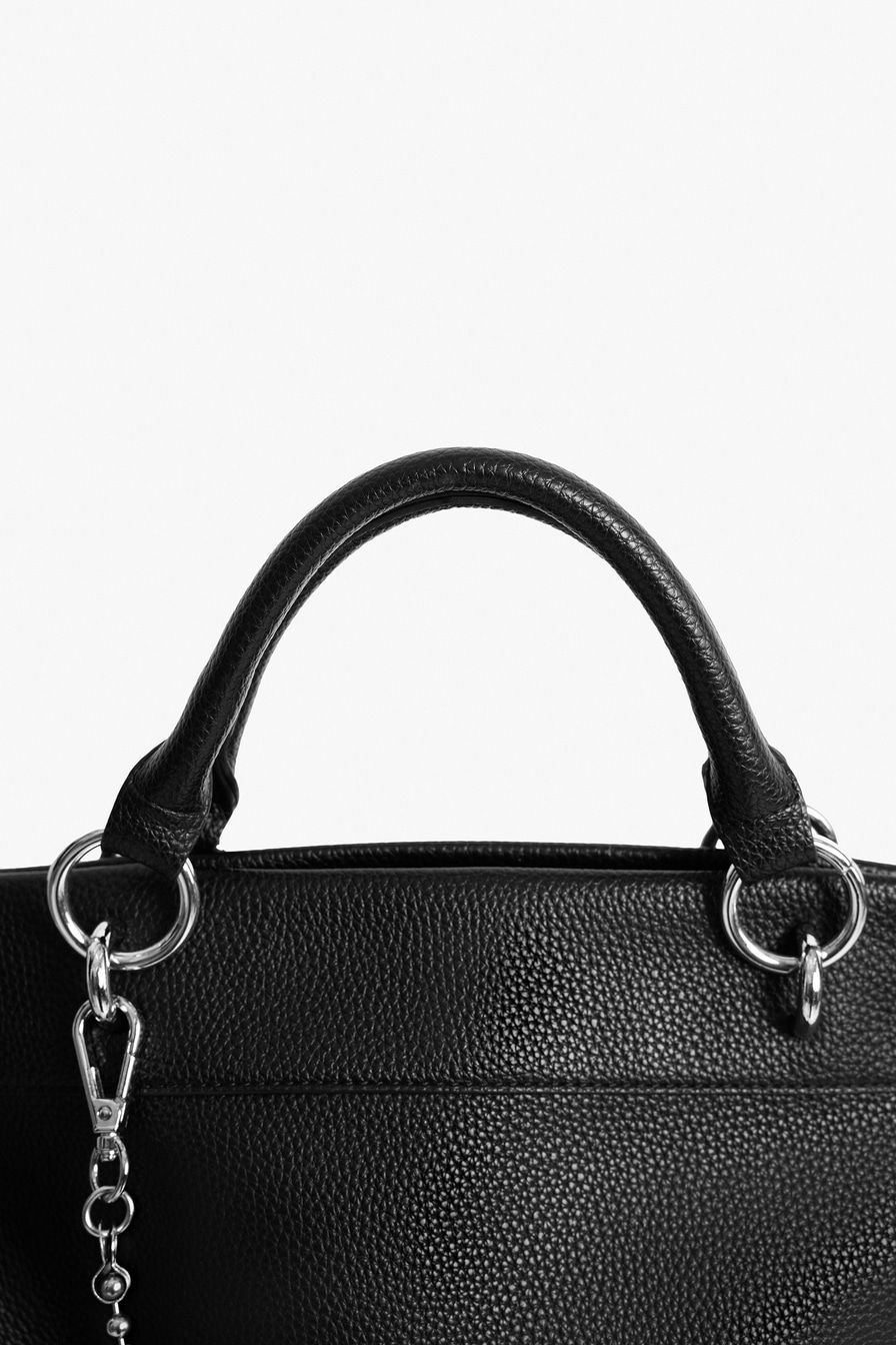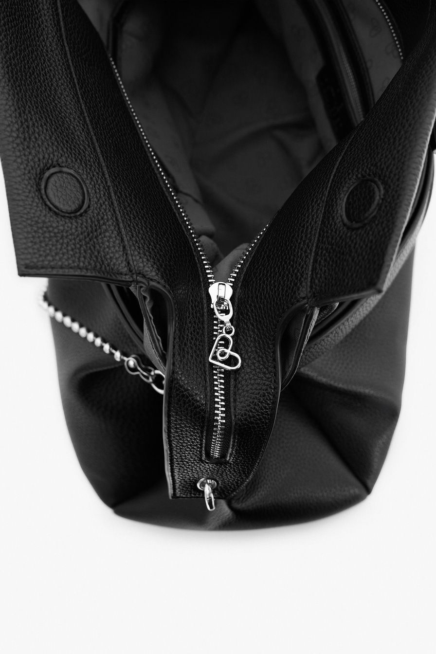 Объемная черная сумка из экокожи – модель с короткими ручками и съемным плечевым ремнем. Сумка дополнена декоративными ремешками, цепочкой и металлическими шипами на дне.