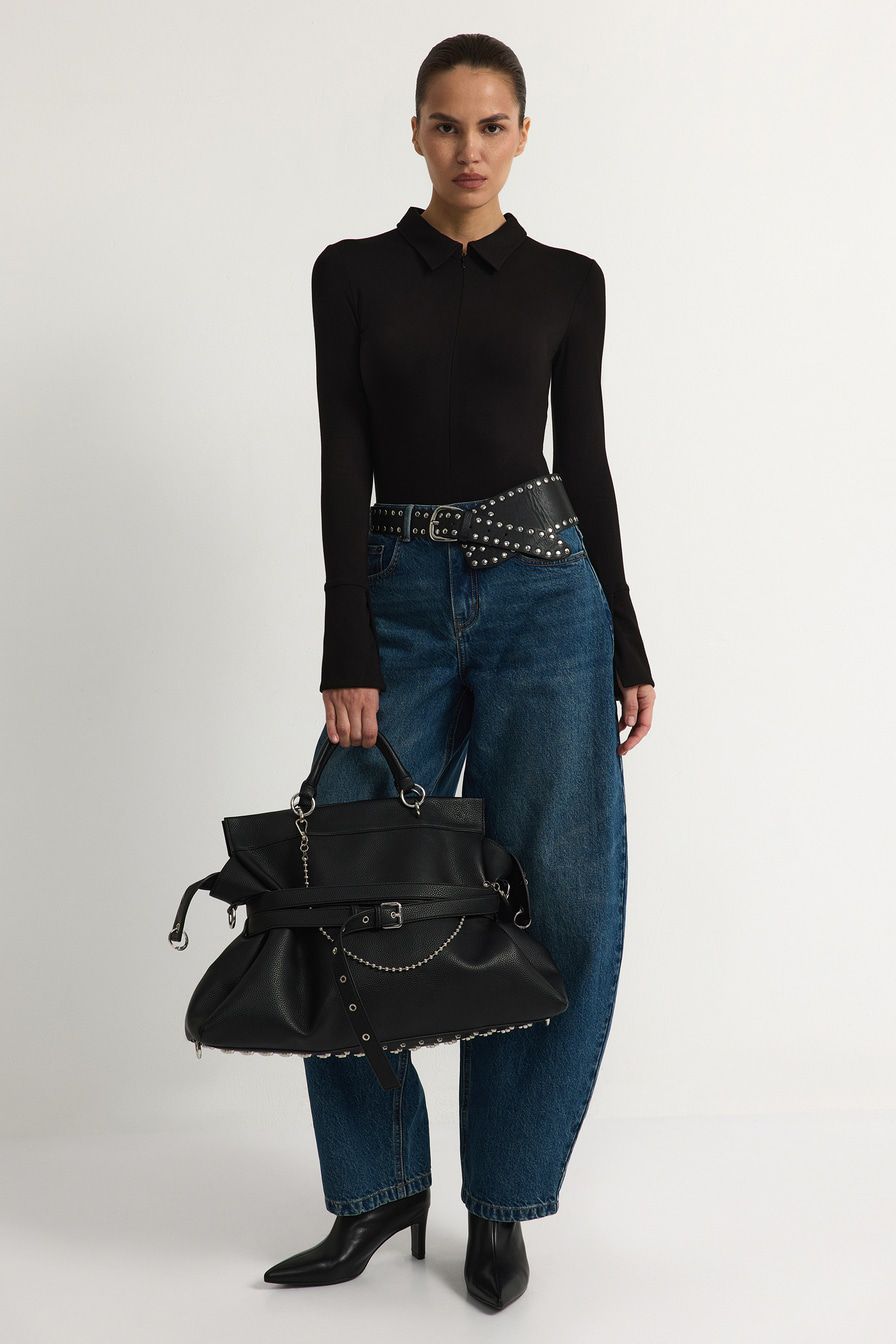 «Для повседневного лука сочетайте сумку с джинсами-бананами, водолазкой, объемным кожаным бомбером и ботильонами с широким голенищем».